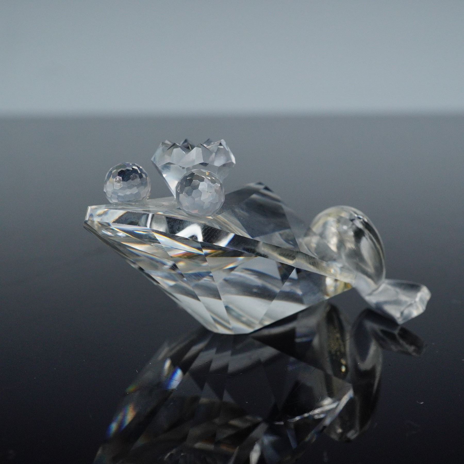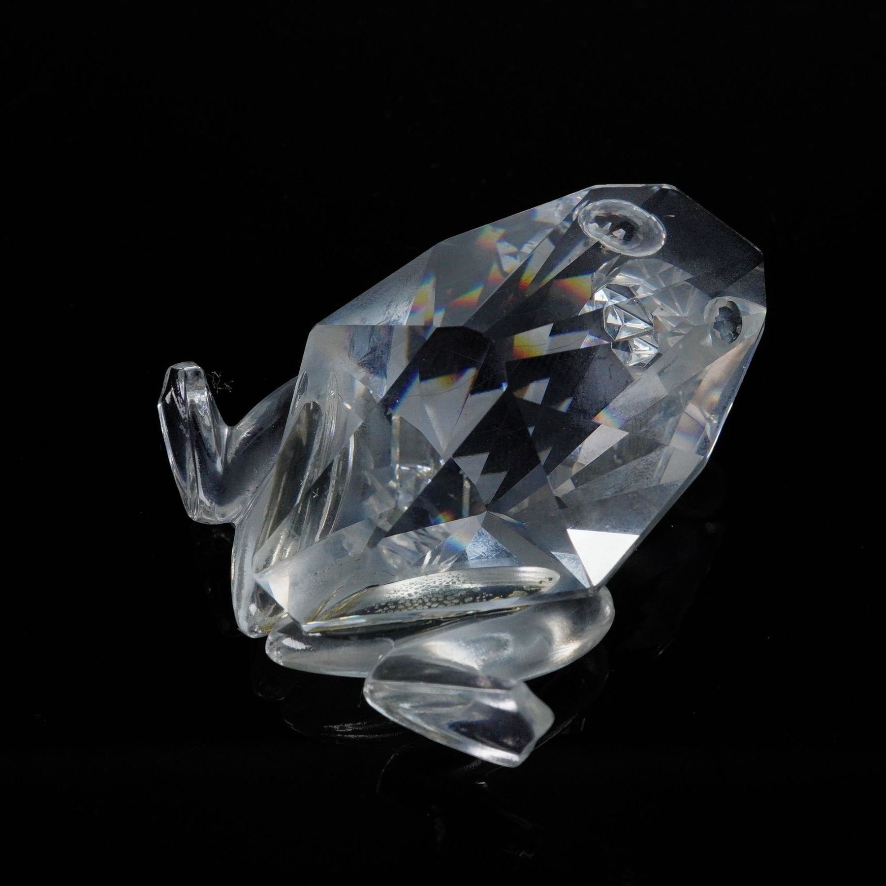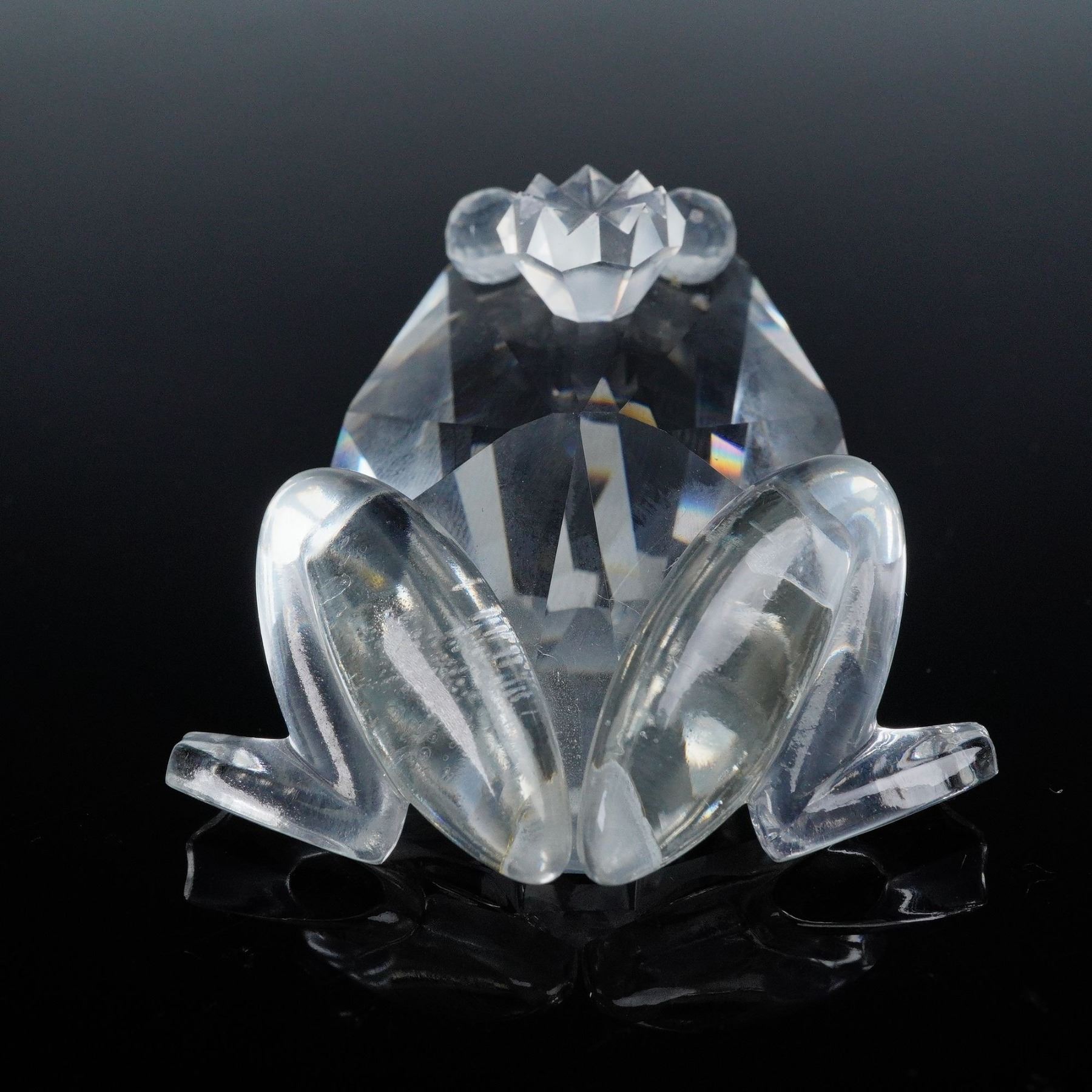 Swarovski crystal figurine of the Frog Prince, beautifully crafted from clear faceted crystal with smooth frosted crystal legs and a finely detailed crown. The figurine features striking clear faceted eyes that shimmer with light, giving the piece a lifelike and expressive quality. A graceful and enchanting design that reflects Swarovski artistry at its best. Swarovski backstamp. This item has its original box. Box measures: 3.75"H x 3.25" dia.