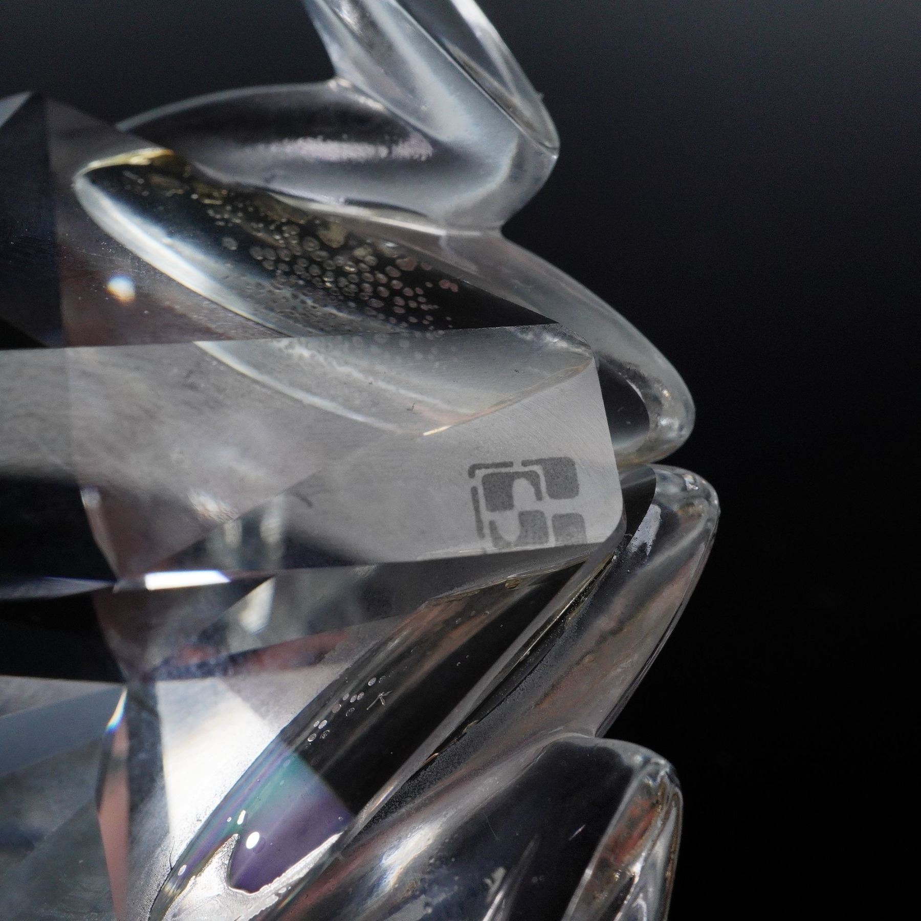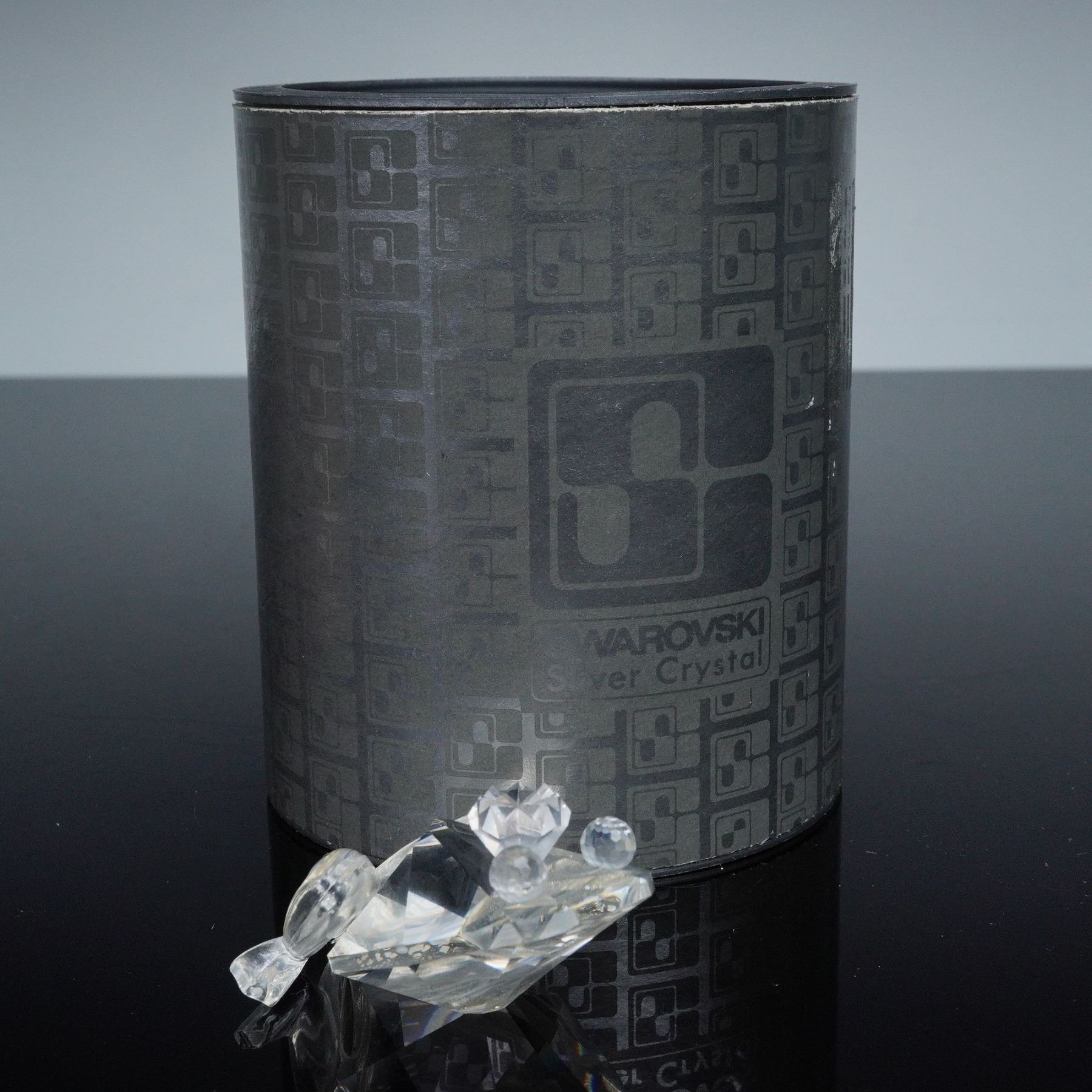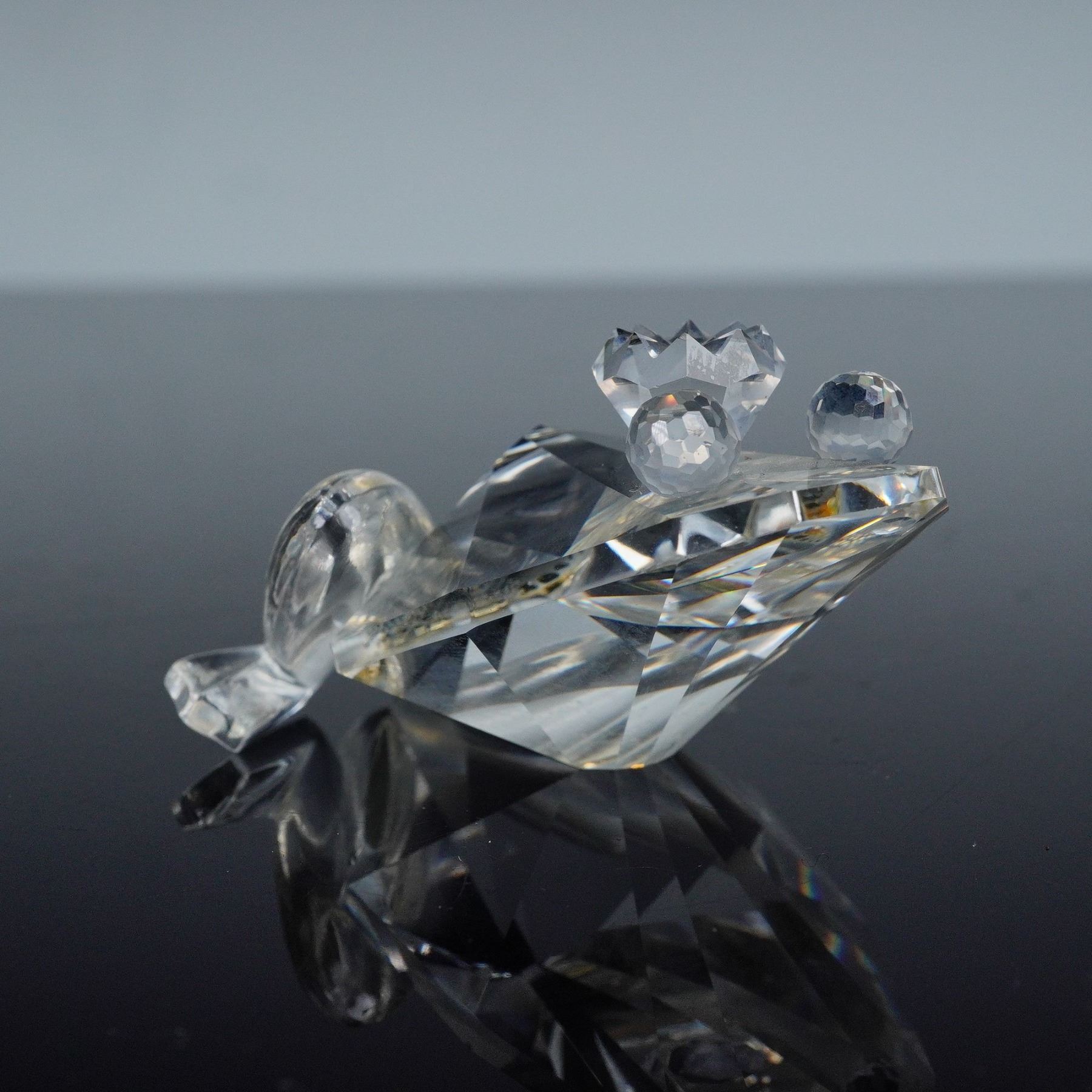Swarovski crystal figurine of the Frog Prince, beautifully crafted from clear faceted crystal with smooth frosted crystal legs and a finely detailed crown. The figurine features striking clear faceted eyes that shimmer with light, giving the piece a lifelike and expressive quality. A graceful and enchanting design that reflects Swarovski artistry at its best. Swarovski backstamp. This item has its original box. Box measures: 3.75"H x 3.25" dia.