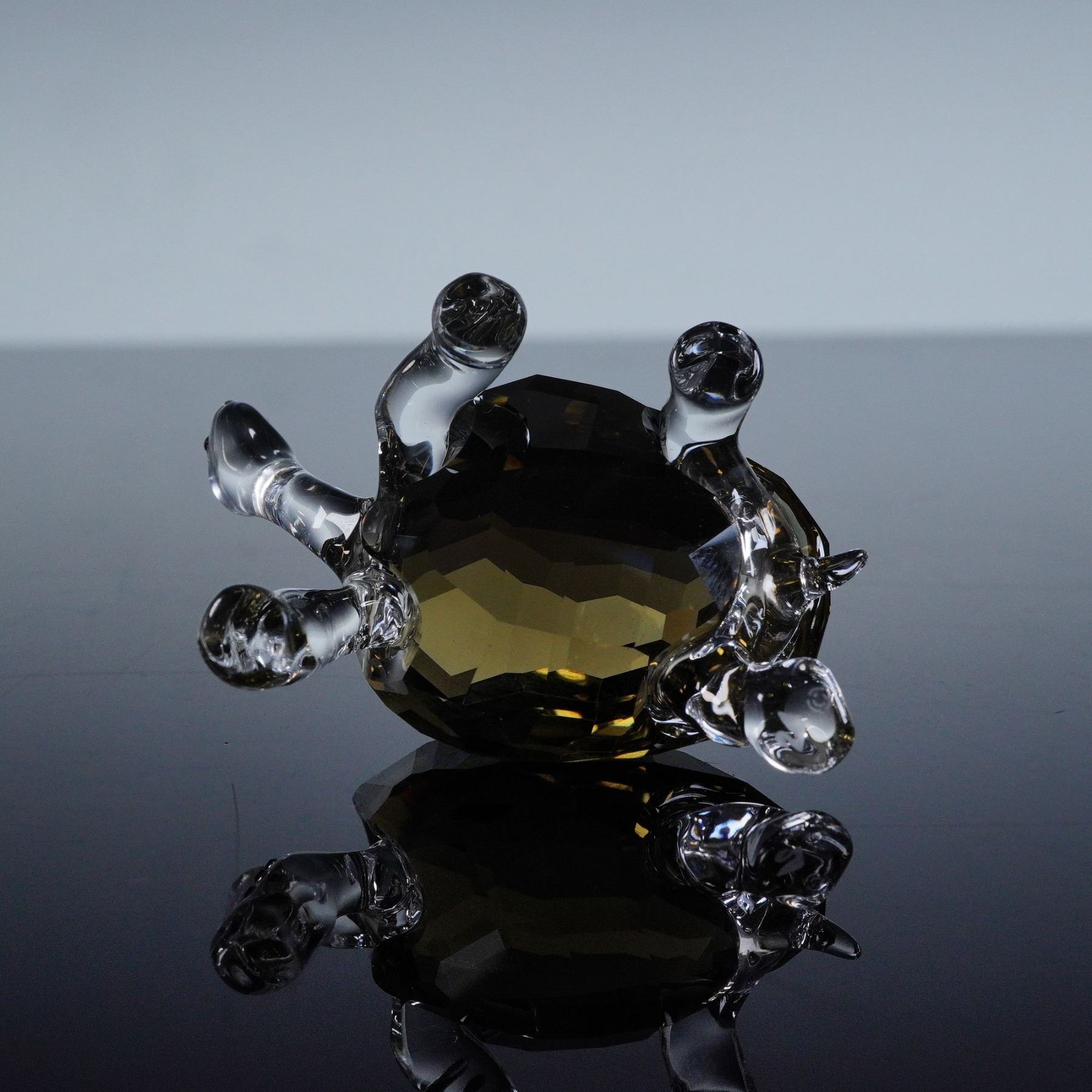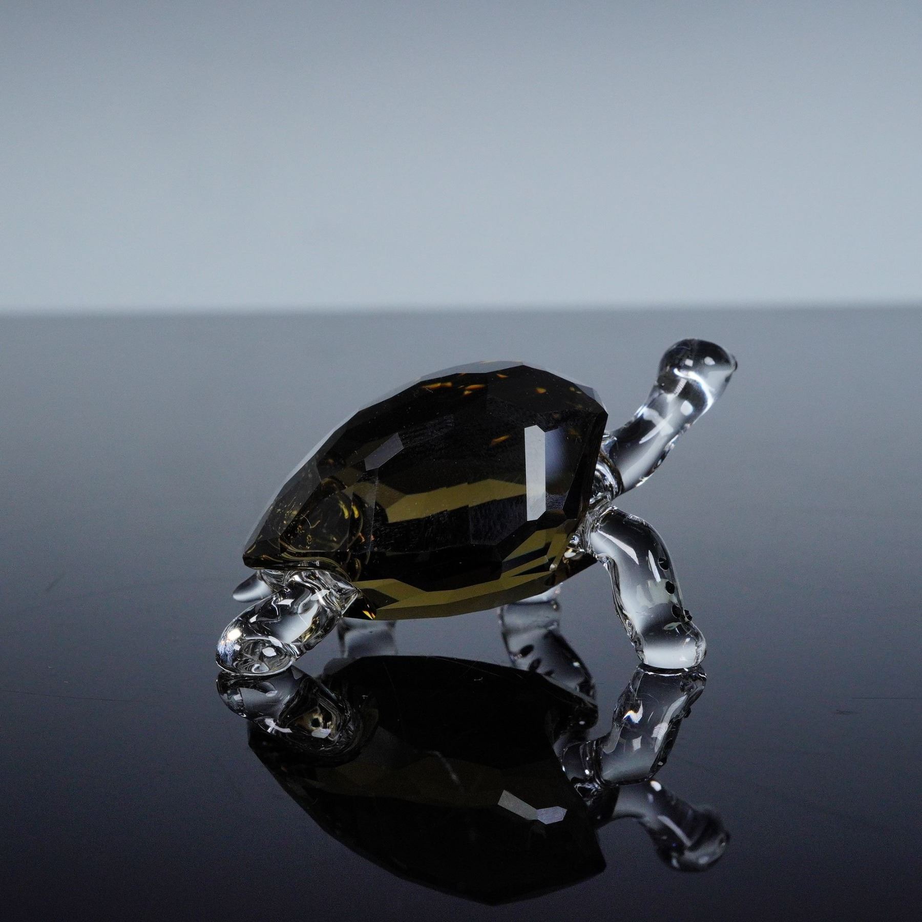 Swarovski 2010 Event Piece Galapagos Tortoise 995036 figurine crafted in smoky crystal with clear crystal limbs, bearing the Swarovski backstamp and signed by the designer, includes original box 3.25"H. A rare and charming exclusive that captures the gentle spirit of this iconic creature in elegant crystal form.