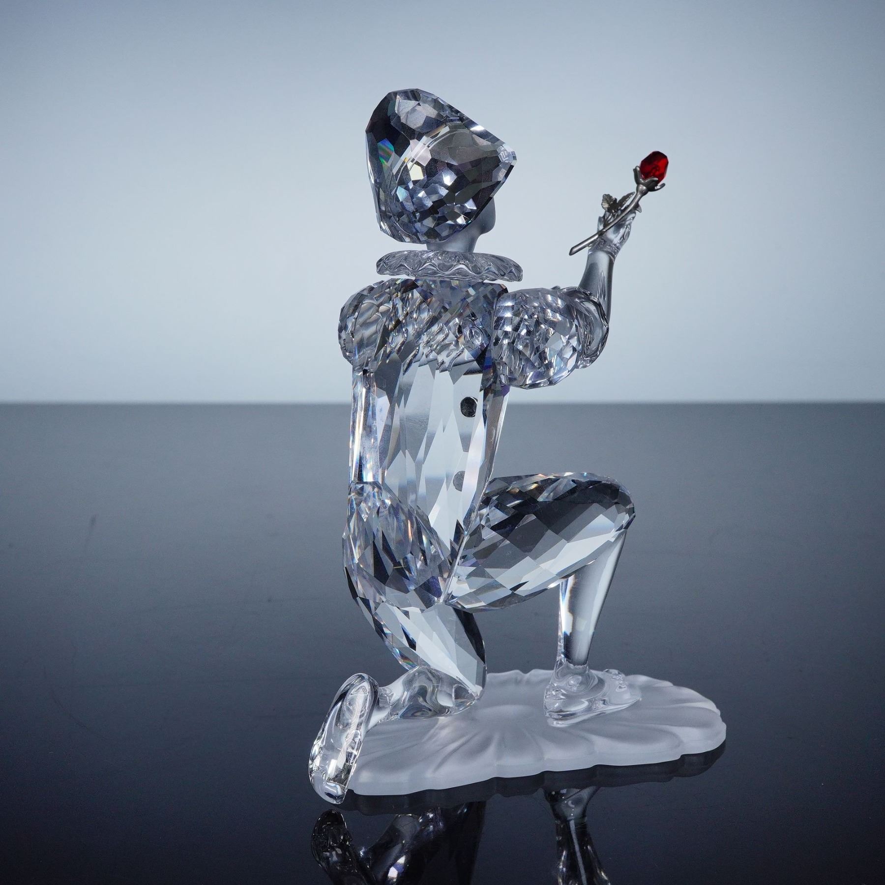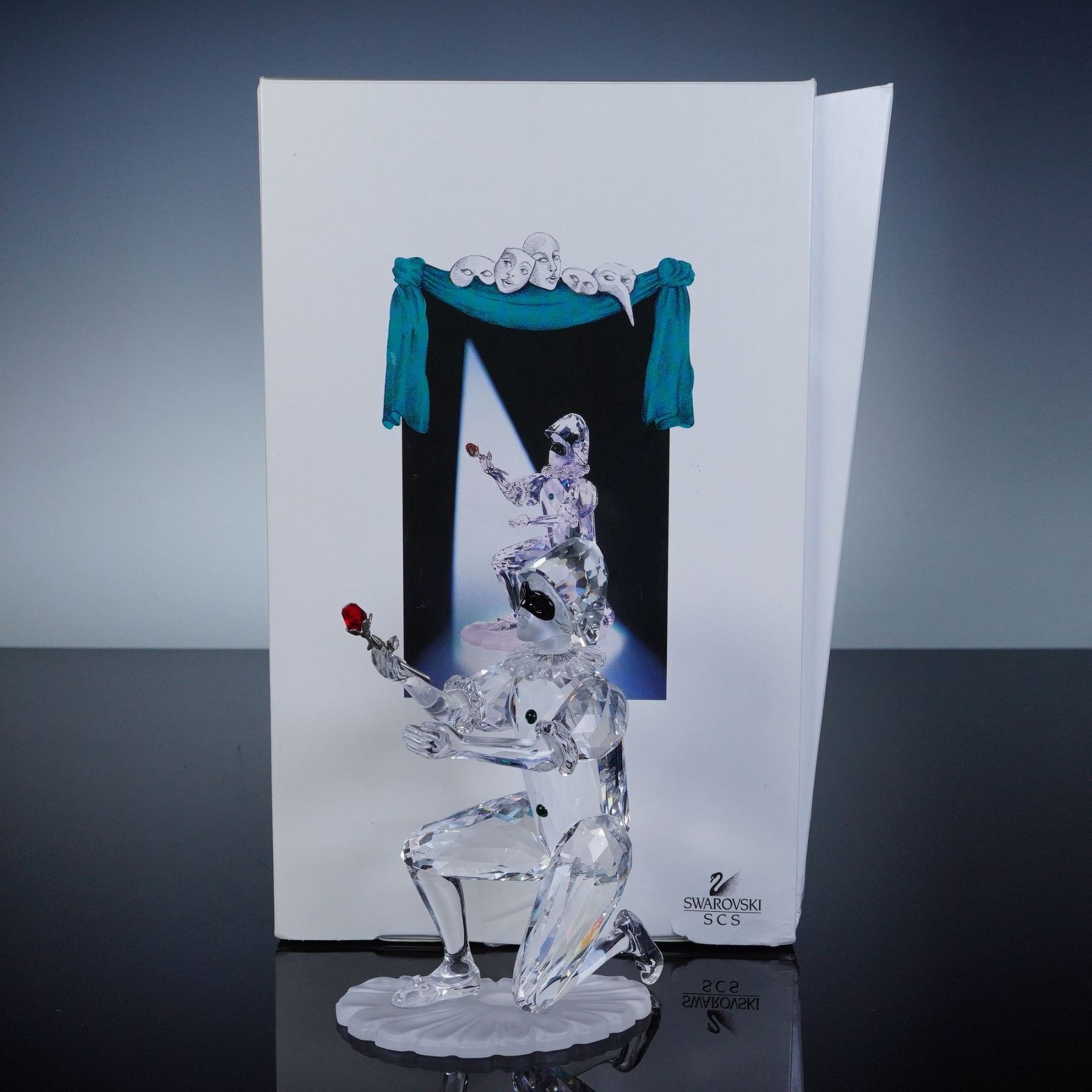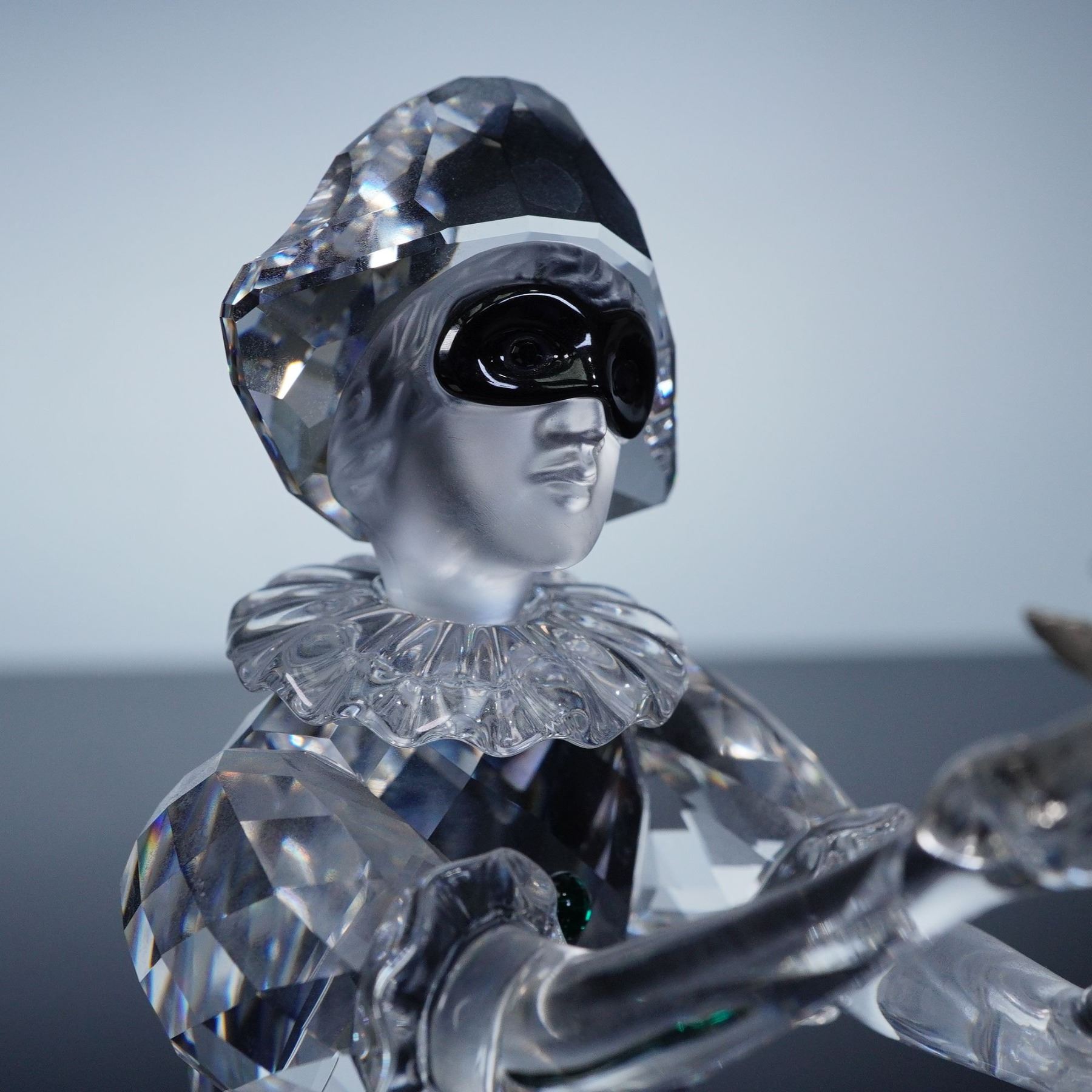 Swarovski 2001 Annual Edition Harlequin 254044 crystal figurine, part of the Masquerade series. Features faceted clear crystal costume, frosted face and hands, and red crystal rose accent. Etched swan logo underside. Includes original box 10"H.