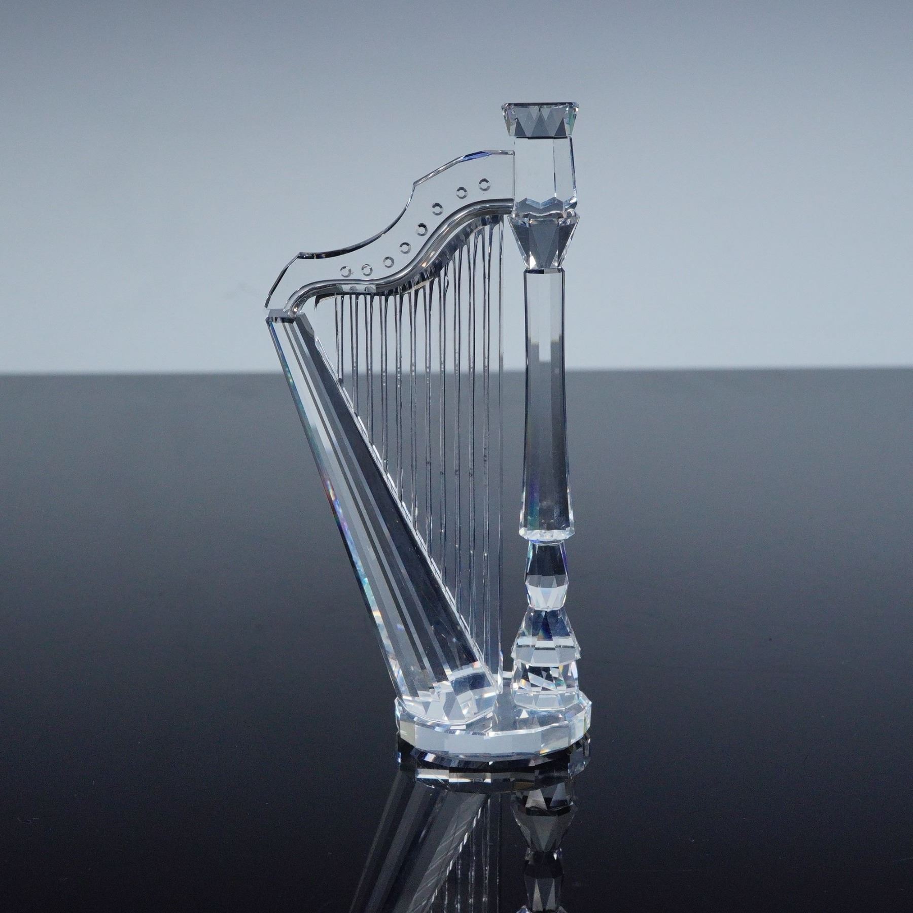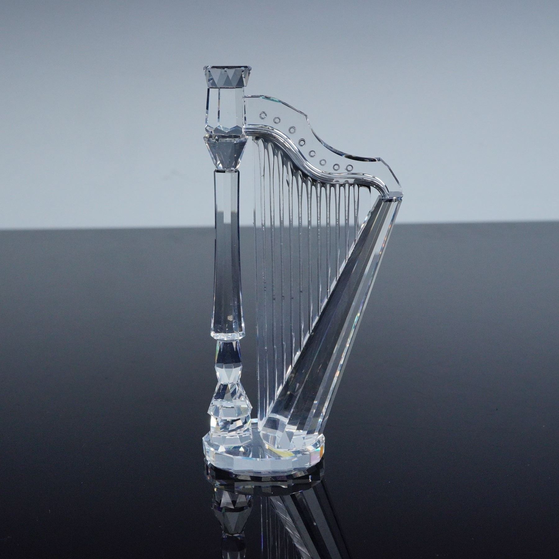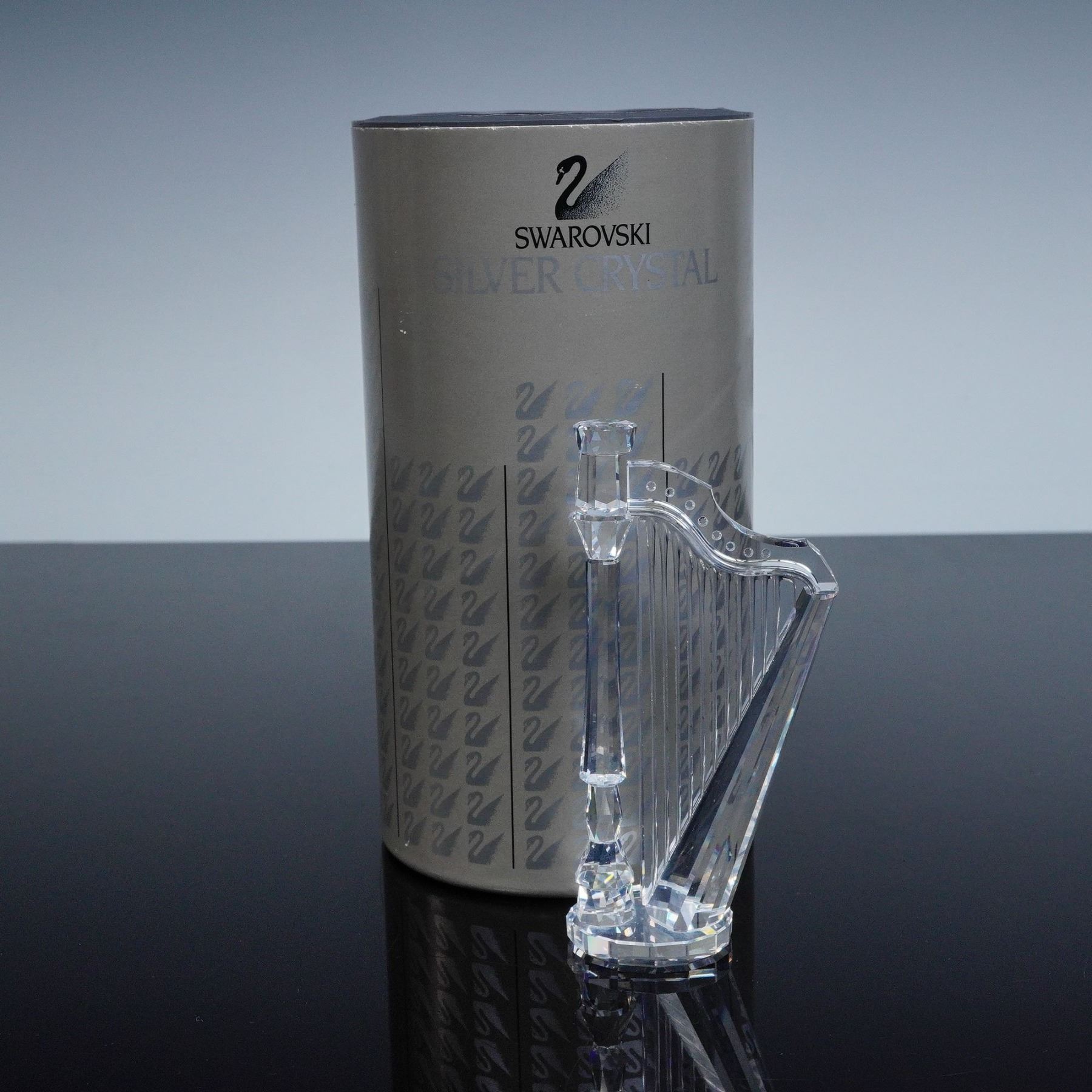 Swarovski Harp 169245 figurine crafted in clear crystal with elegant faceted detail, bearing the Swarovski backstamp, includes original box 6.25"H. A refined musical accent that showcases the brand's signature brilliance and craftsmanship.