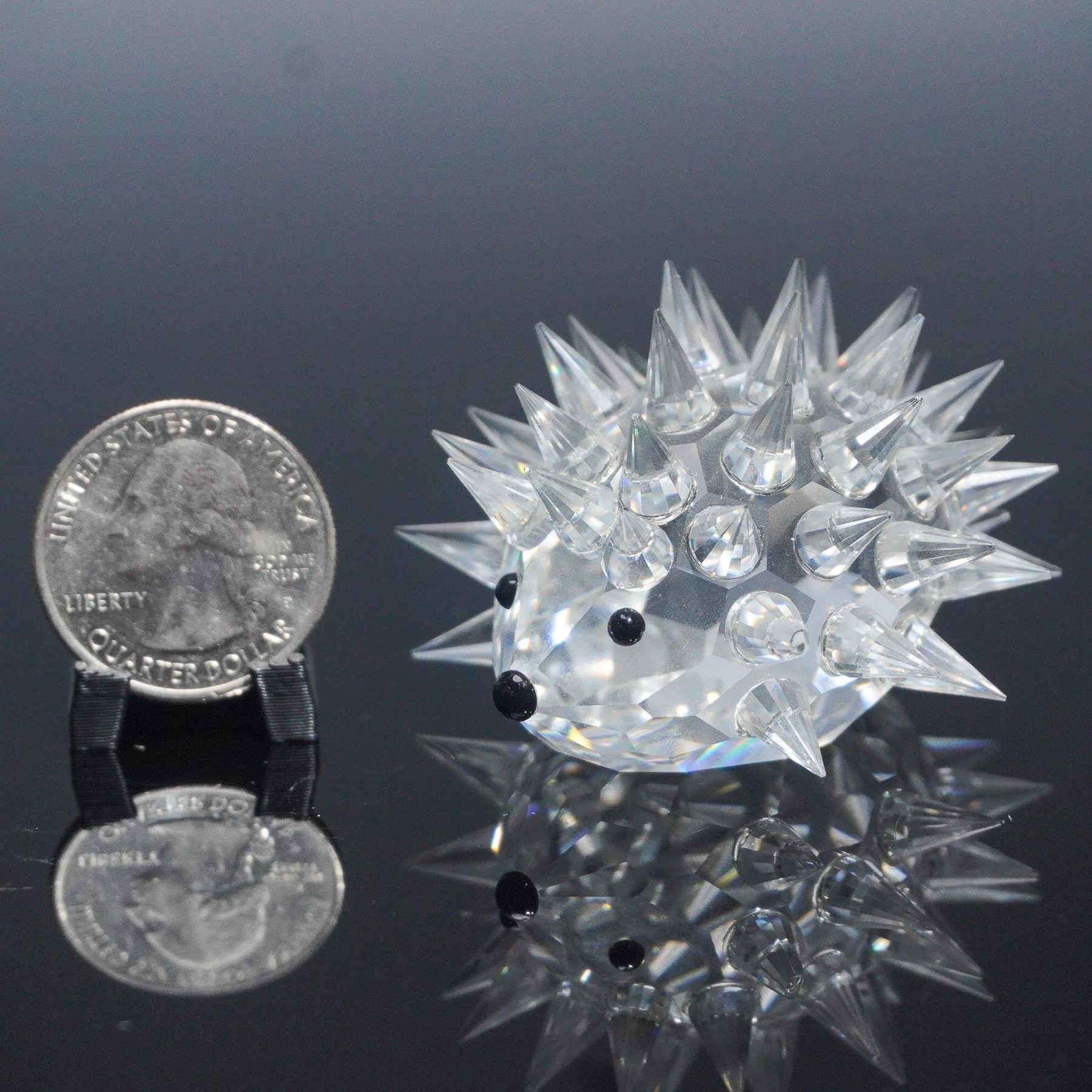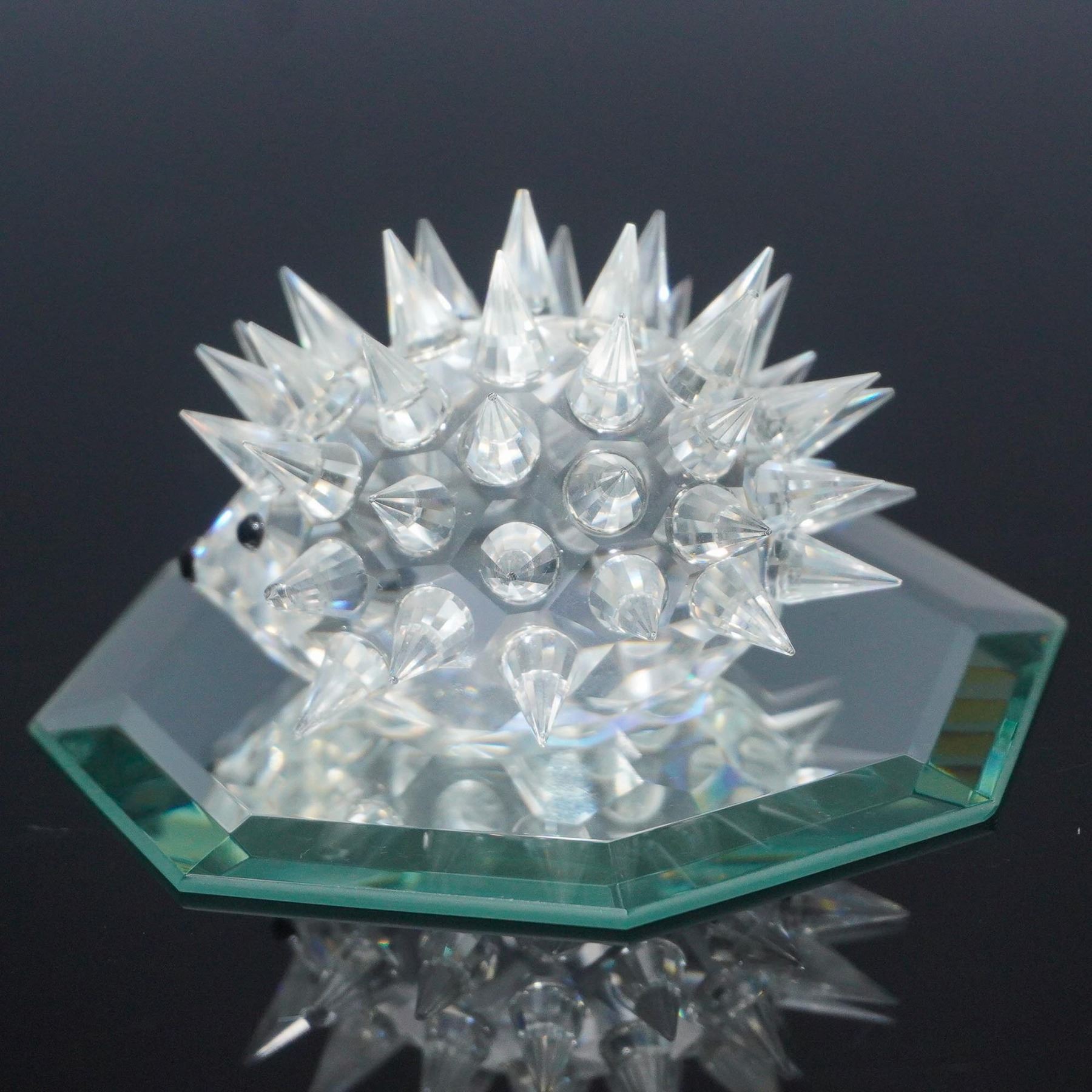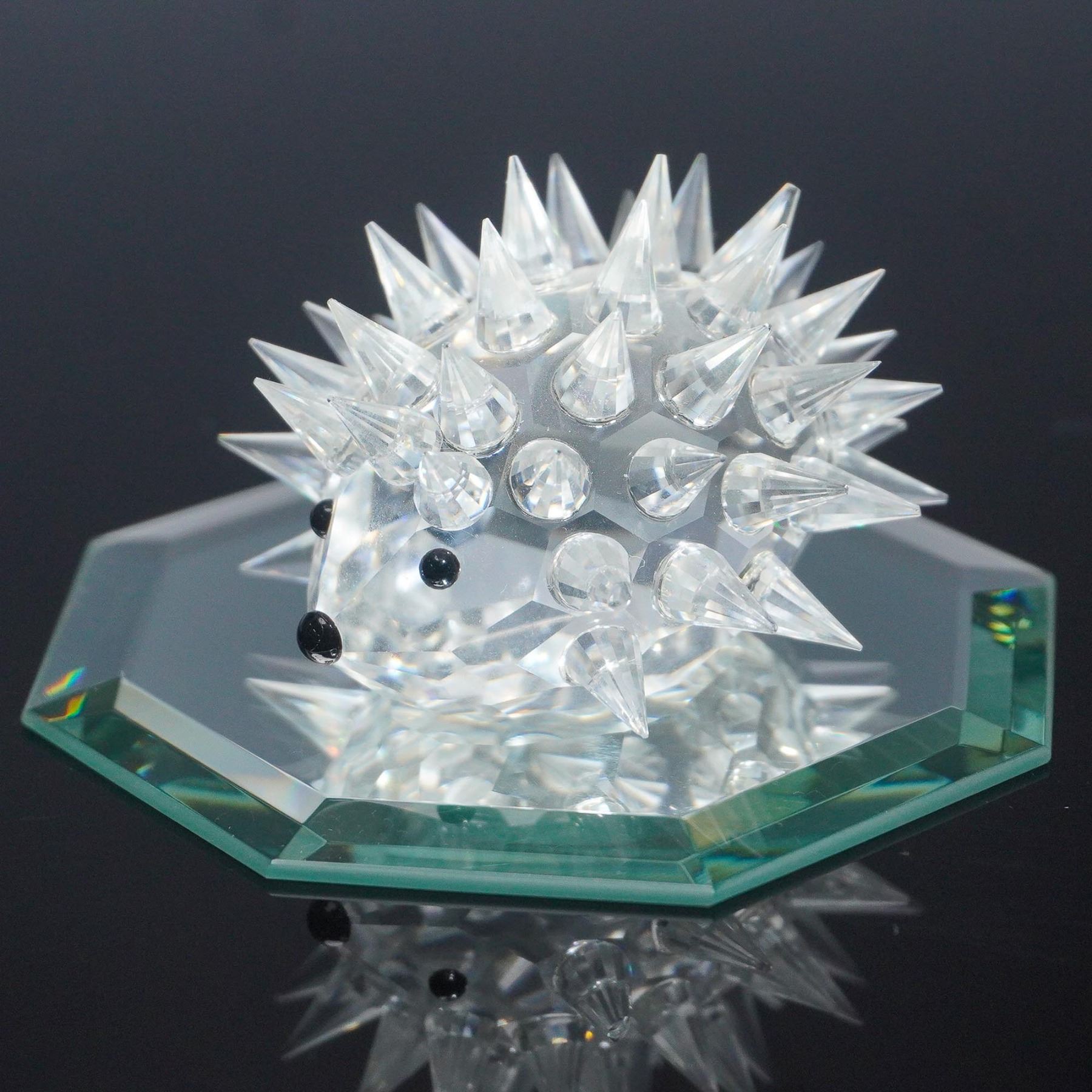 Charming Swarovski Silver Crystal figurine depicting a hedgehog with clear faceted crystal body and sharply pointed spines, accented with jet black eyes and nose. Includes a coordinating octagonal mirror display base that enhances the sparkle and dimension of the design. The hedgehog figurine bares the Swarovski acid-mark and is presented with its original cylindrical Swarovski Silver Crystal box.