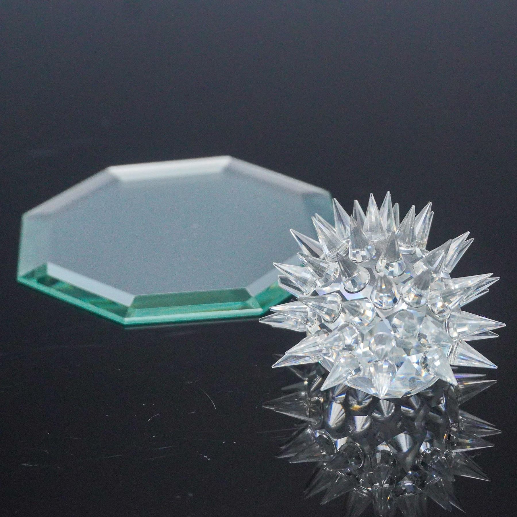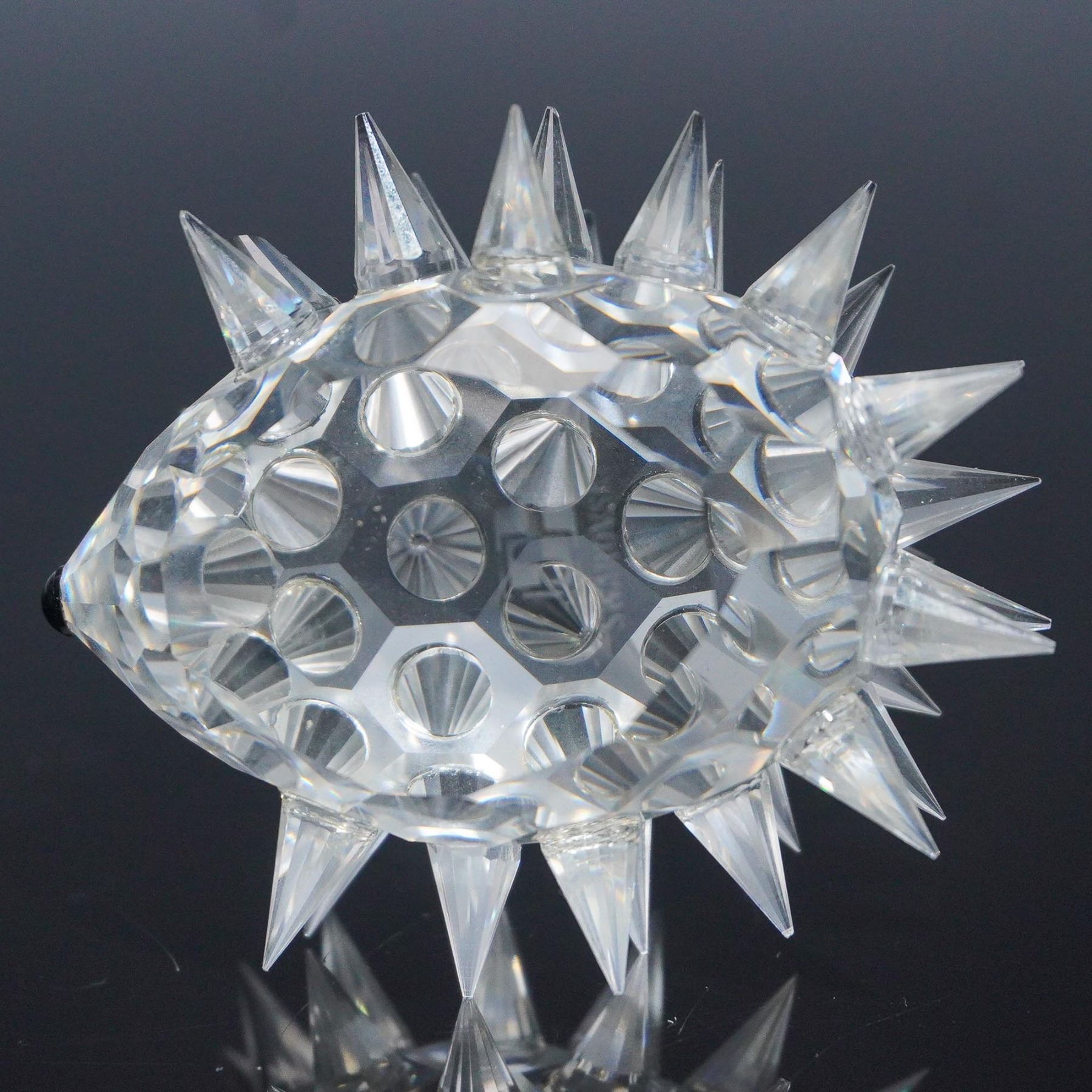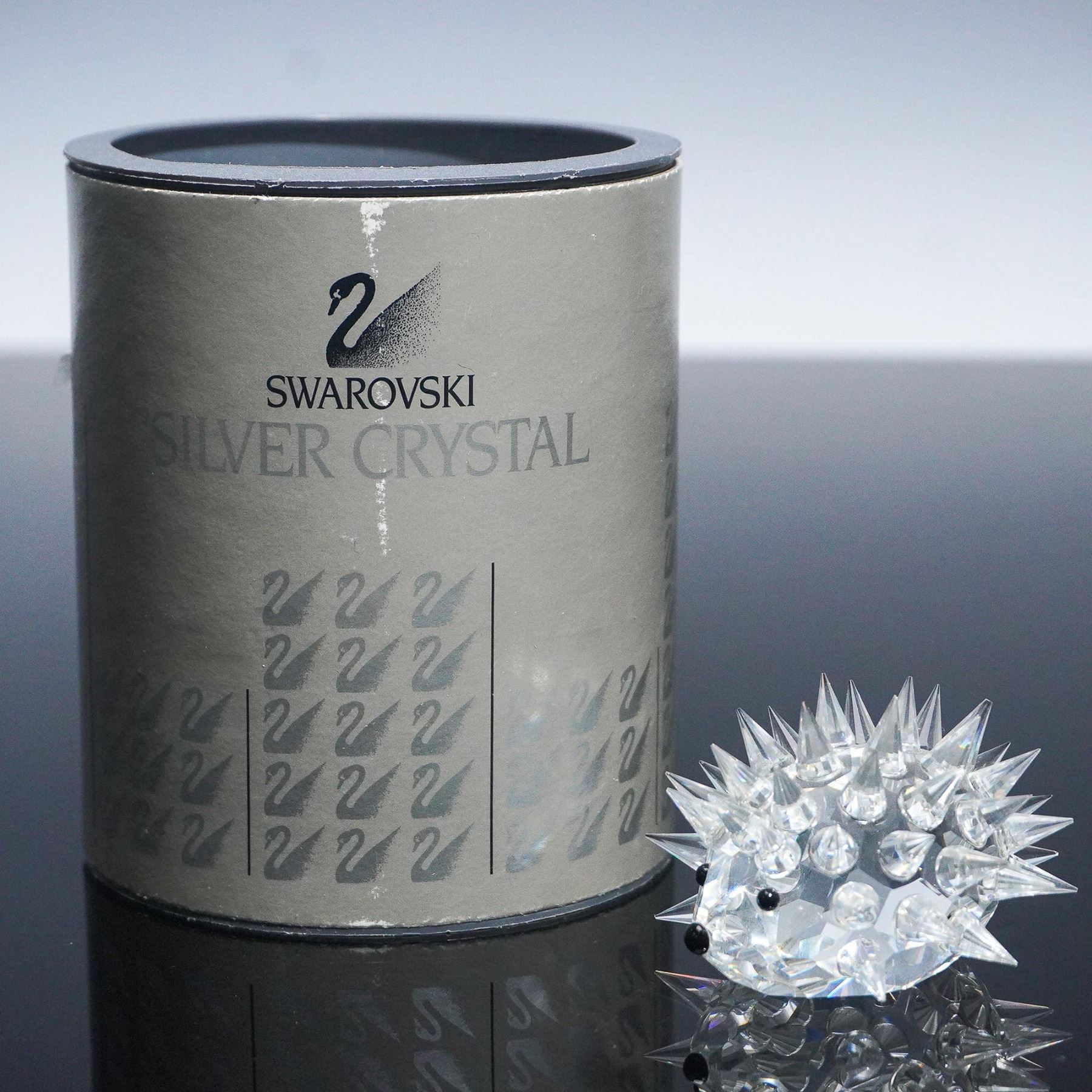 Charming Swarovski Silver Crystal figurine depicting a hedgehog with clear faceted crystal body and sharply pointed spines, accented with jet black eyes and nose. Includes a coordinating octagonal mirror display base that enhances the sparkle and dimension of the design. The hedgehog figurine bares the Swarovski acid-mark and is presented with its original cylindrical Swarovski Silver Crystal box.