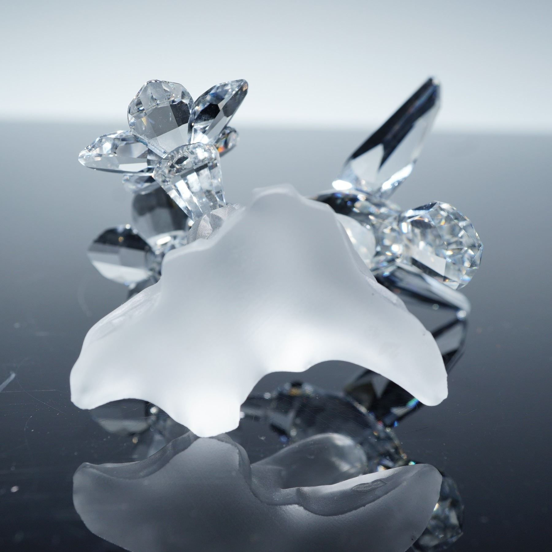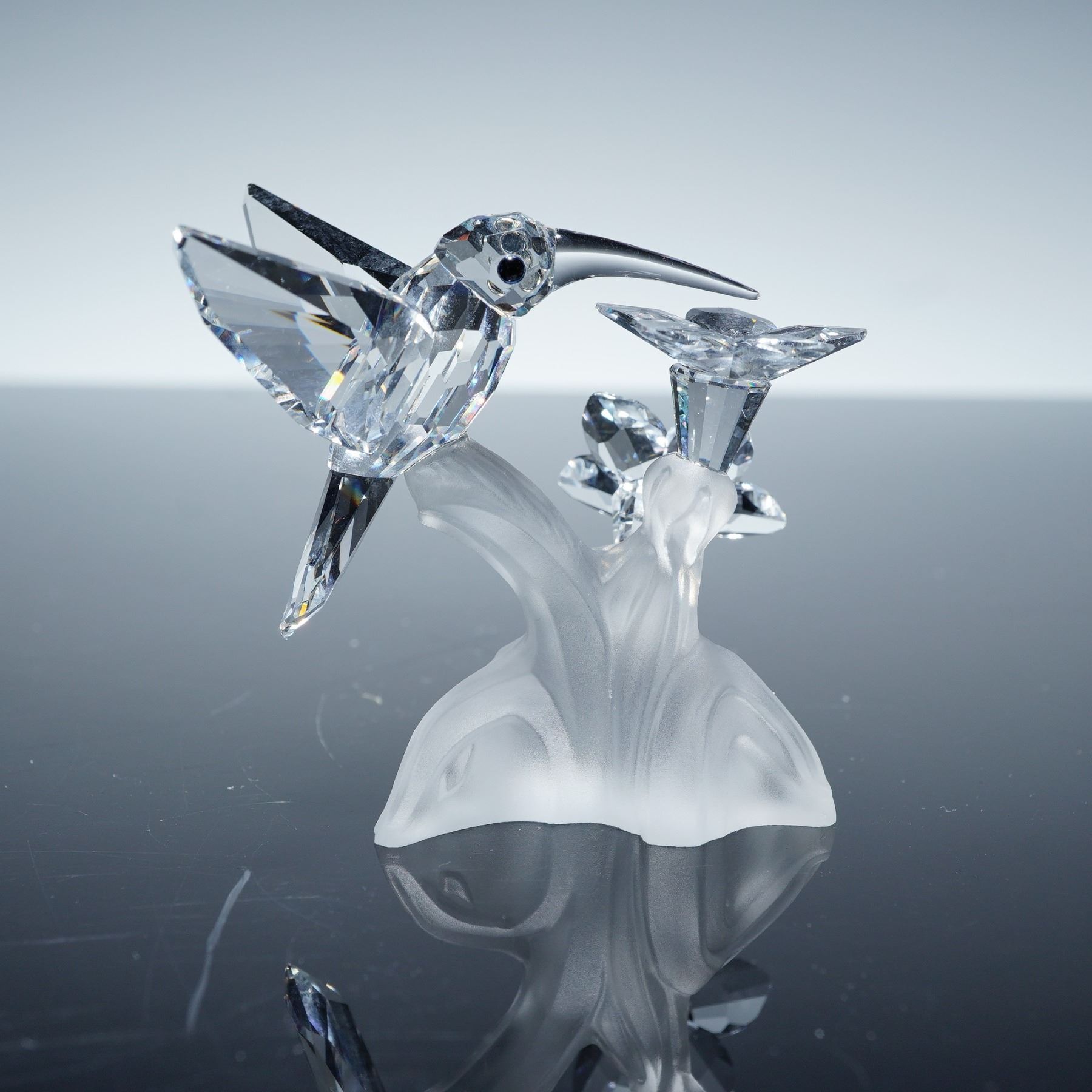 Swarovski Silver Crystal figurine 166184, Hummingbird, featuring a clear faceted crystal bird with outstretched wings, long beak, and black crystal eyes, feeding from a faceted crystal flower. The bird is perched on a frosted crystal base shaped like a flower stem. This piece is part of the Swarovski Among Flowers and Foliage collection and is prized for its lifelike detail and sense of motion. Swarovski backstamp.