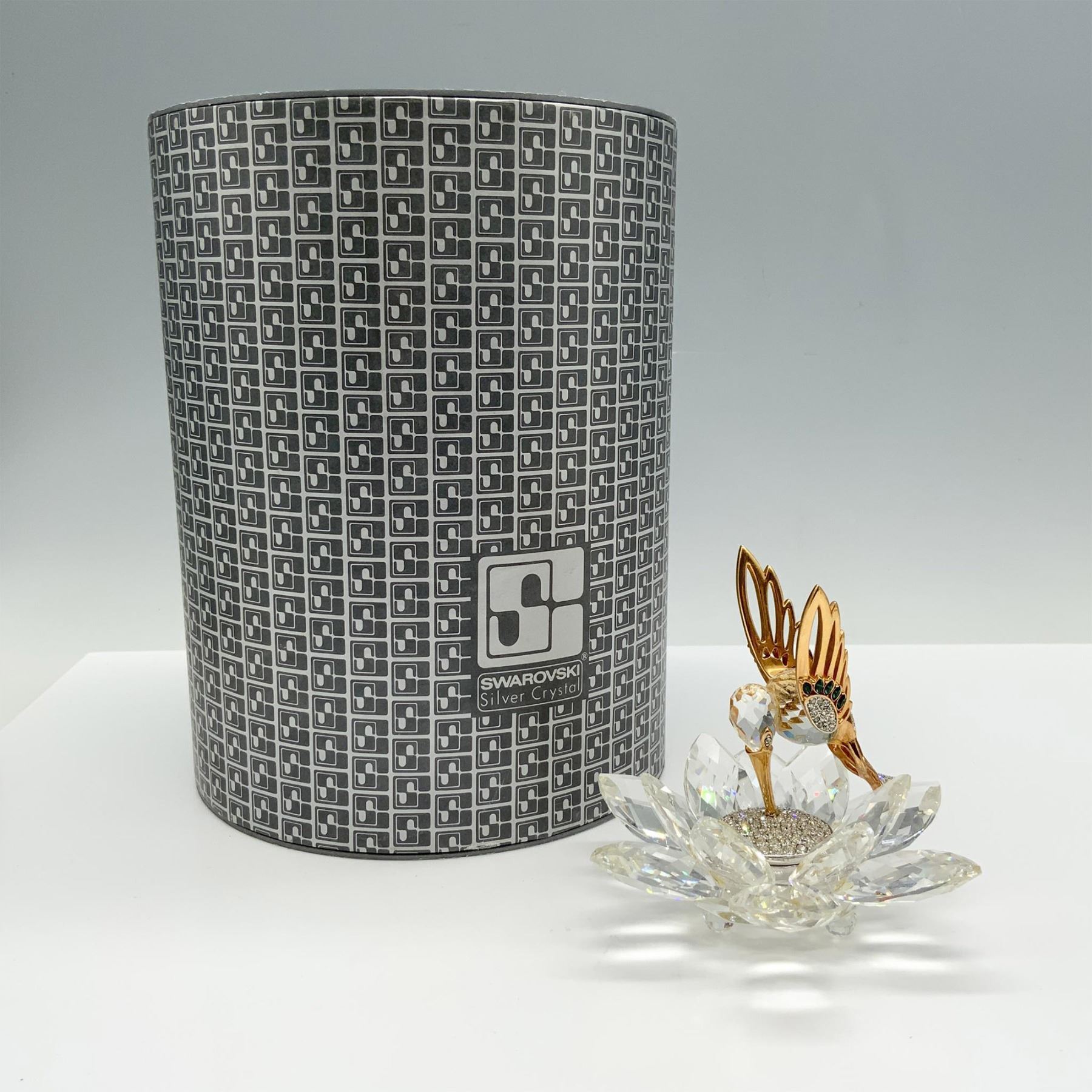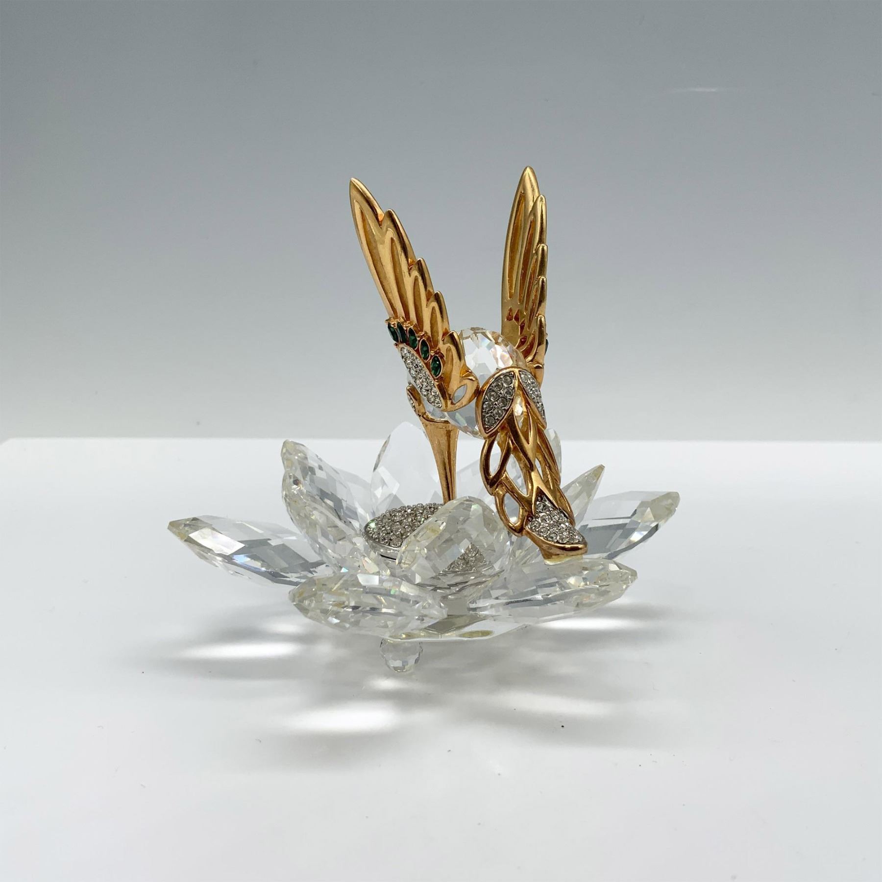 Part of the original Gold series of figurines, bird feeding off clear crystal center of flower. Birds body and wings are gold toned rhodium. Wings are accented with clear and green crystals. Swarovski backstamp 7552 NR100. This item has its original box: 8"H x 6" dia.