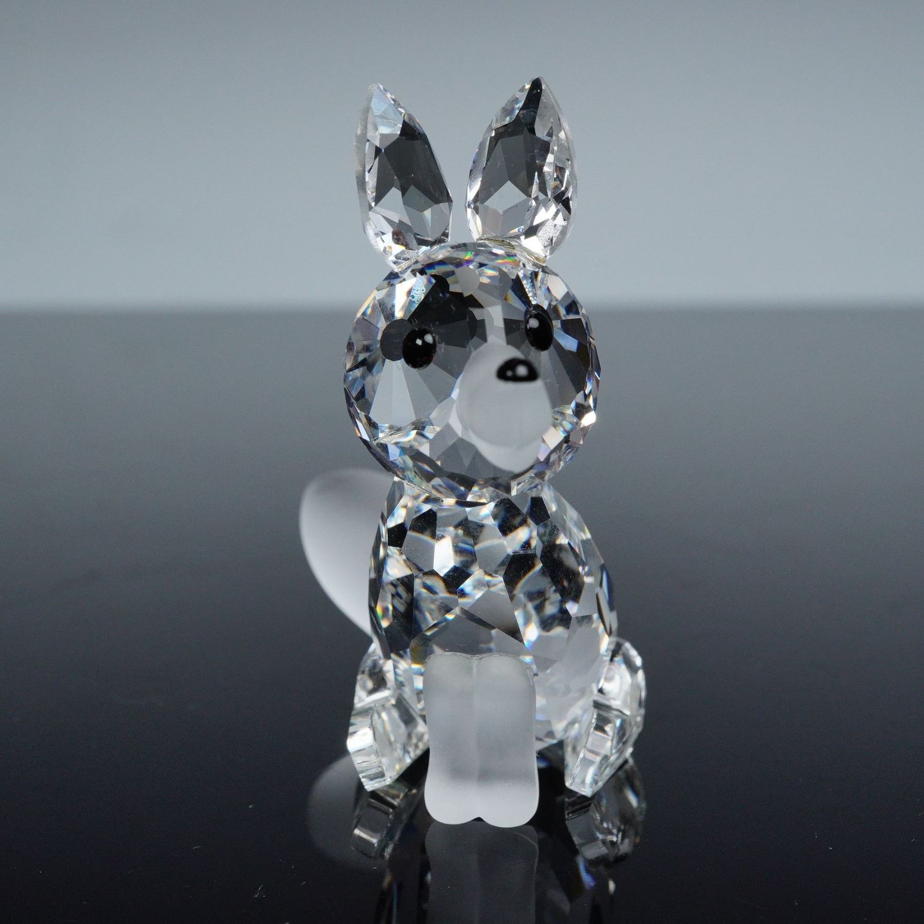 A charming Swarovski Silver Crystal figurine depicting a large fox rendered in precision-cut clear crystal. The piece features a faceted body and head with smooth frosted crystal details for the tail, muzzle, and paws, creating a lifelike contrast in texture. The fox's expressive black crystal eyes and nose add personality and warmth to the design. The underside bears the Swarovski Swan logo etching, confirming authenticity. Model number 013837.  This item has its original box.