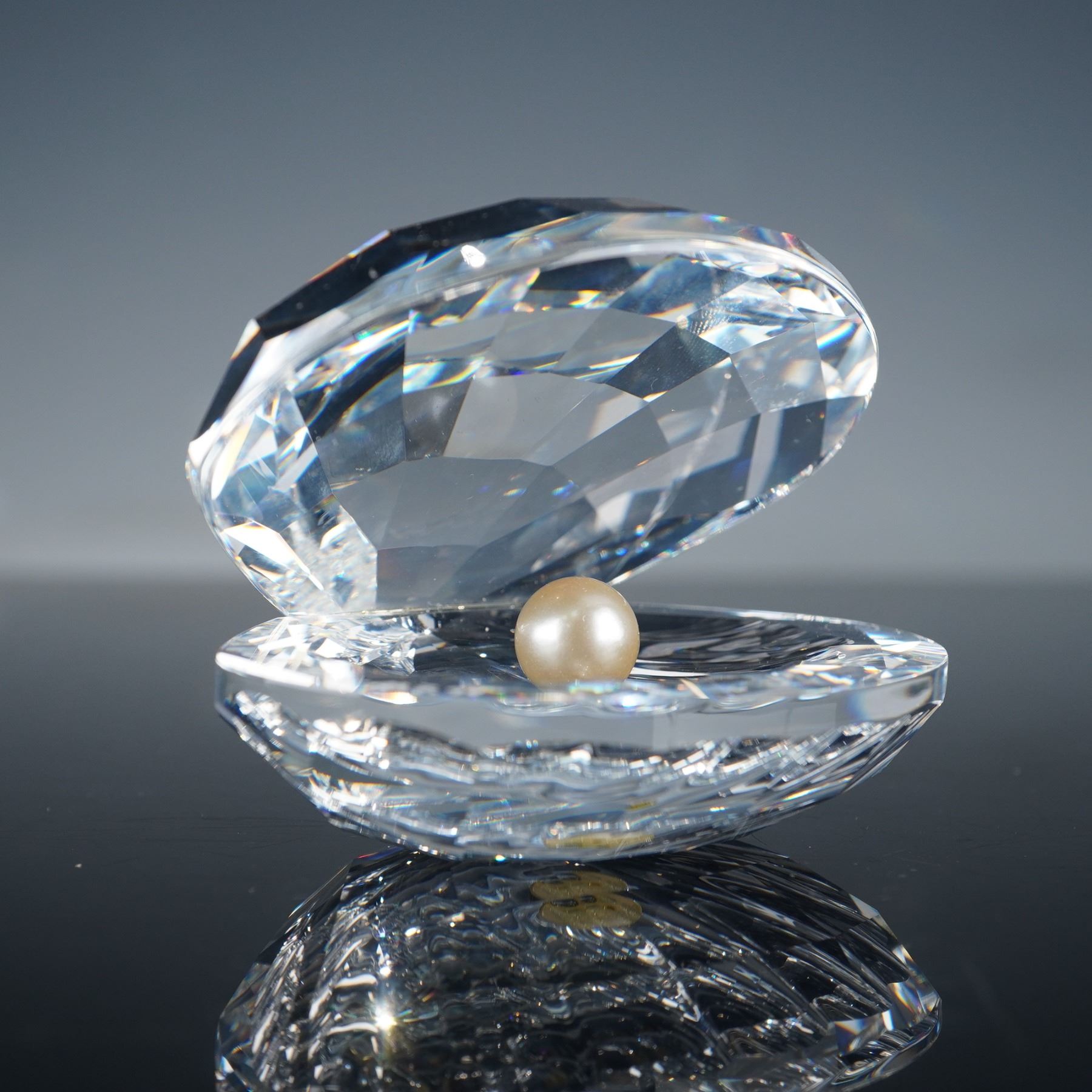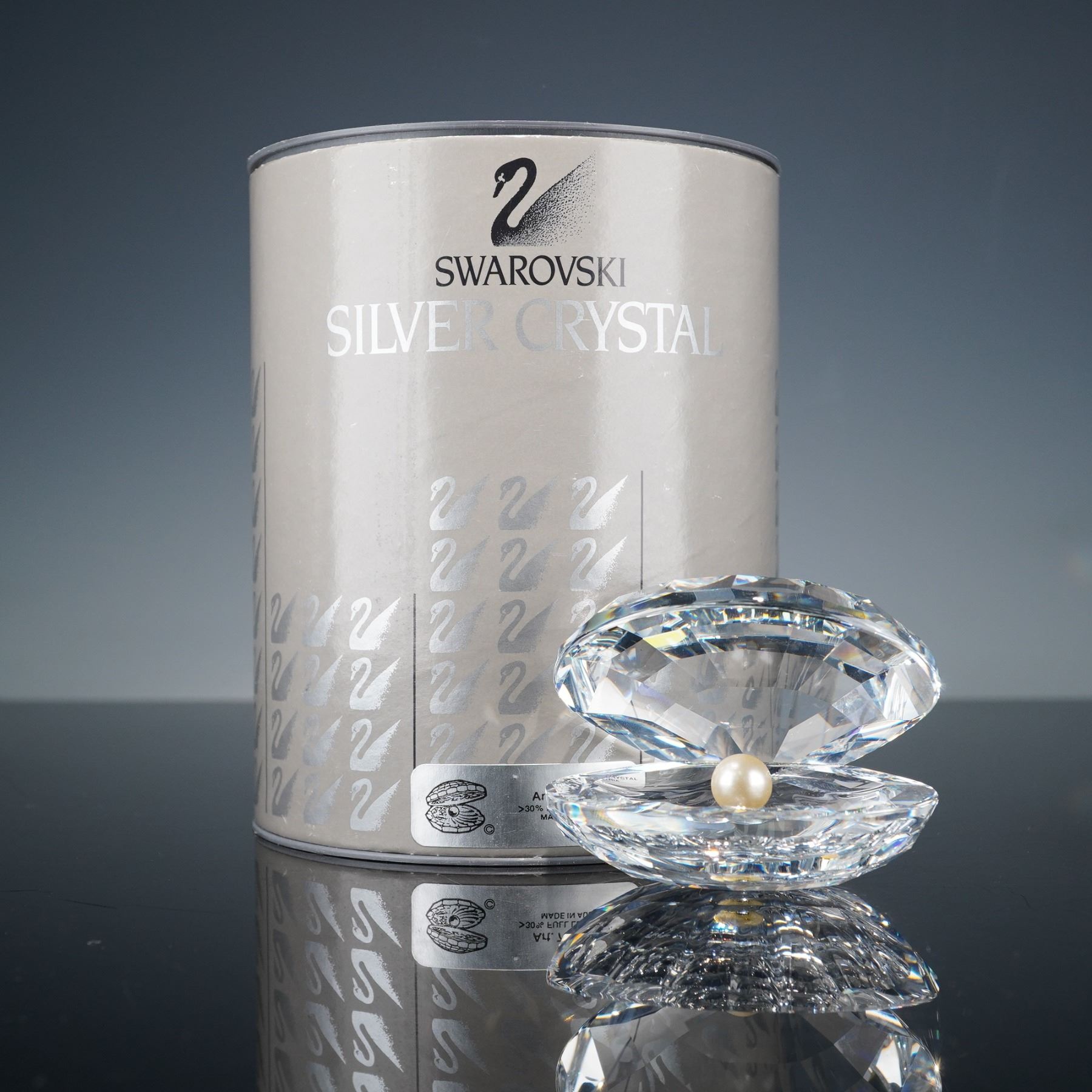 An elegant Swarovski crystal sculpture depicting an open clam shell crafted from precision-cut clear crystal, revealing a lustrous pearl nestled within. The faceted design captures and refracts light beautifully, creating a stunning display piece. Etched with the Swarovski swan logo on the base and accompanied by the original "Swarovski Silver Crystal" packaging. Model No. 5285132.