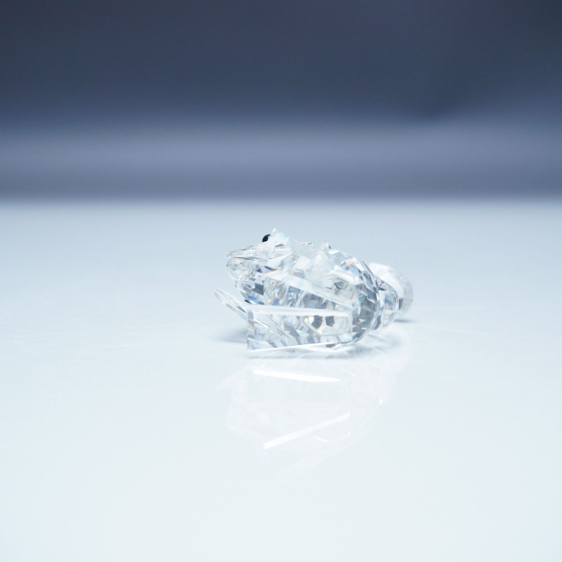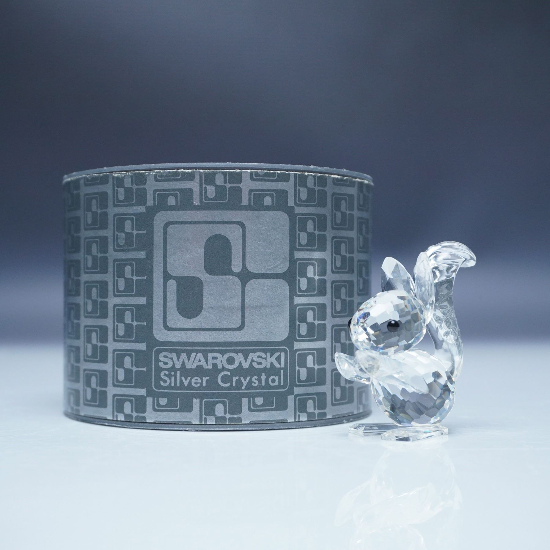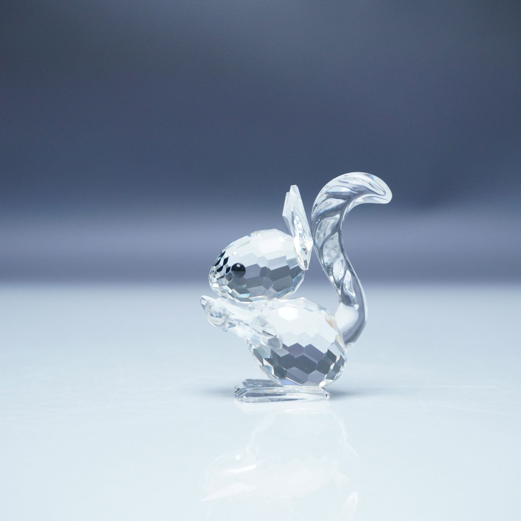 This retired Swarovski crystal squirrel figurine was part of the 'Woodland Friends' theme group before later transitioning into the 'Rare Encounters' collection. Crafted in faceted clear crystal with jet-black eyes, the figurine captures the charm and agility of the woodland creature. This item includes its original box. Swarovski mark. 011871.