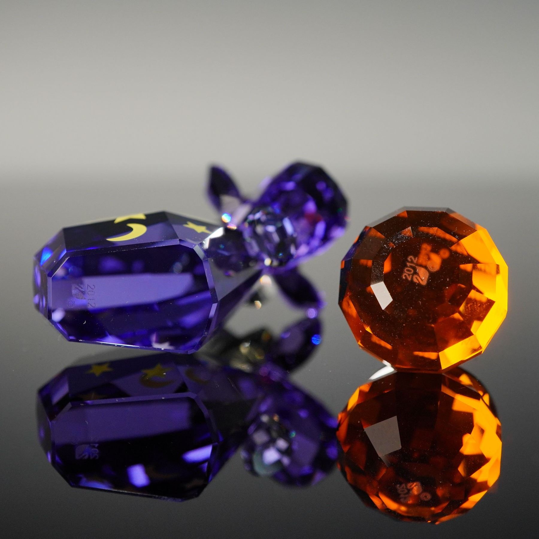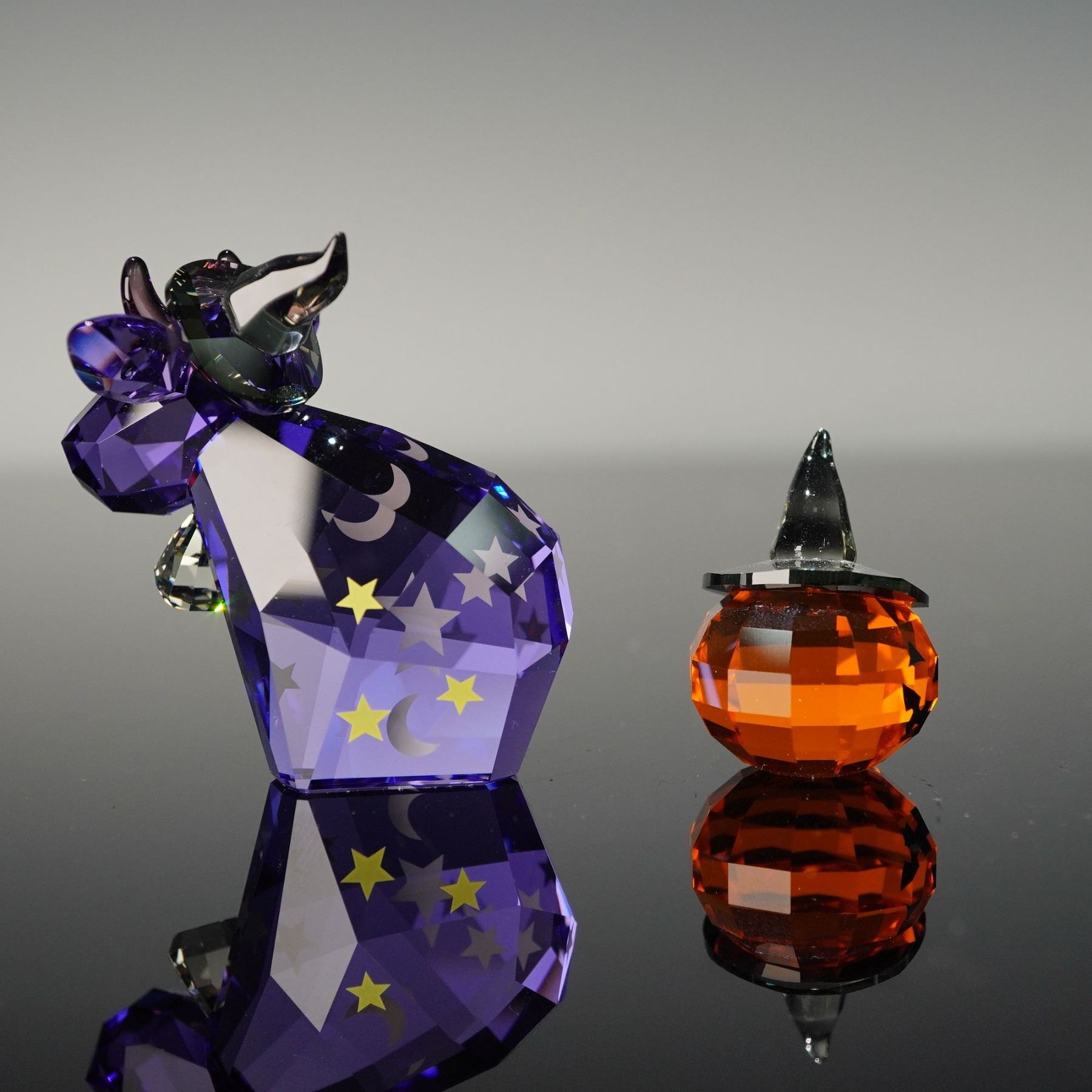 Swarovski crystal figurine Lovlots Magic Mo with Pumpkin 1139968, issued in 2012. Features a purple cow decorated with yellow stars and crescent moons, accompanied by an orange pumpkin wearing a witch hat. Includes original Swarovski box and backstamp.