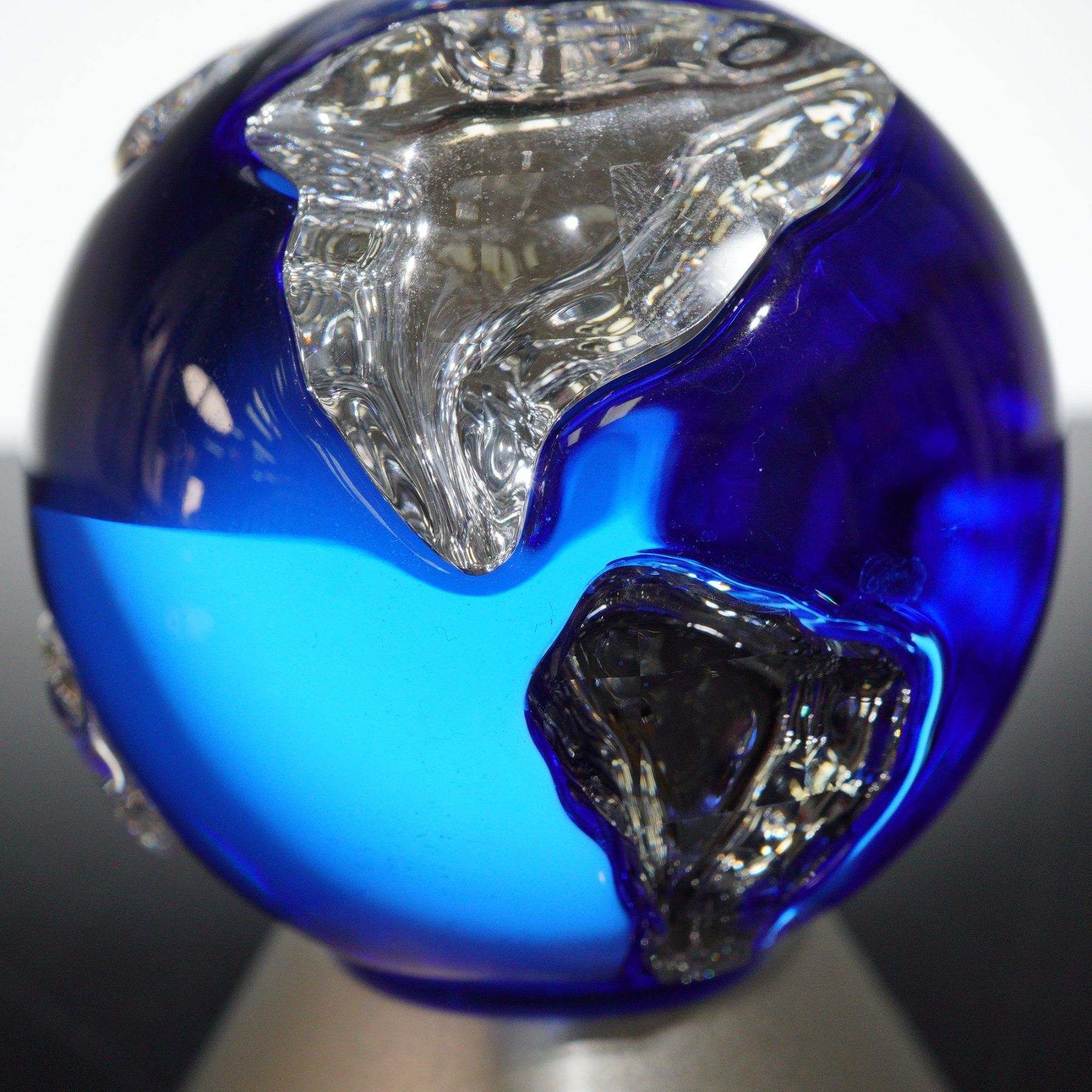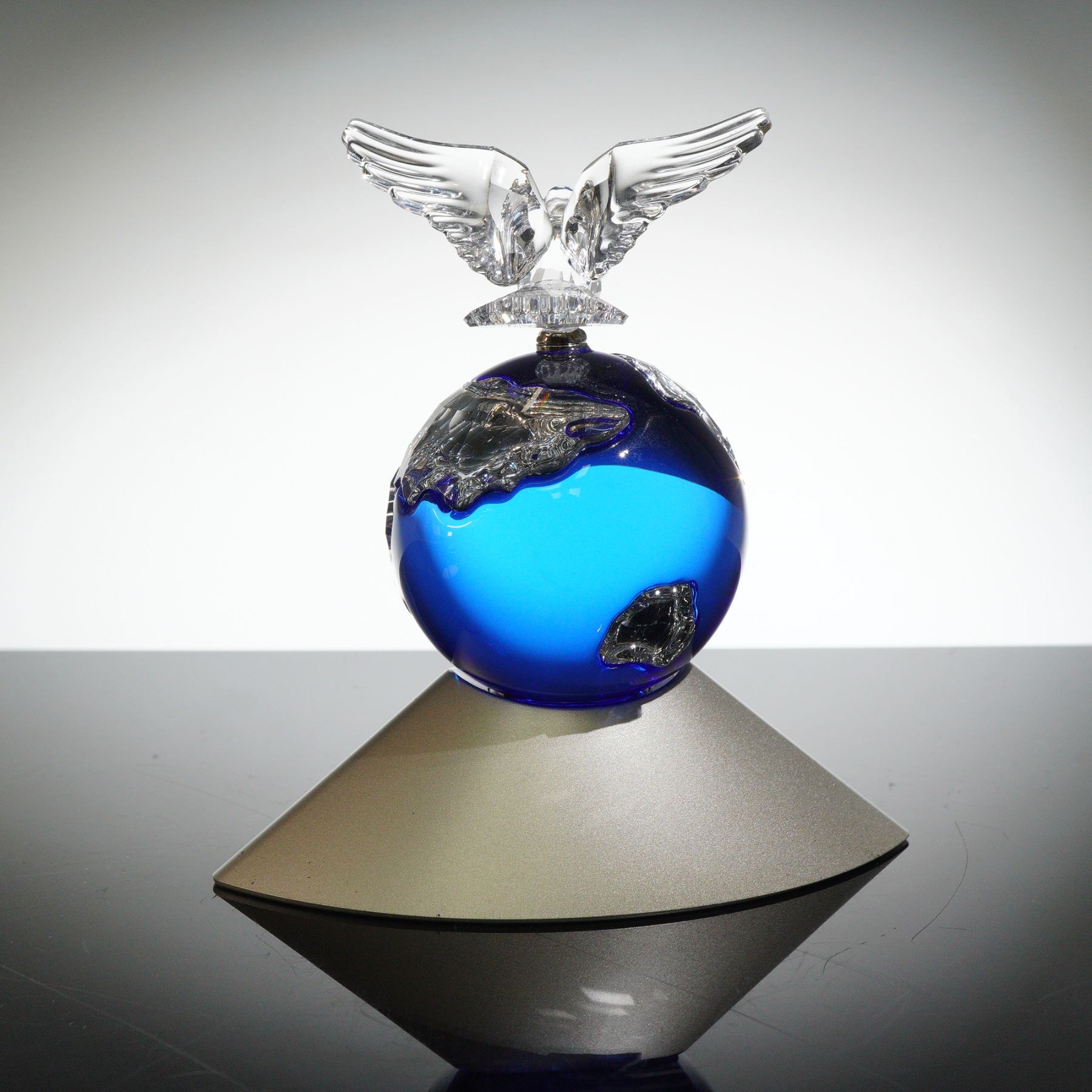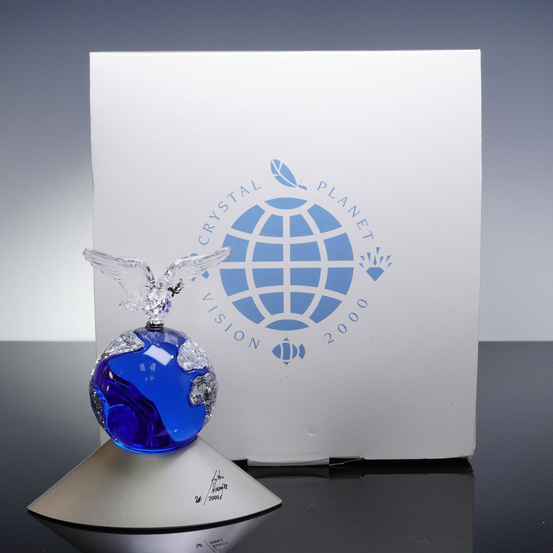 Issued in 2000 to commemorate the new millennium, the Crystal Planet is the second piece in the Commemorative Editions theme. This stunning figurine features a sapphire blue globe with clear crystal continents, symbolizing unity and peace. A clear crystal dove carrying an olive branch is perched atop the globe, which sits on a silver base with the designer's signature. The globe is fixed to the base and cannot be rotated or removed, while the dove rotates a full 360 degrees. Swarovski backstamp. This item has its original box.