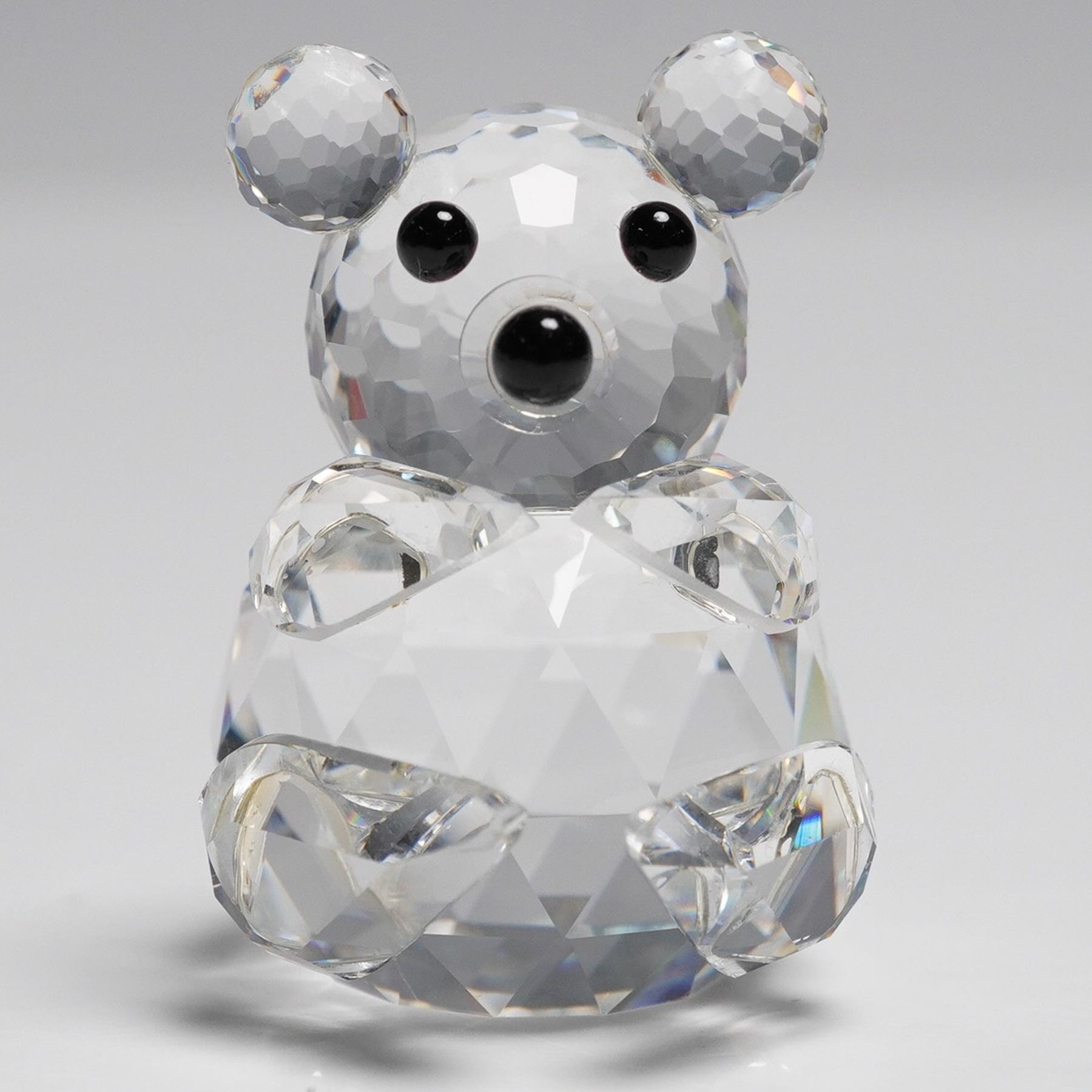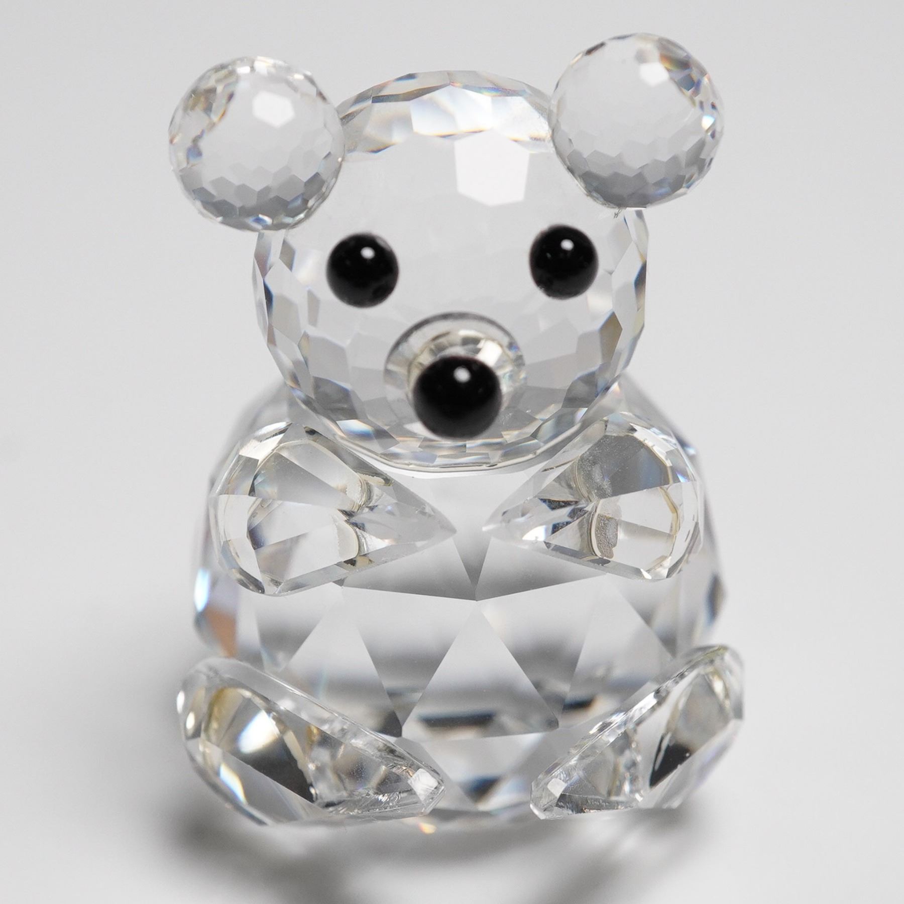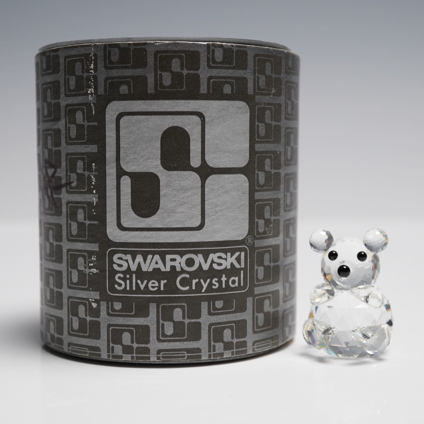 Swarovski Silver Crystal Miniature Bear figurine, featuring a seated bear with clear faceted crystal body and black crystal eyes and nose. This early Swarovski design carries the block SC logo etched on the base. Includes the original gray Swarovski Silver Crystal cylinder box with retro-style logo design. A delightful and collectible piece that captures the classic charm of Swarovski animal figurines. In excellent condition.