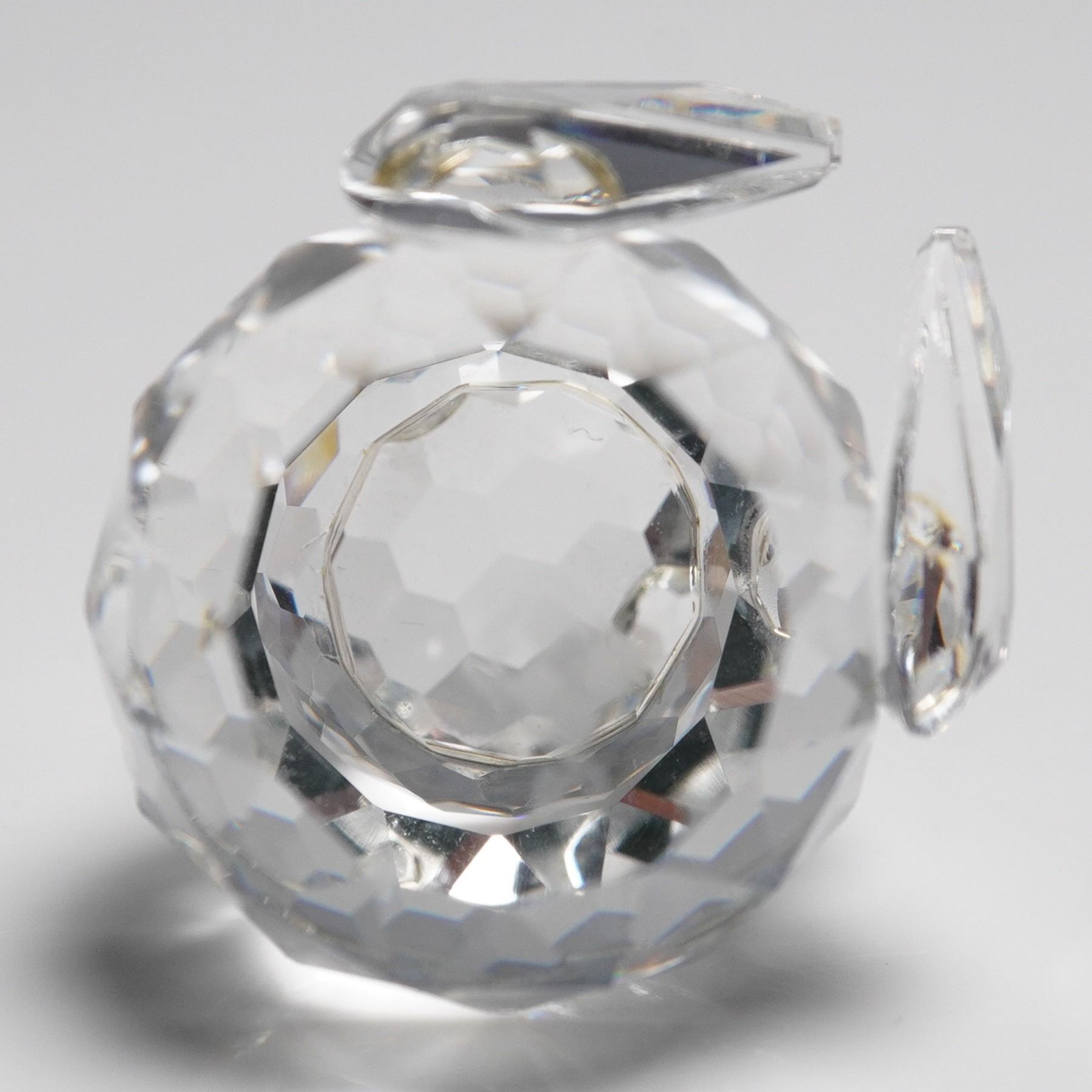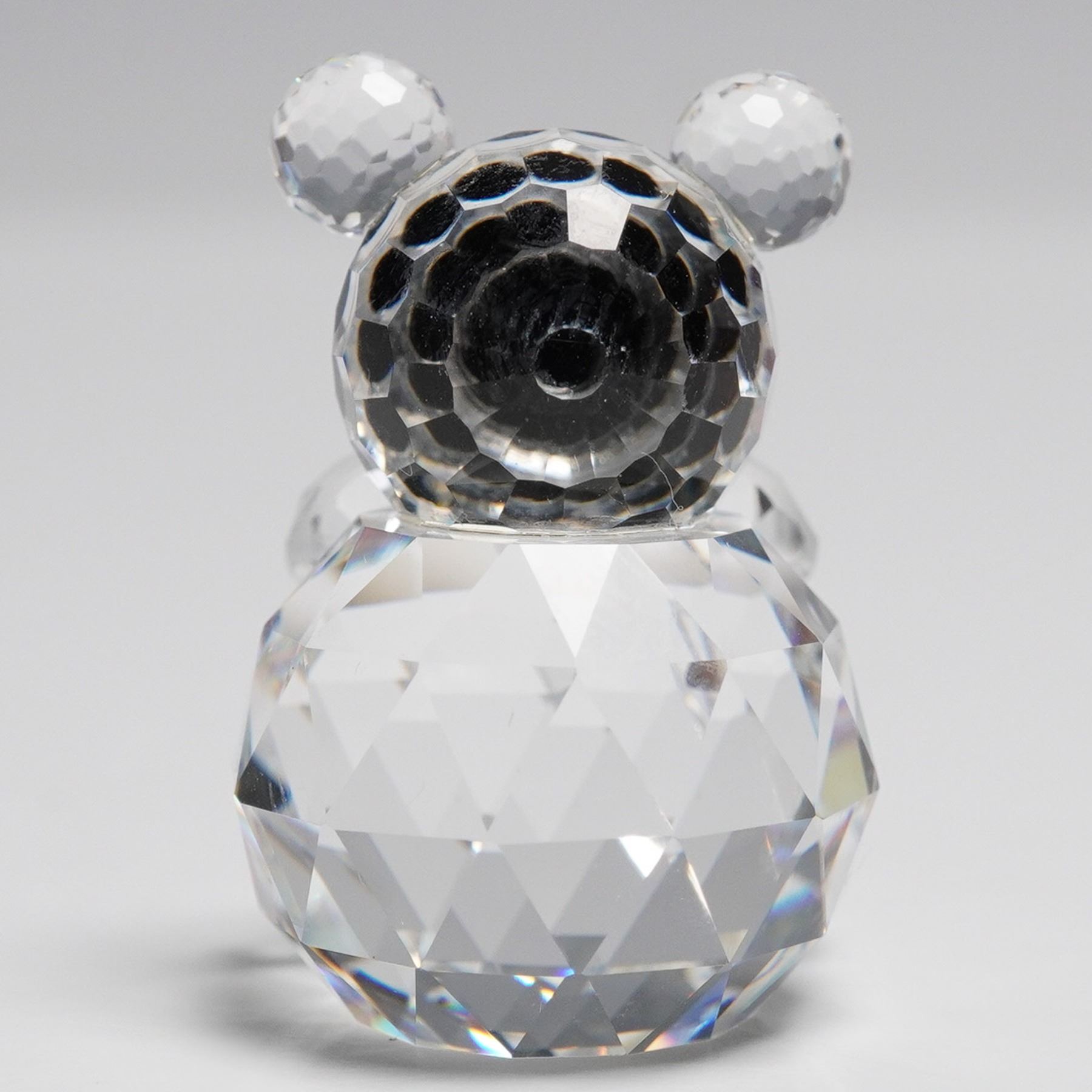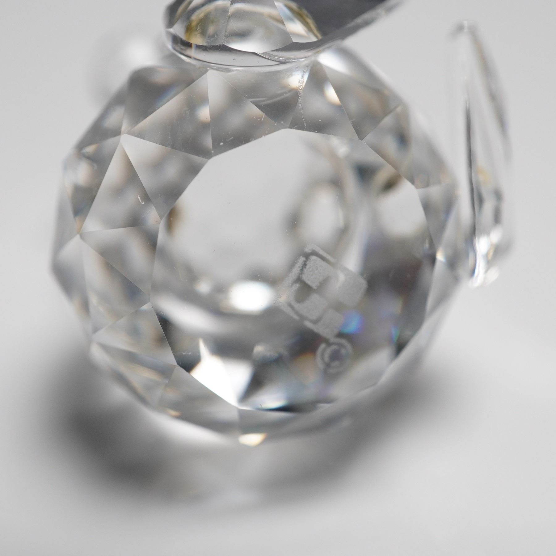 Swarovski Silver Crystal Miniature Bear figurine, featuring a seated bear with clear faceted crystal body and black crystal eyes and nose. This early Swarovski design carries the block SC logo etched on the base. Includes the original gray Swarovski Silver Crystal cylinder box with retro-style logo design. A delightful and collectible piece that captures the classic charm of Swarovski animal figurines. In excellent condition.