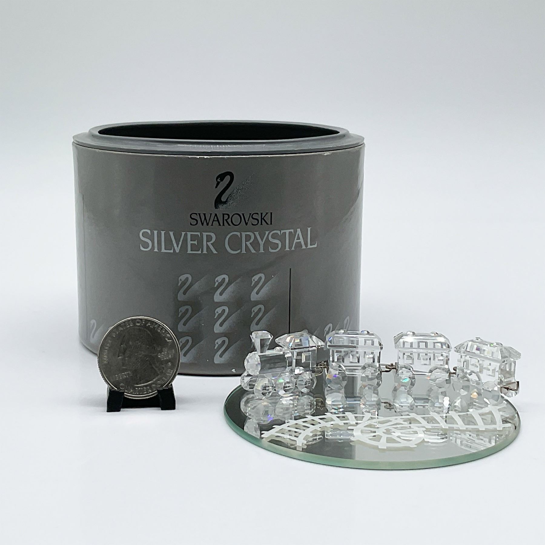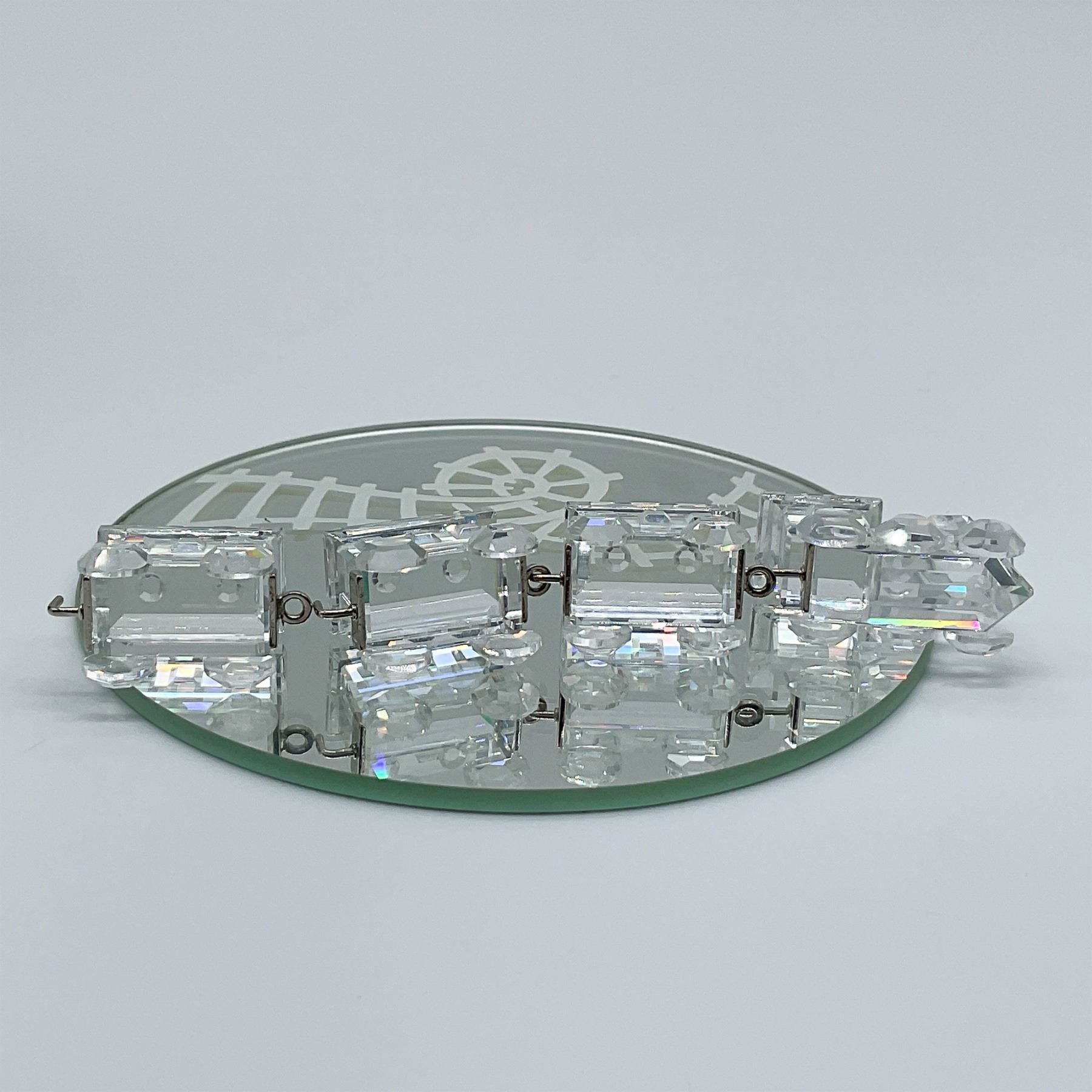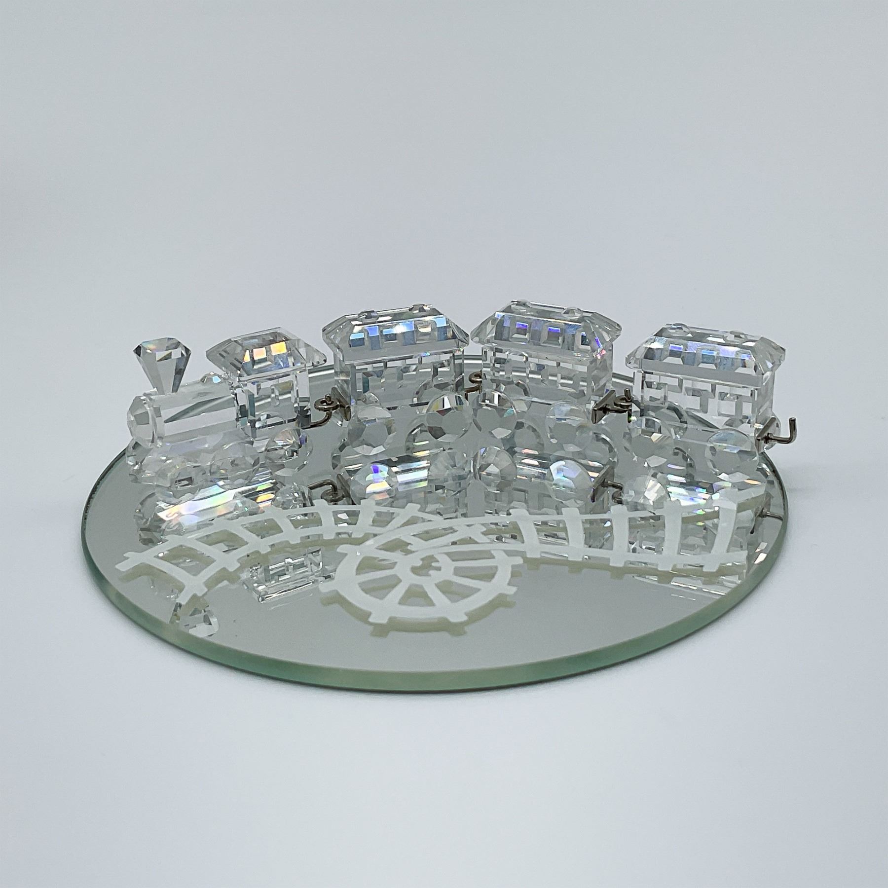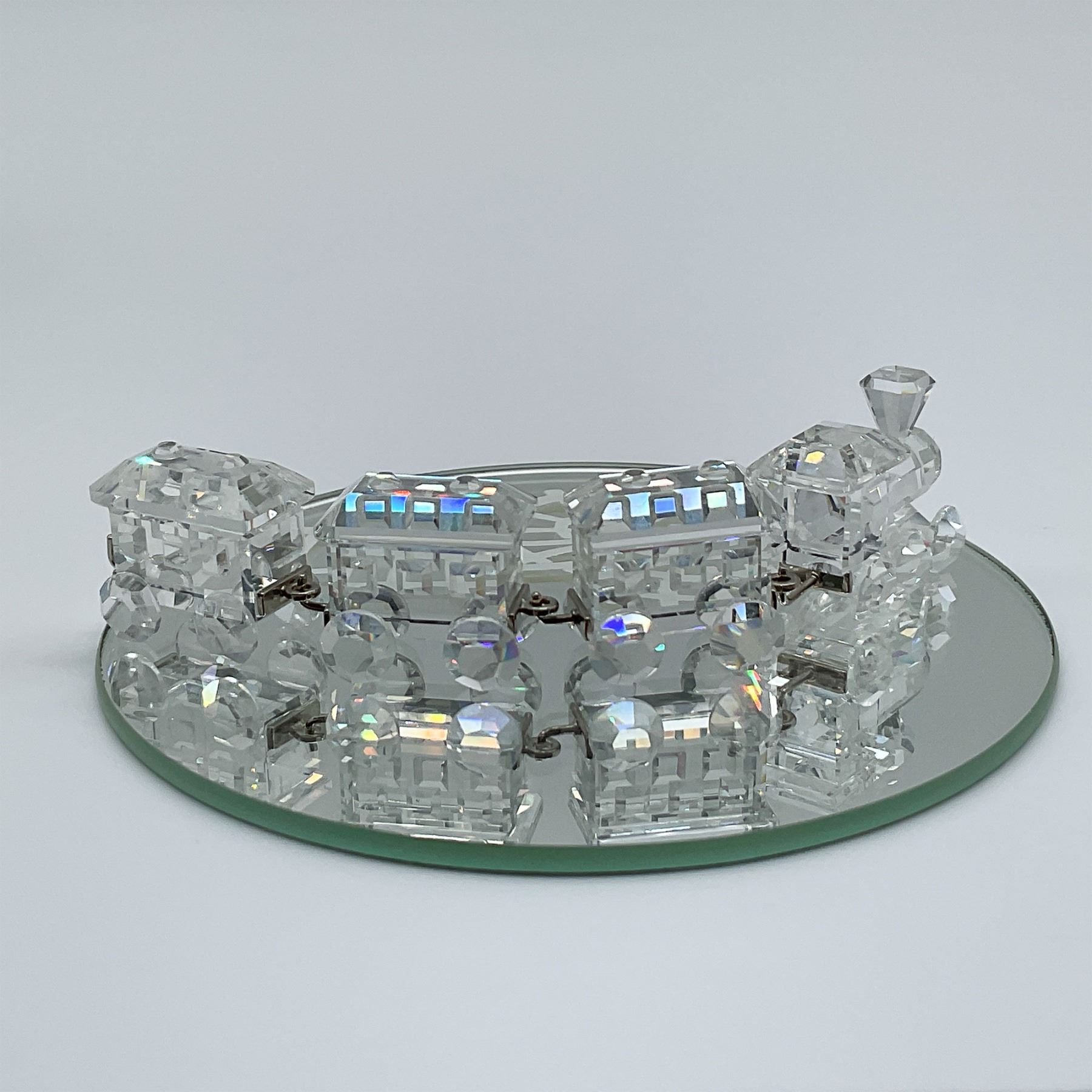 This exquisite Swarovski crystal mini train set, item number 193014, is a stunning miniature creation crafted in clear crystal with intricate detailing. Designed by Gabriele Stamey, the set includes a locomotive and three train carriages, all connected by rhodium-plated metal hooks. The set is displayed on a round mirrored base featuring a frosted track design, enhancing its elegance. Introduced in 1996 and retired in 2005, this charming collectible is part of Swarovski's Crystal Moments collection. Largest train measures 0.75”H. The set is highly sought after by Swarovski collectors for its timeless design and rarity. This item has its original box. This item has a base included.