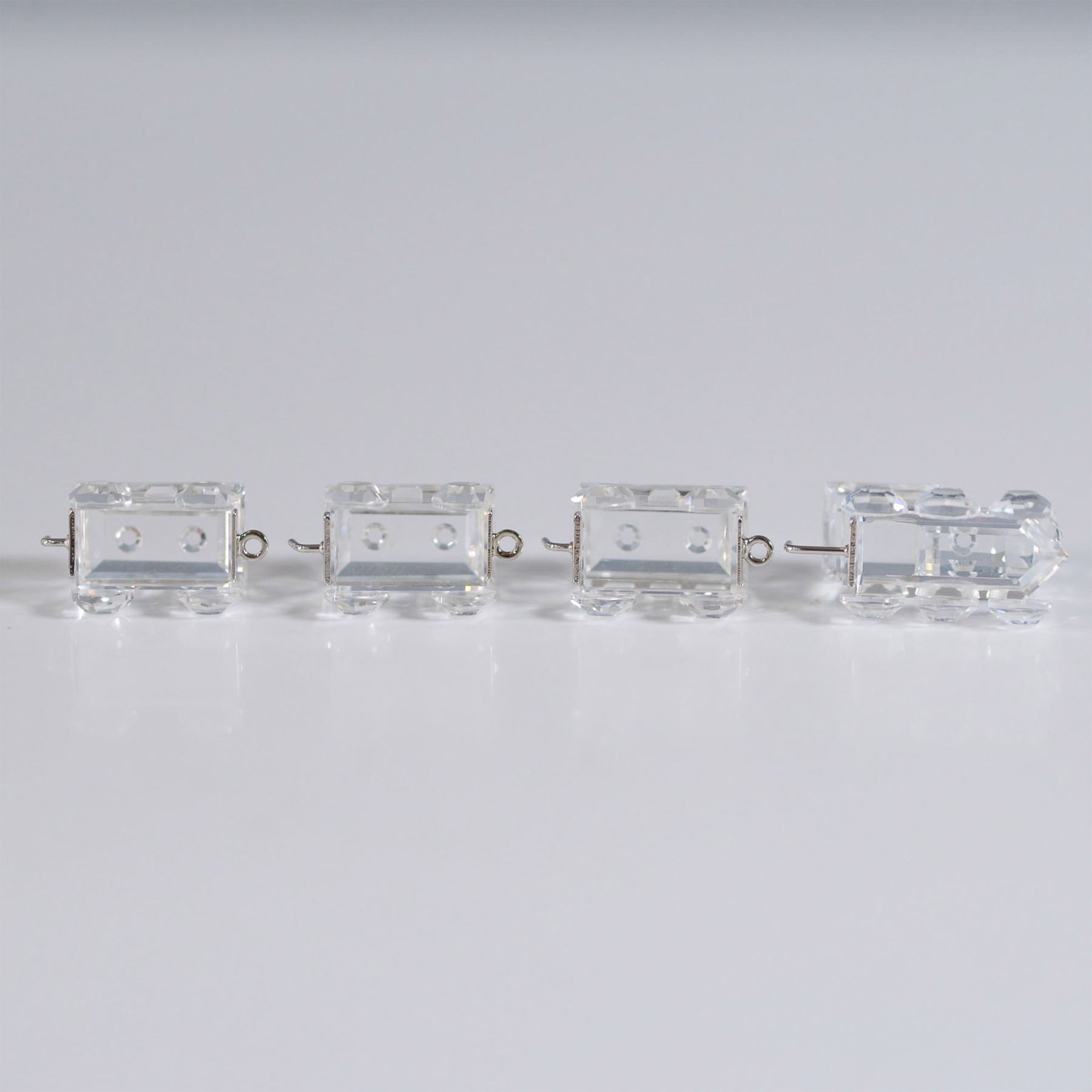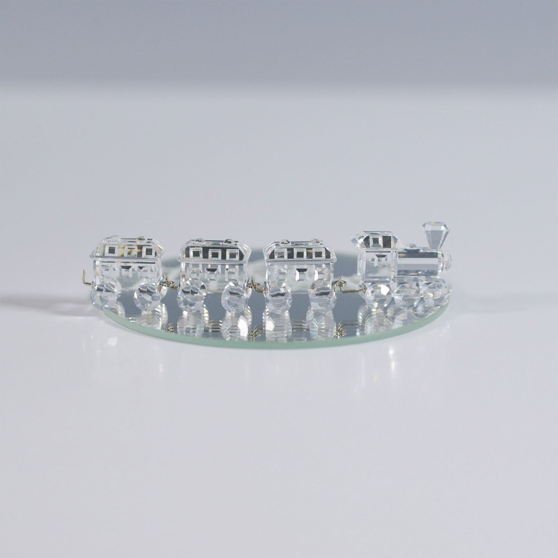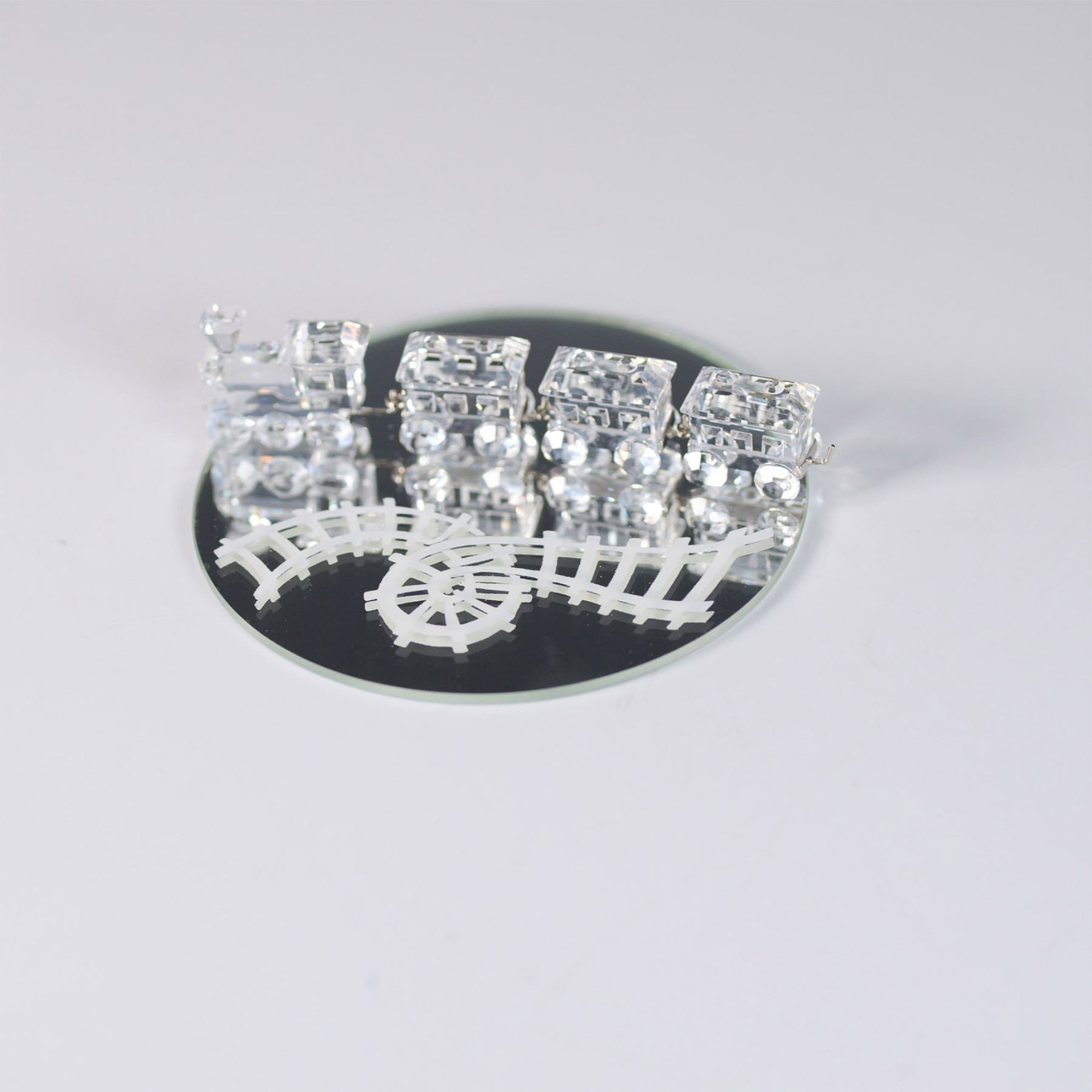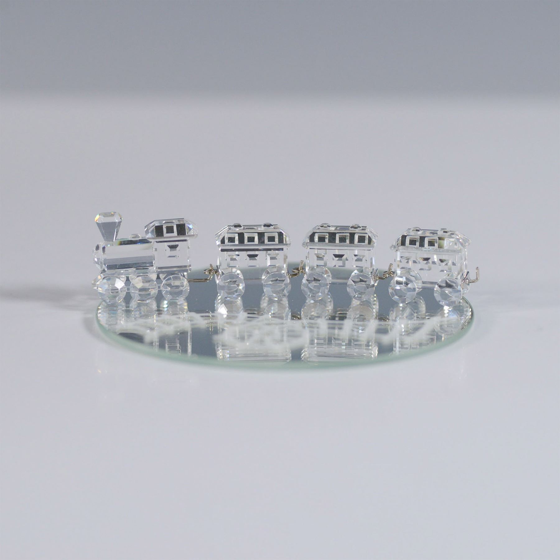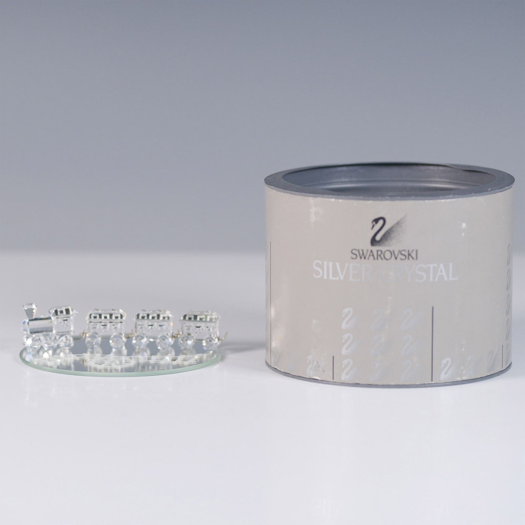 This exquisite Swarovski Silver Crystal Mini Train Set features a five-piece locomotive and cars, crafted in stunning faceted crystal. The delicate train set is complemented by a mirrored base, enhancing its sparkling brilliance. The largest train measures 1.25"L, while the base spans 3.5" in diameter. A charming collector’s piece, it showcases Swarovski’s signature precision-cut craftsmanship and attention to detail. Includes the original box measuring 3"H x 4.25"dia. Marked with the Swarovski acid etching.