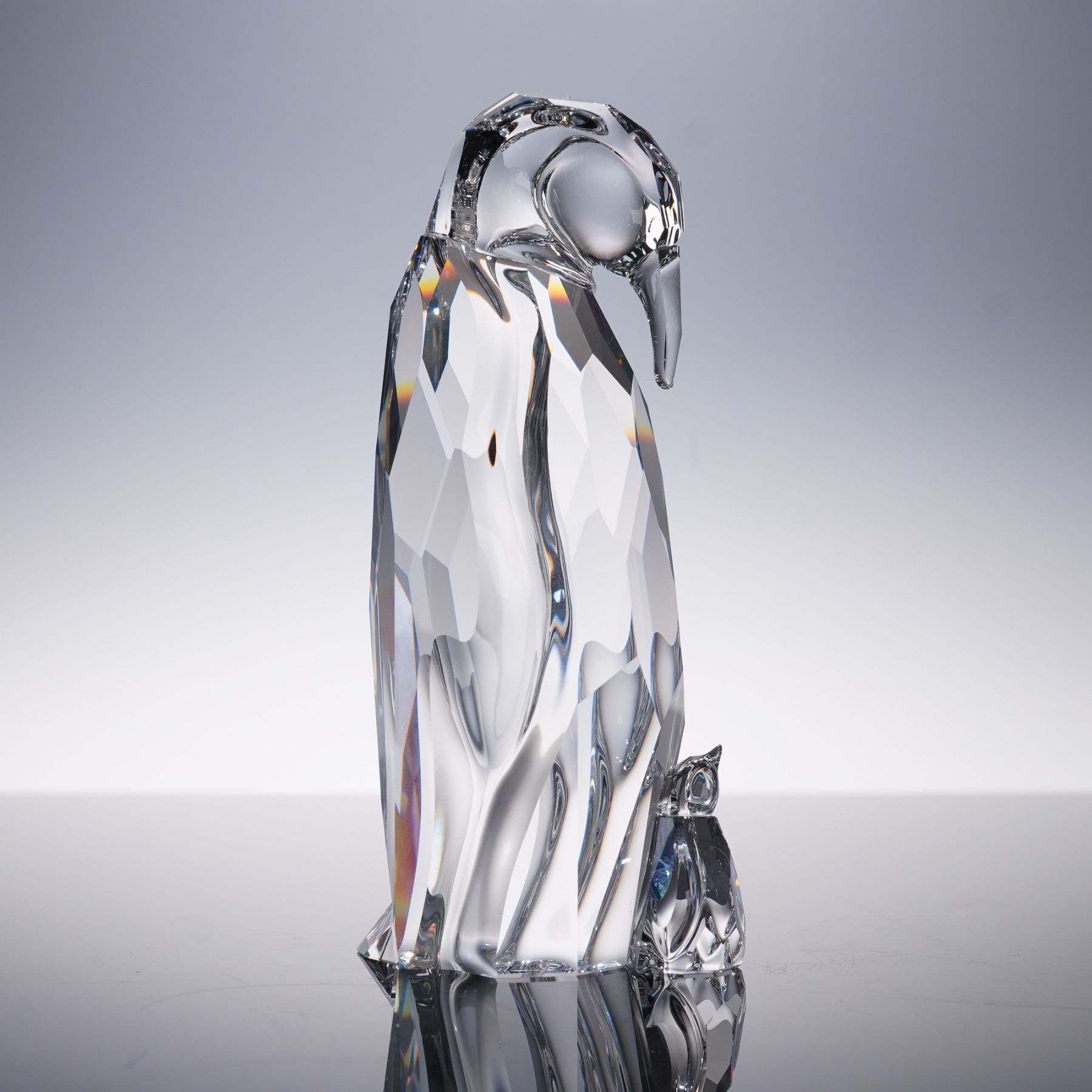 Charismatic crystal figurine depicting a mother penguin with her chick. Rendered in clear faceted crystal with smooth detailing that emphasizes the graceful form of the bird and the tender connection with its young. Swarovski backstamp. This item has its original box.