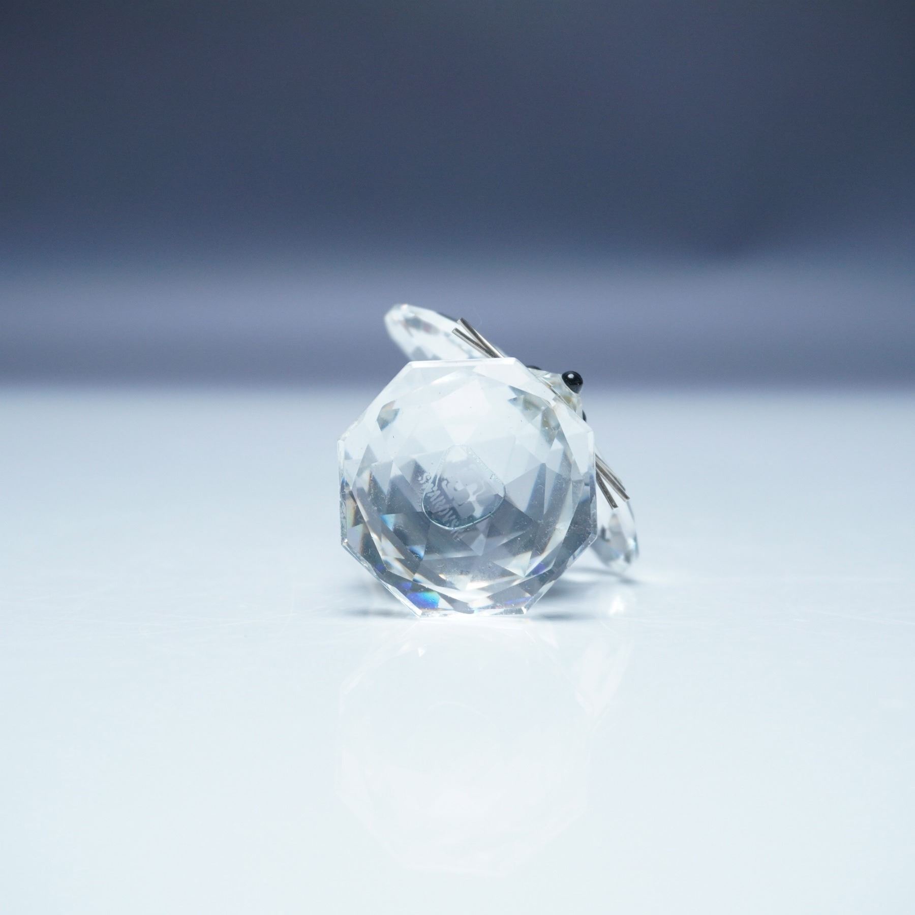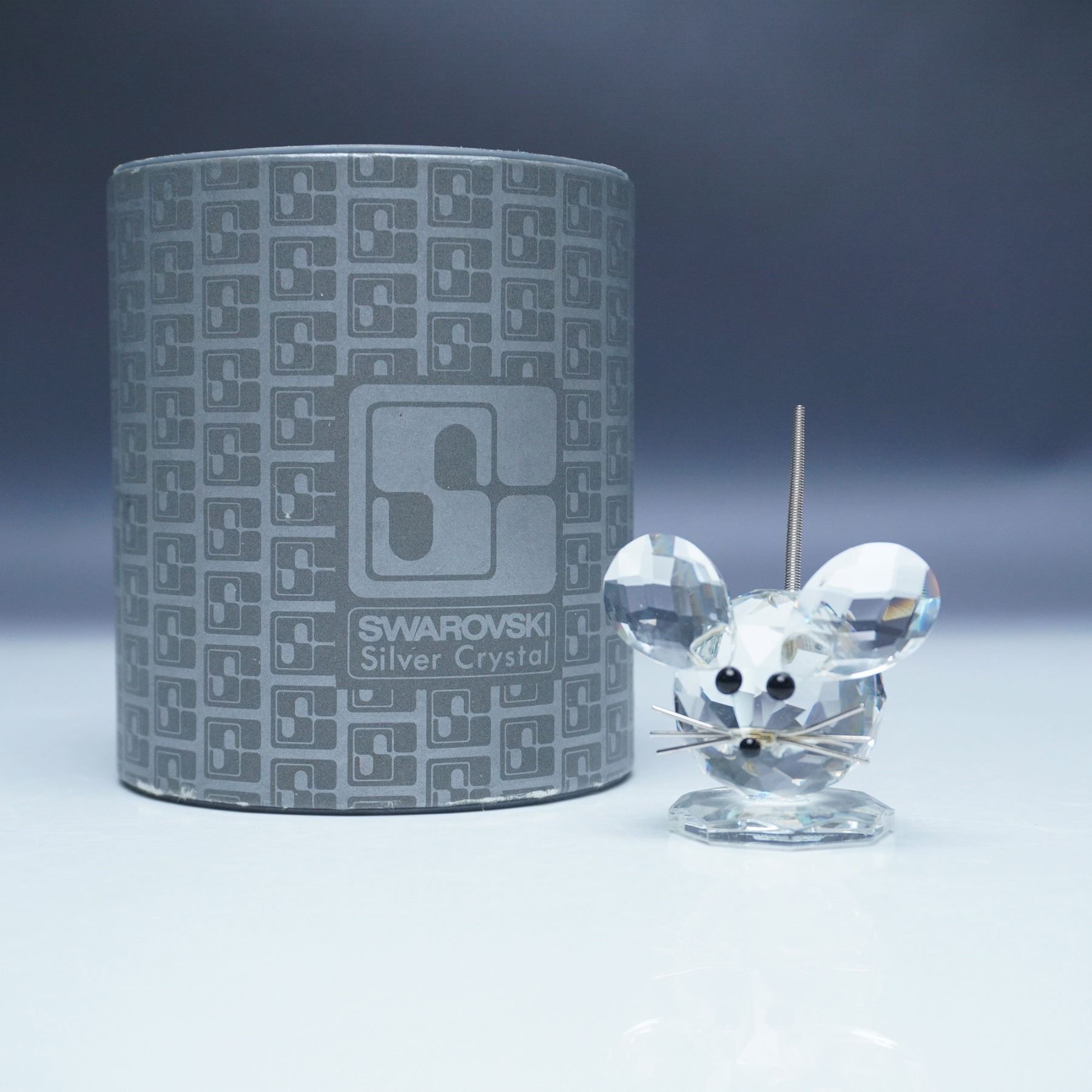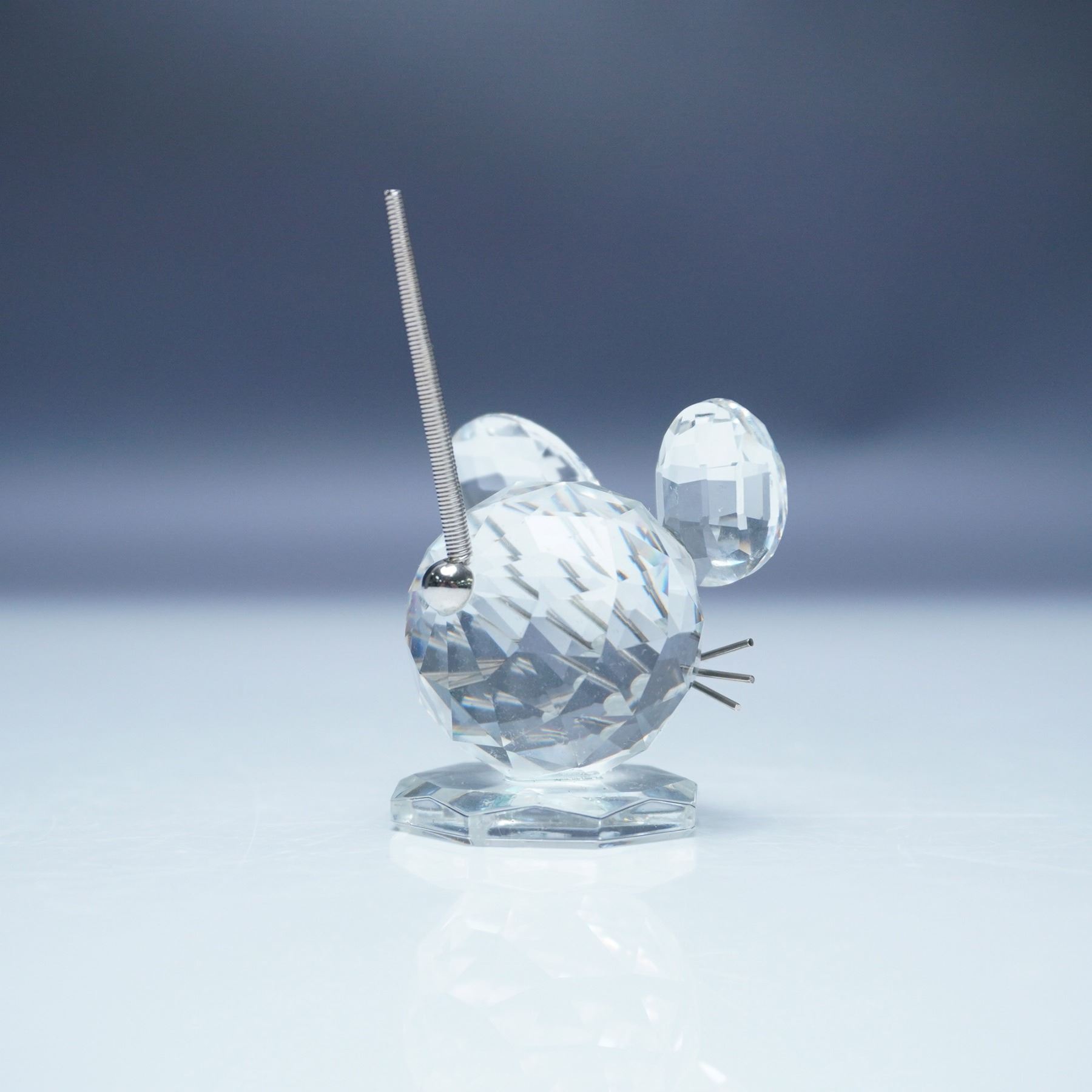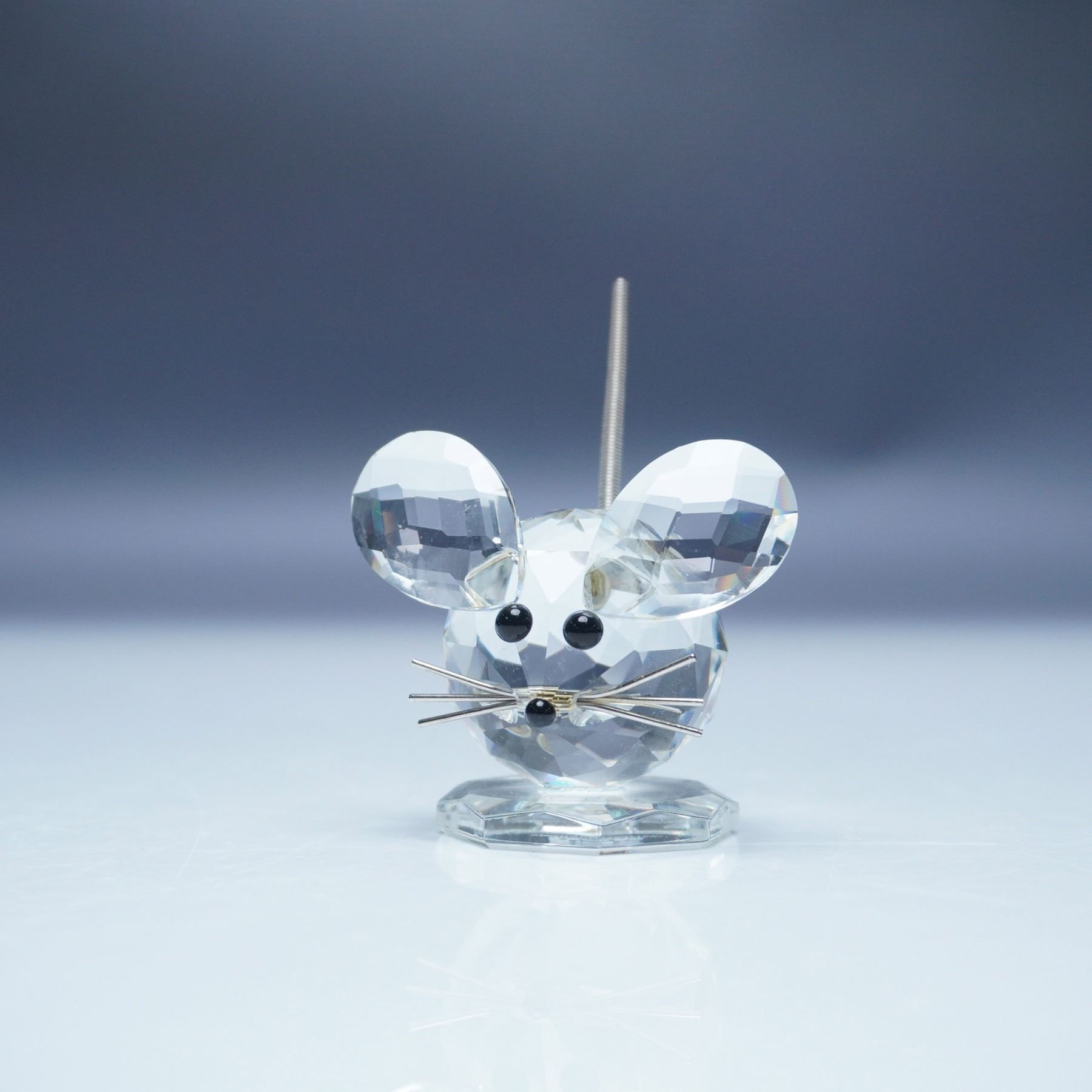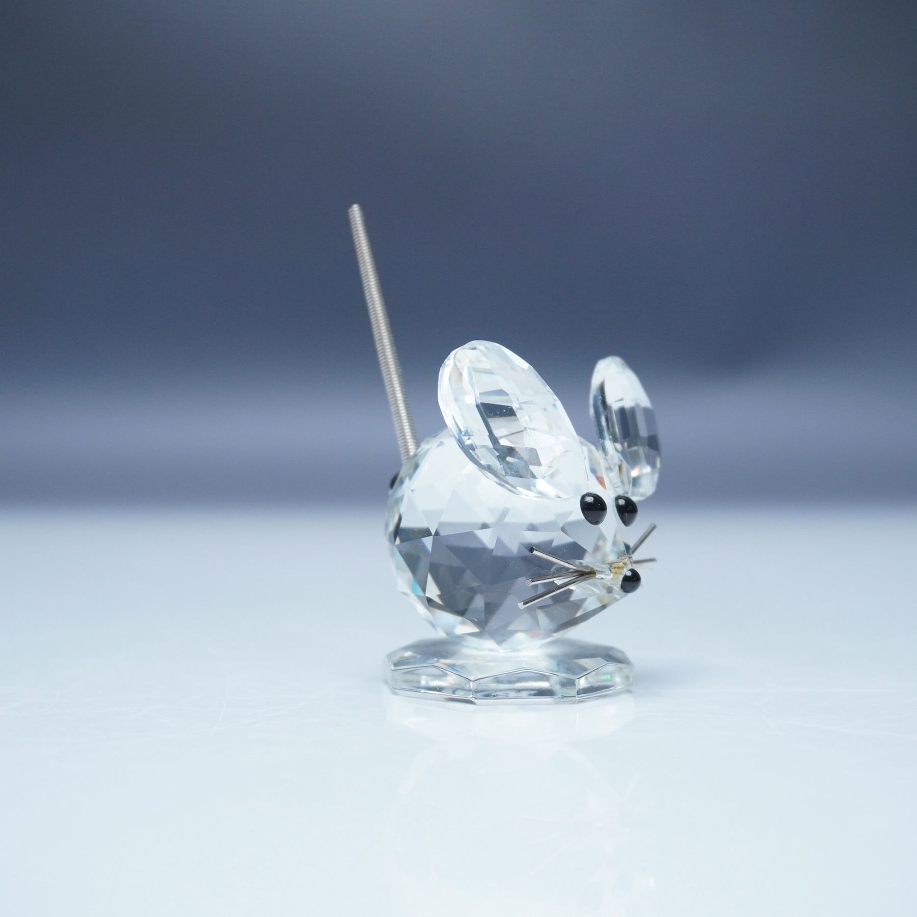 Swarovski crystal figurine depicting an endearing mouse, featuring a faceted clear crystal body with black crystal eyes and a detailed whisker design. This charming piece is accentuated by a sleek metal tail, adding a unique touch to its craftsmanship. The figurine sits on a faceted base and bears the Swarovski acid mark. Includes original packaging.