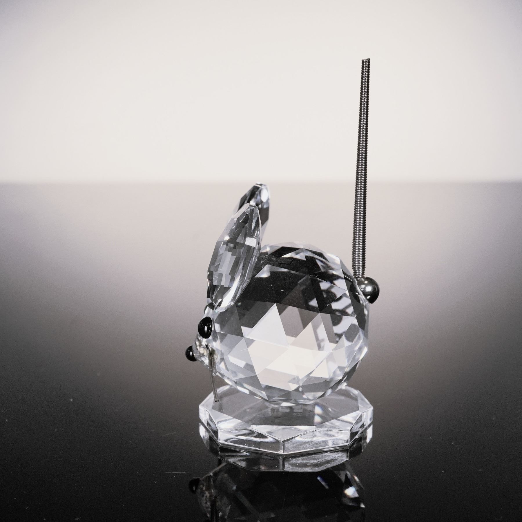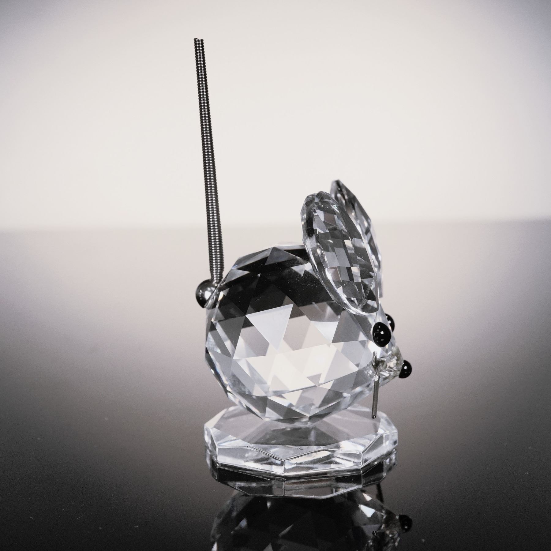 A delightful crystal mouse featuring faceted clear crystal body, large ears, black crystal eyes and nose, accented with fine metal whiskers and a coiled tail. Hallmarked and offered with its original box.