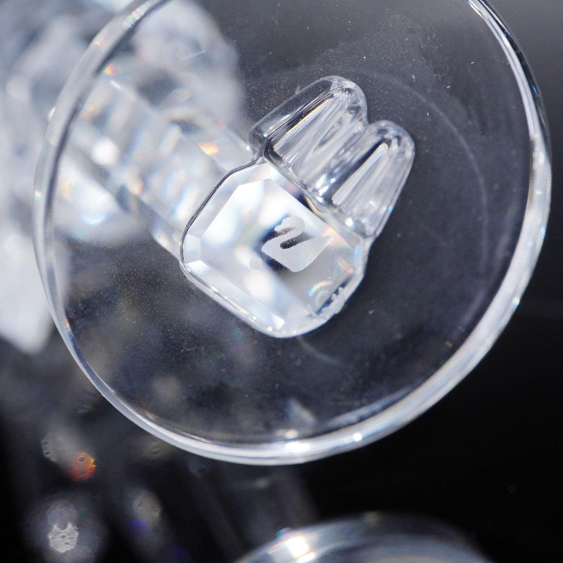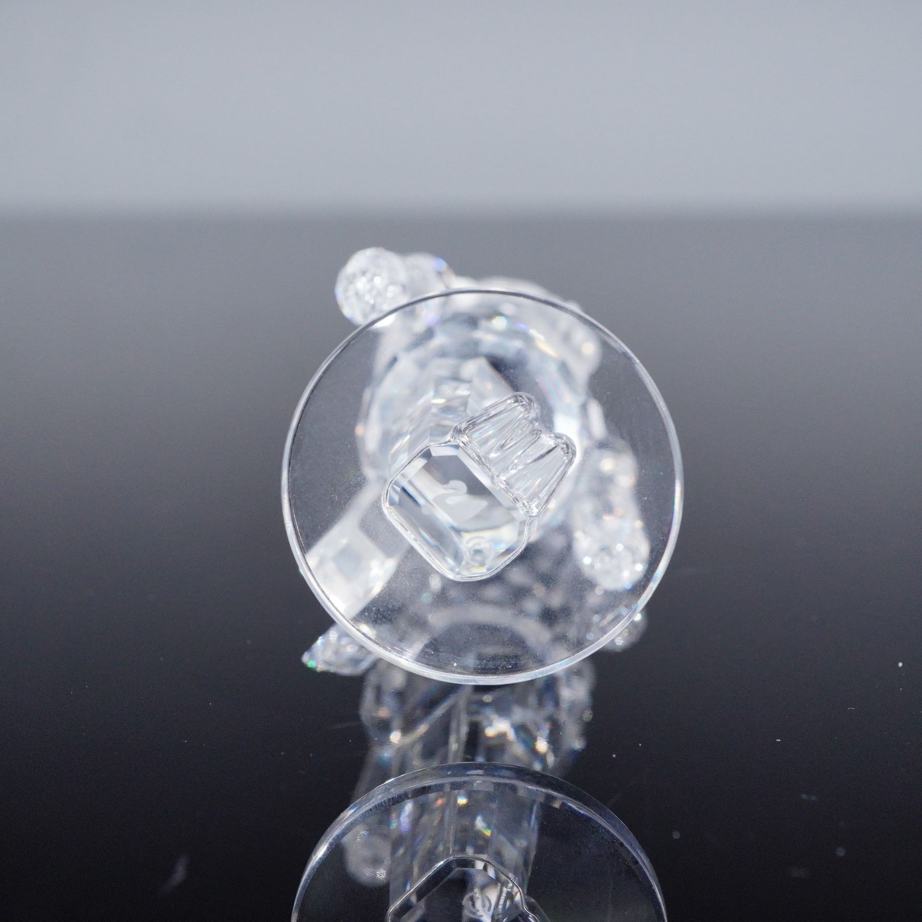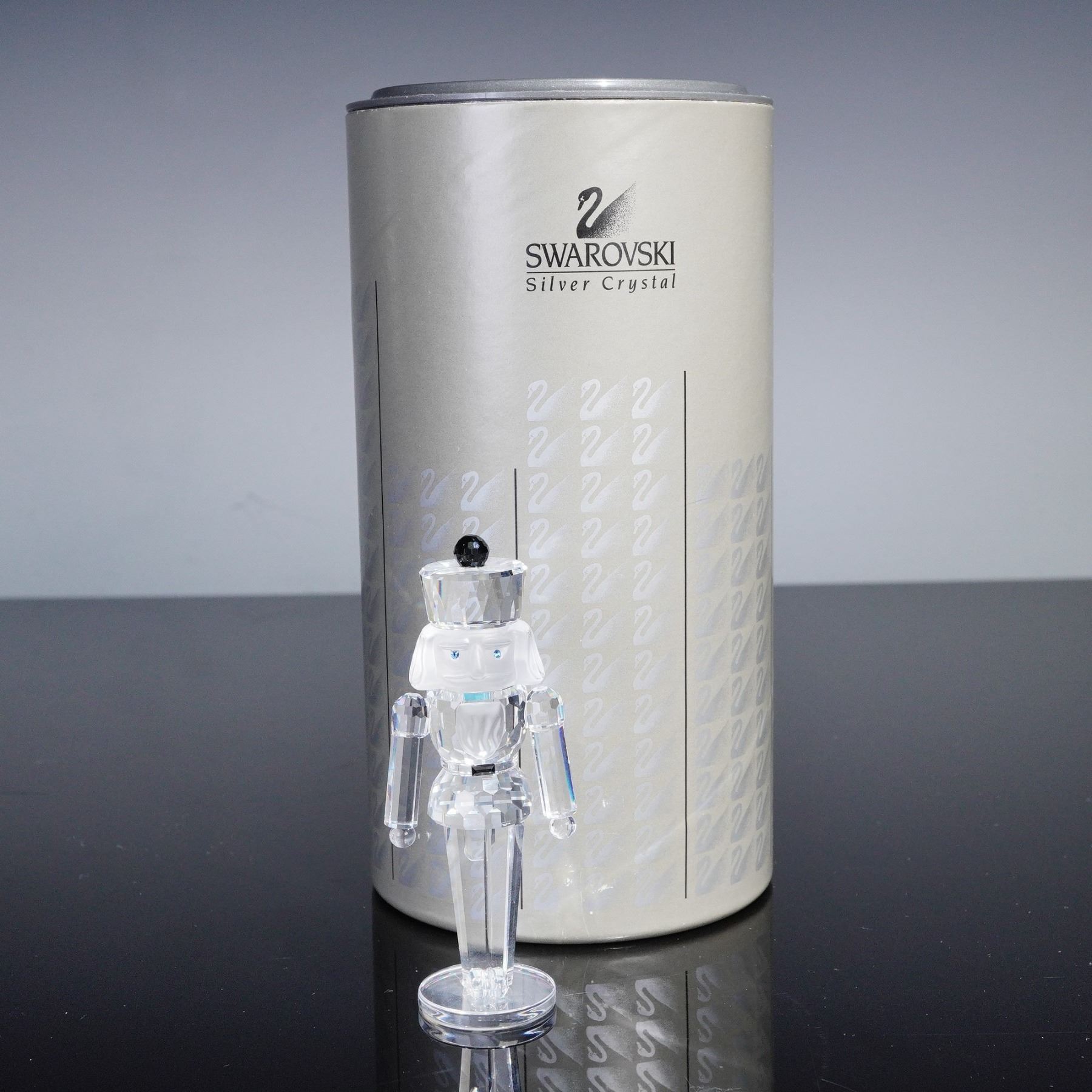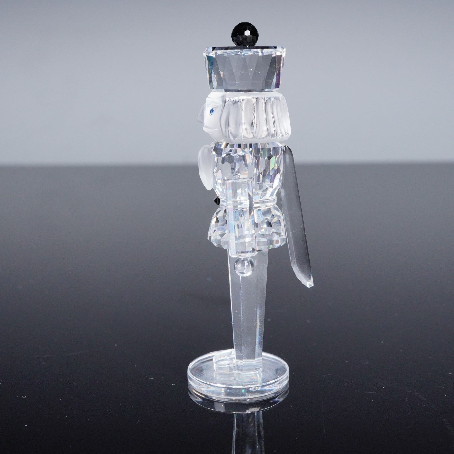 A Swarovski Silver Crystal figurine depicting a Nutcracker soldier, crafted in clear faceted crystal with black and blue accents. The piece shows fine detail in the uniform and headgear, standing on a circular crystal base. Comes with original Swarovski box and retains the etched Swarovski swan backstamp.  Figurine measures 3.25"H. Box measures 6"H x 3.25"dia.