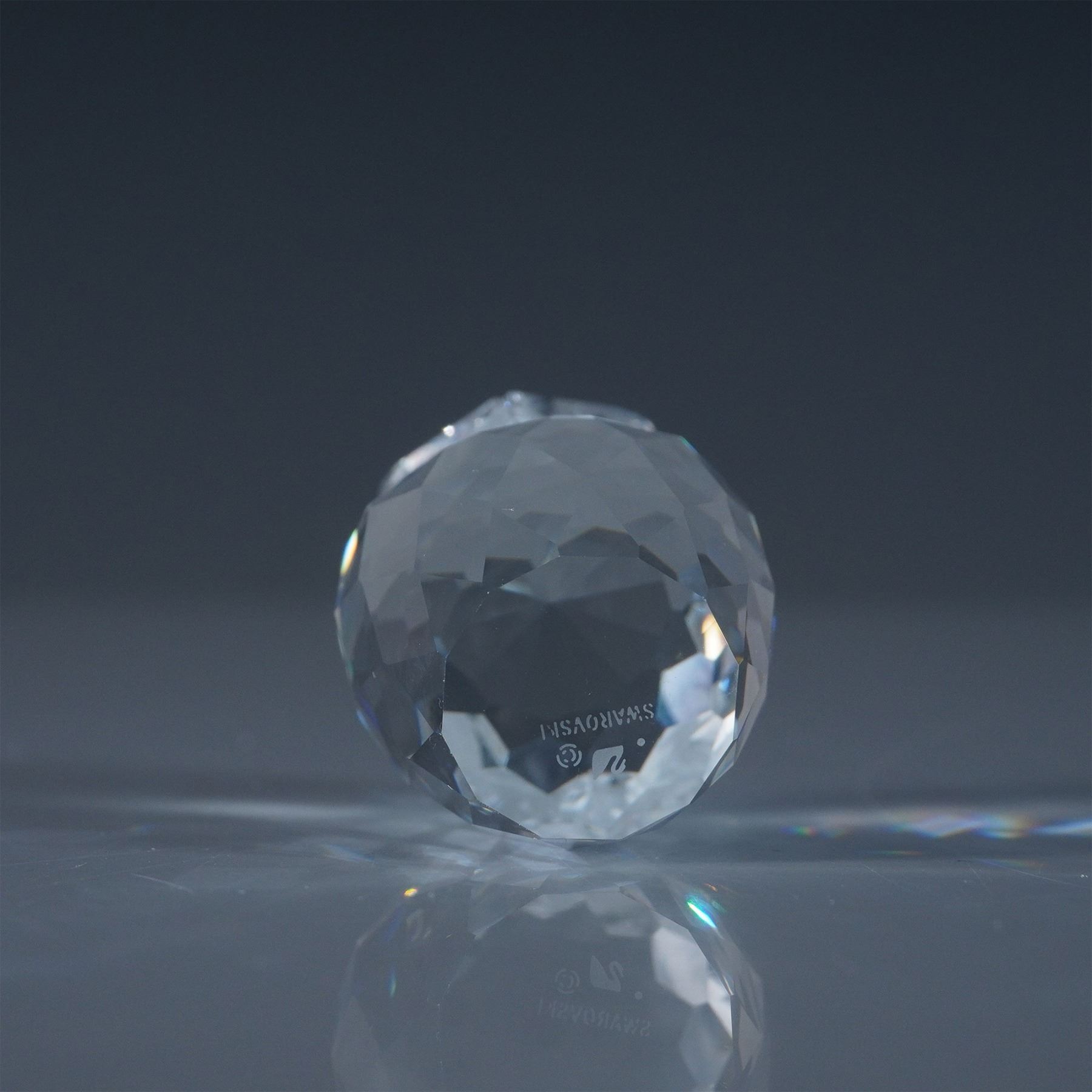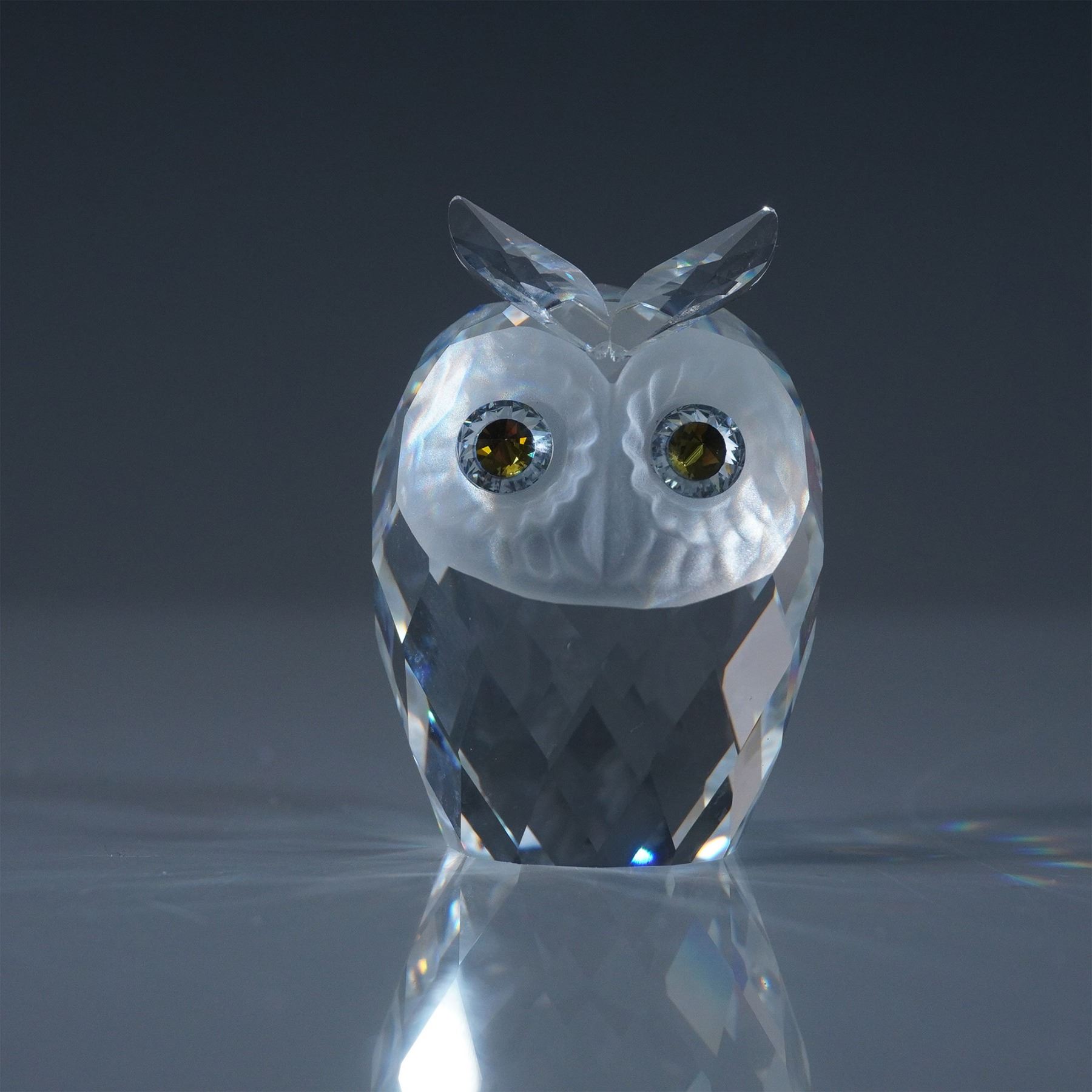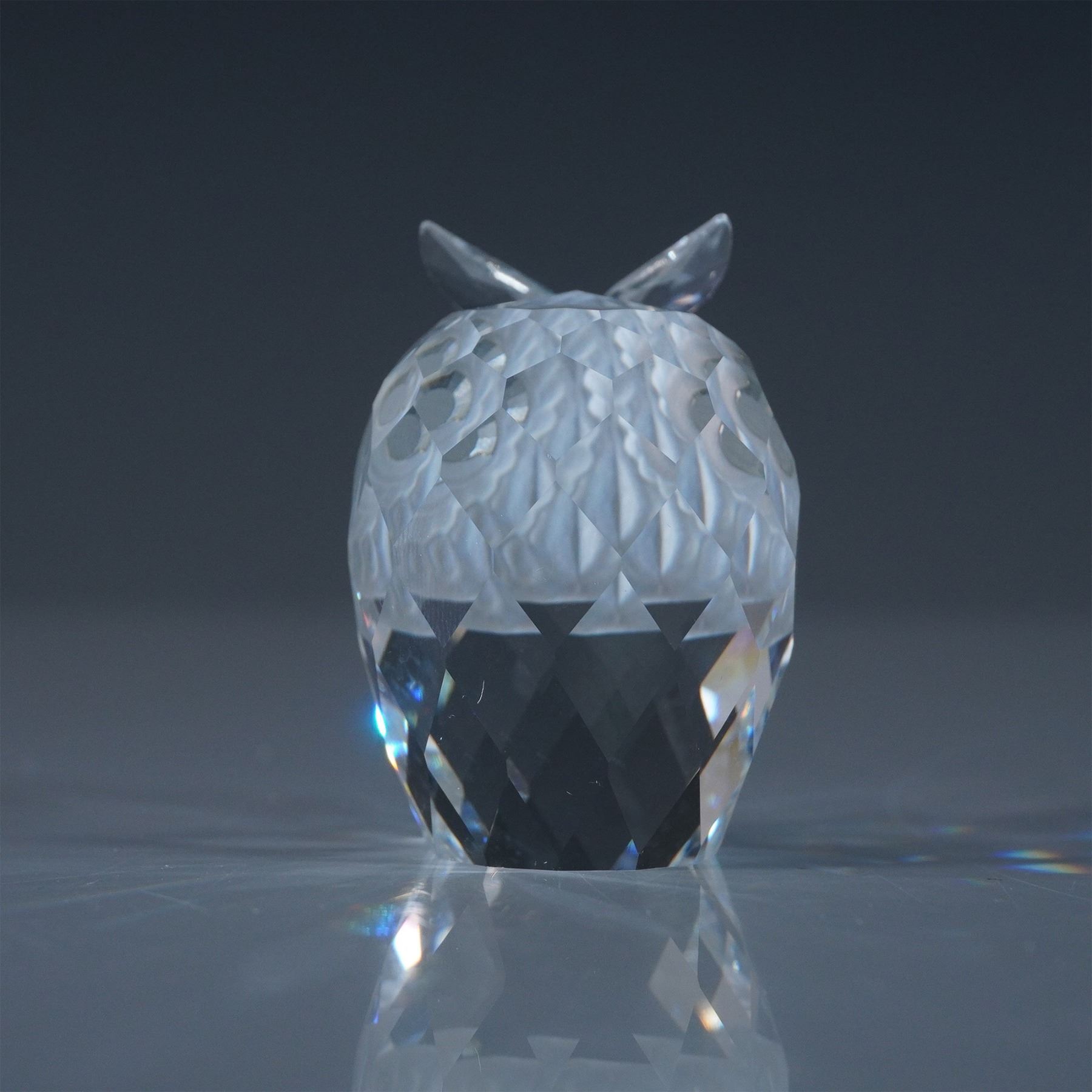 This Swarovski Crystal Owl figurine captures the mystique and wisdom of this nocturnal bird in brilliant faceted crystal. Featuring deep-cut eyes accented with golden hues and a frosted crystal face, this piece showcases intricate craftsmanship. The owl's body is crafted in faceted clear crystal, reflecting light beautifully. Measuring 2"H, this elegant figurine is marked with the Swarovski logo and is a striking addition to any collection.