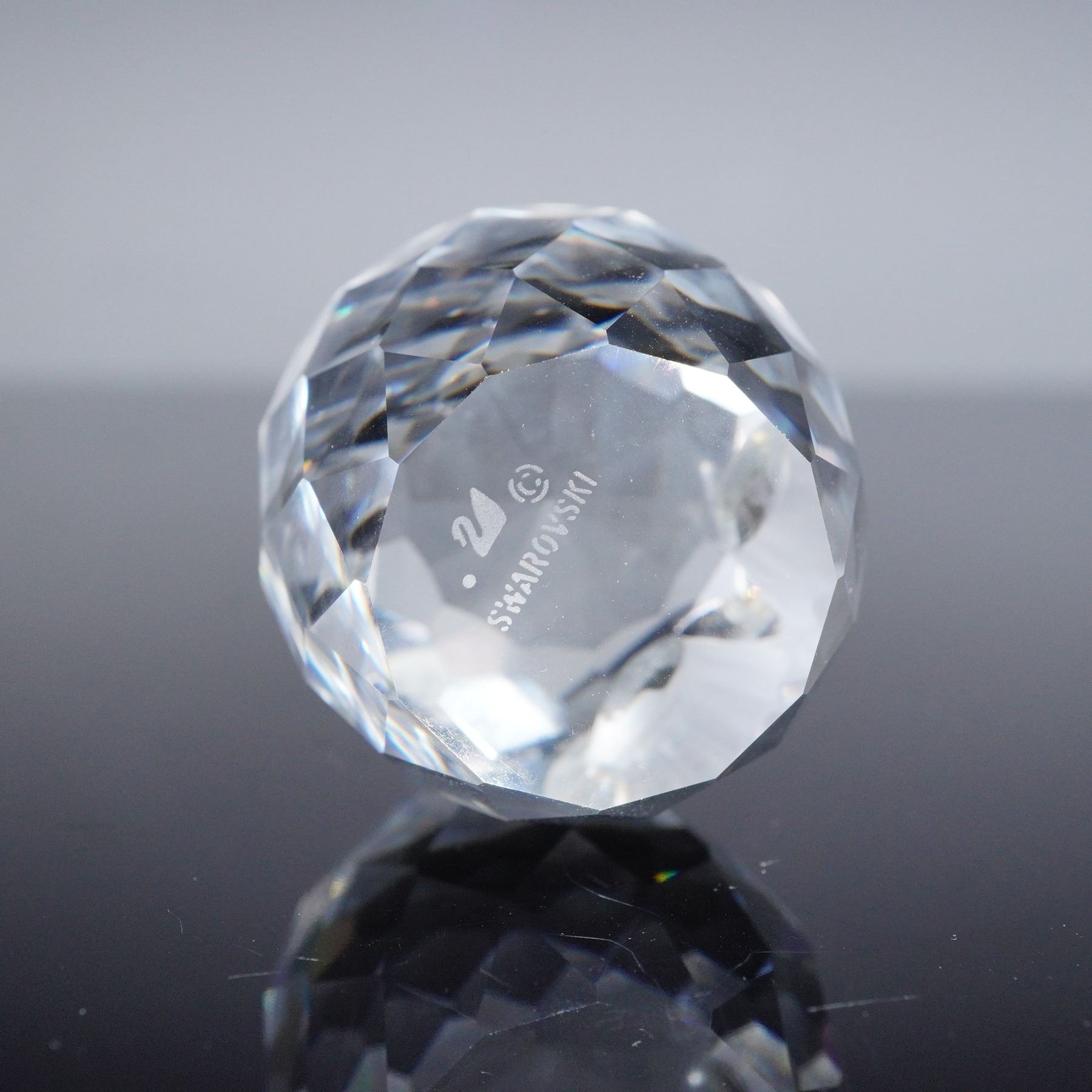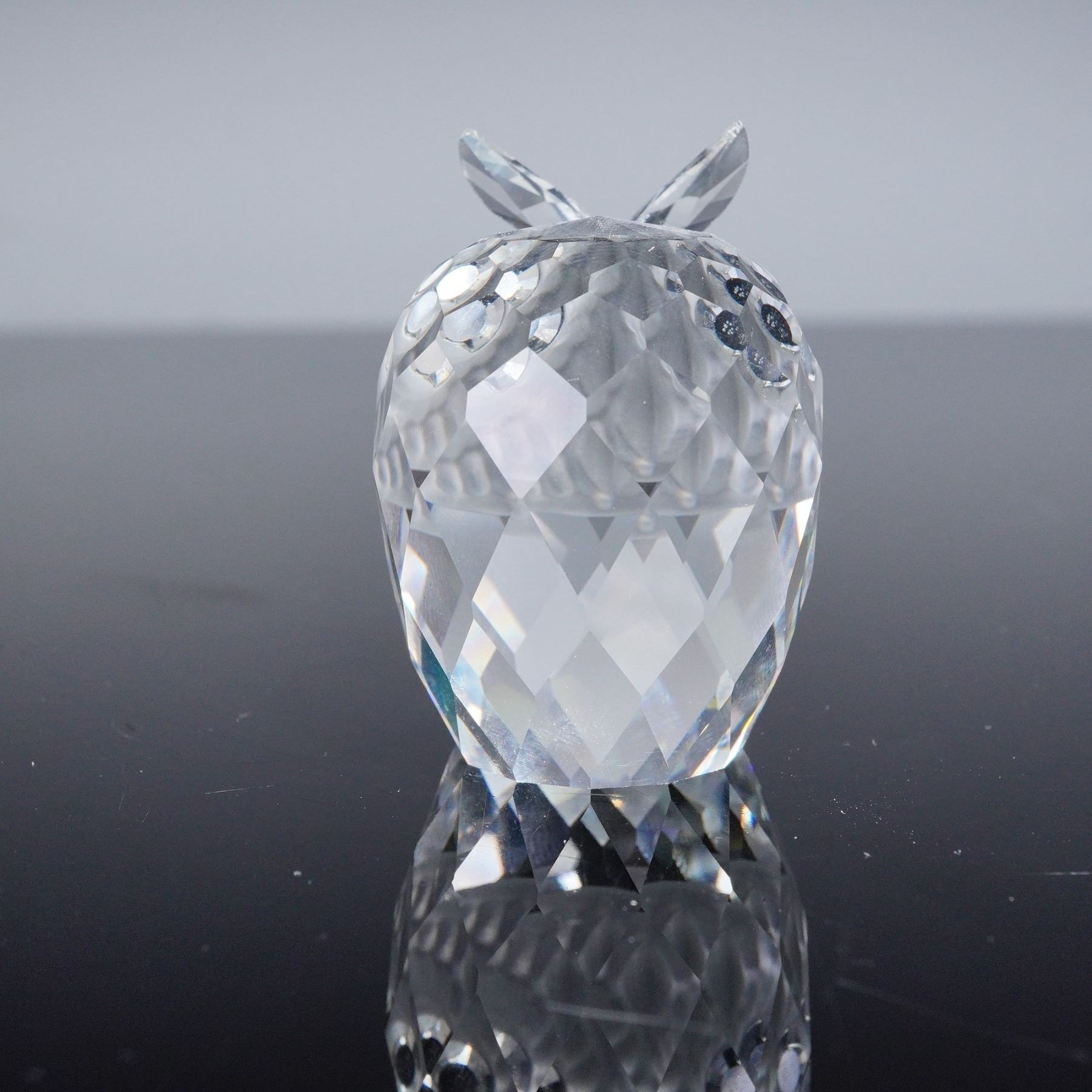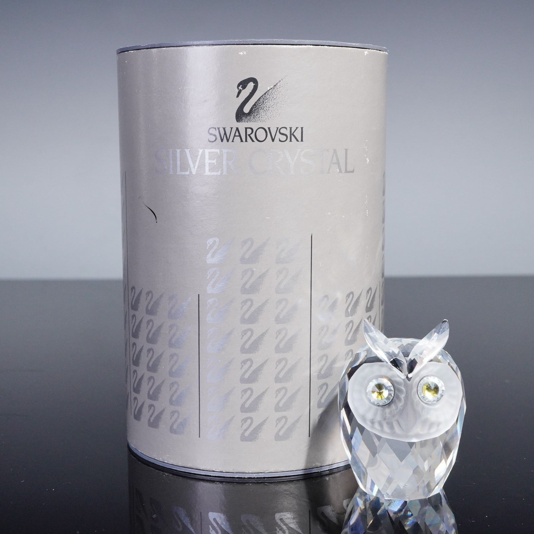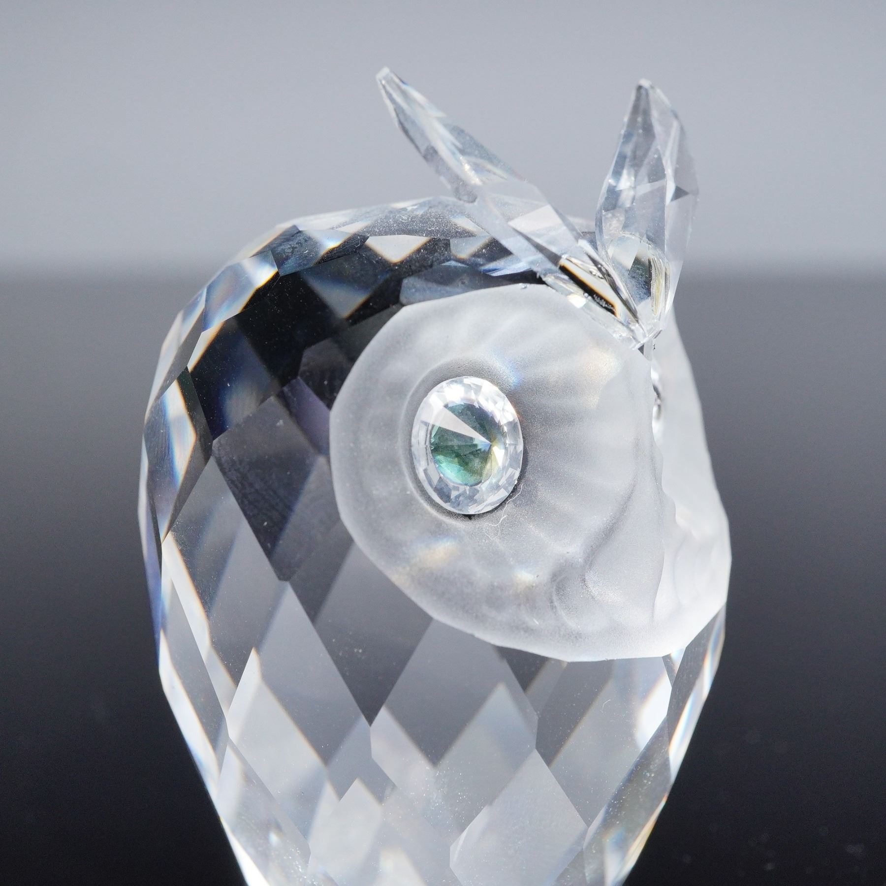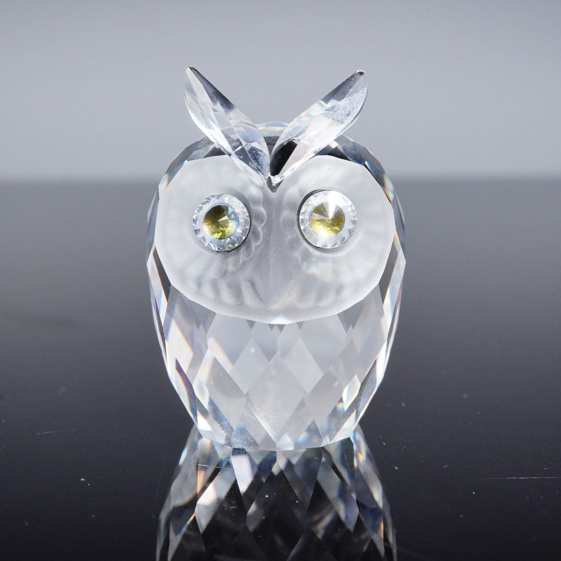Presented here is a Swarovski crystal figurine of a small owl, finely crafted in clear faceted crystal with frosted detailing around the face and sparkling crystal eyes. The piece is hallmarked and includes its original box, an appealing collectible for display or gift giving.