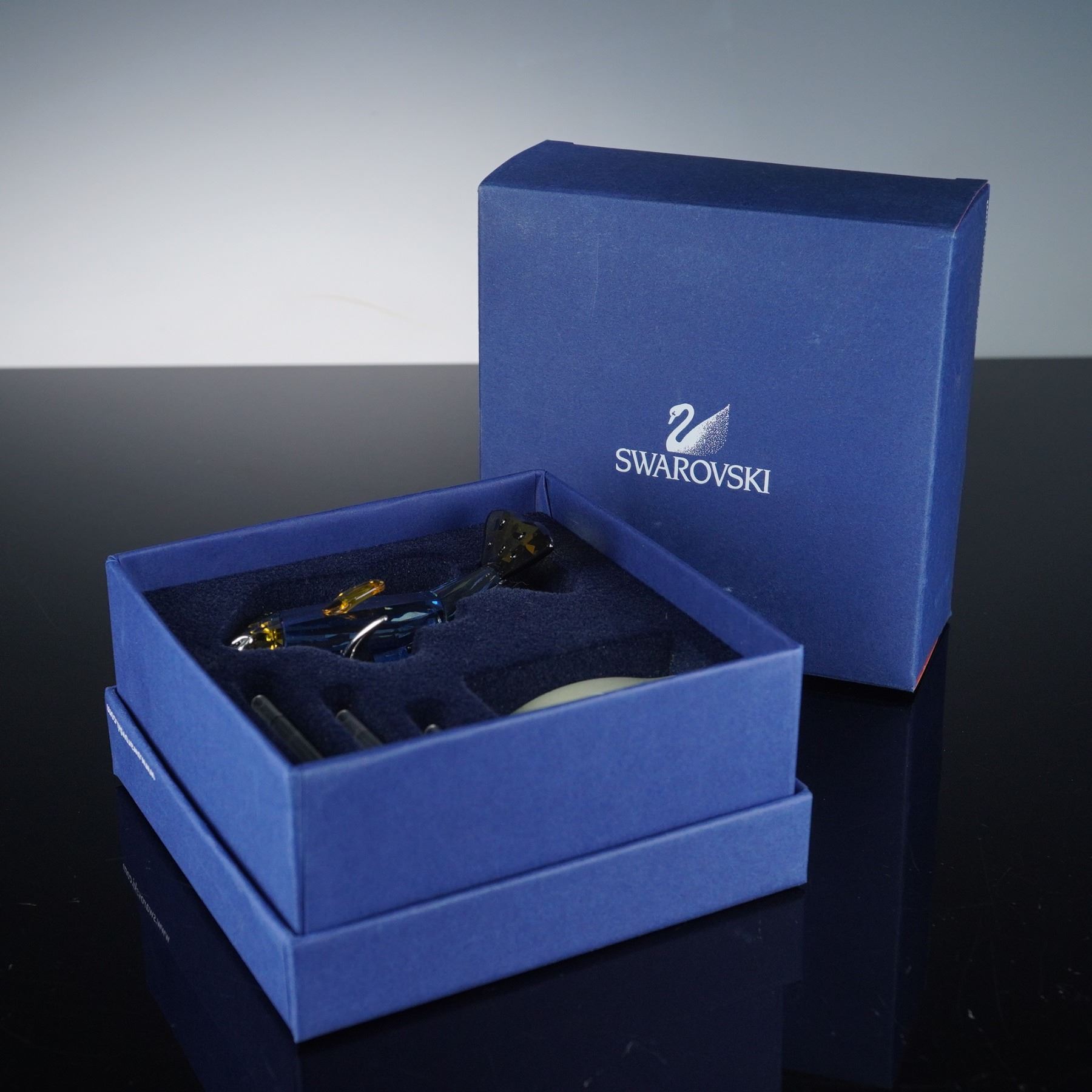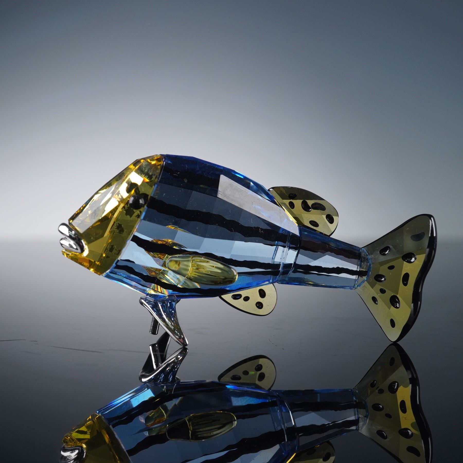 Vibrant Swarovski Crystal Paradise Collection Catumbela Fish designed by Yasmine Hurel. This striking figurine features a bold combination of blue, yellow, and clear crystal accented with jet-black enamel details on the fins and tail. Set upon a clear crystal stand with a frosted base, the piece beautifully captures the motion and grace of tropical aquatic life. Part of the exclusive Paradise Collection, the Catumbela fish is known for its brilliant coloration and sleek, geometric form, a testament to Swarovski's artistry and precision cutting. Complete with Swan logo etching and presented in its original blue Swarovski box with fitted foam insert. 656974.