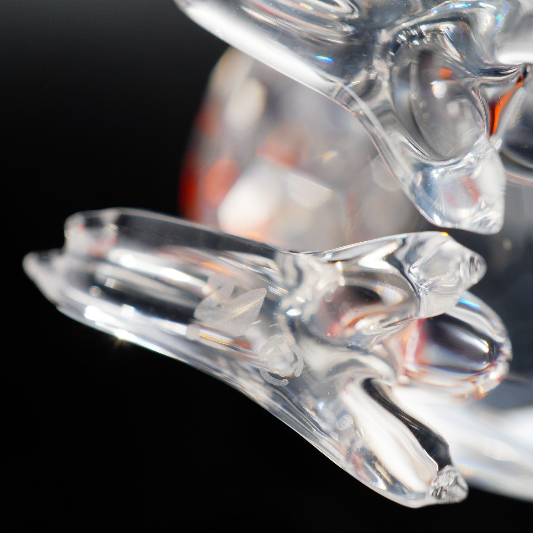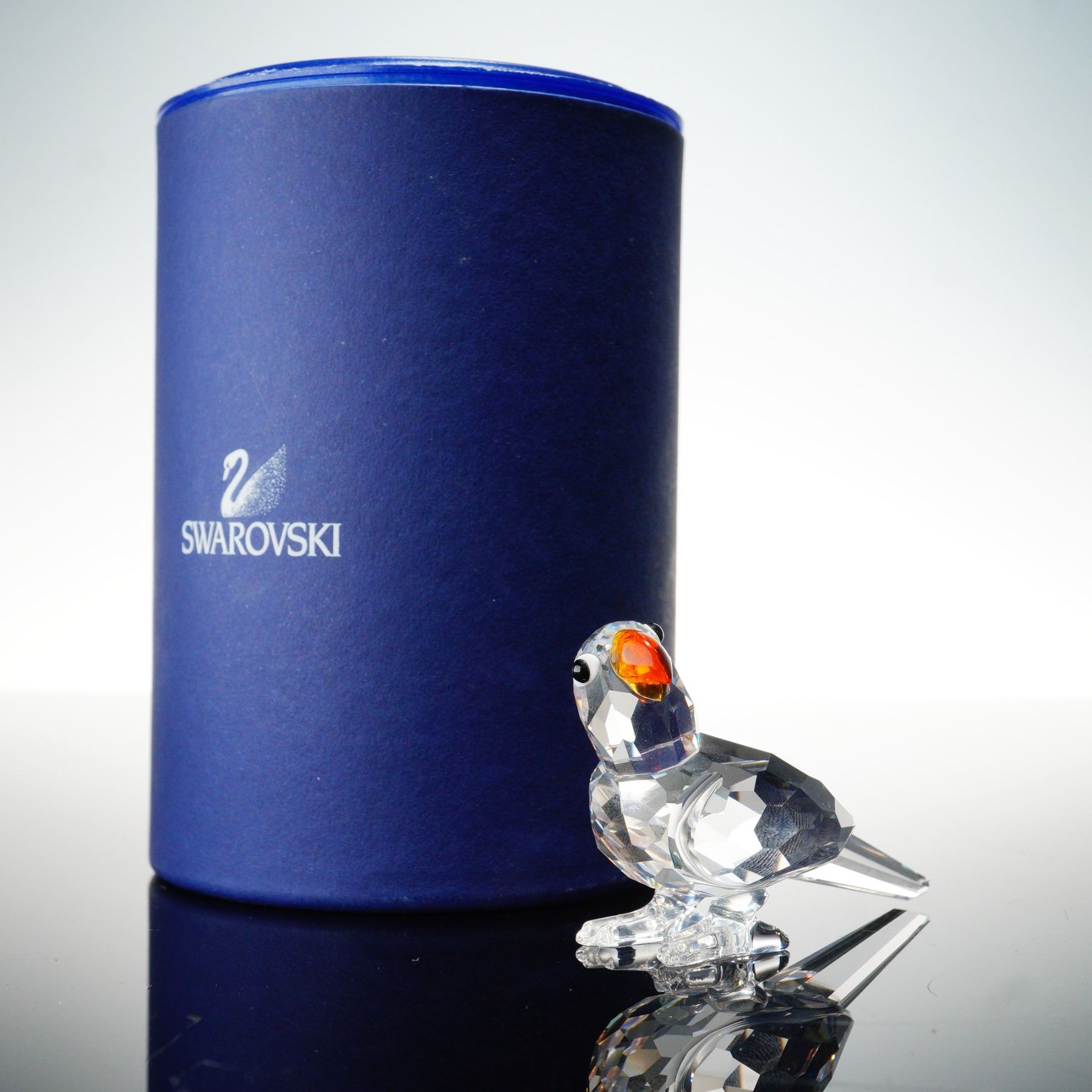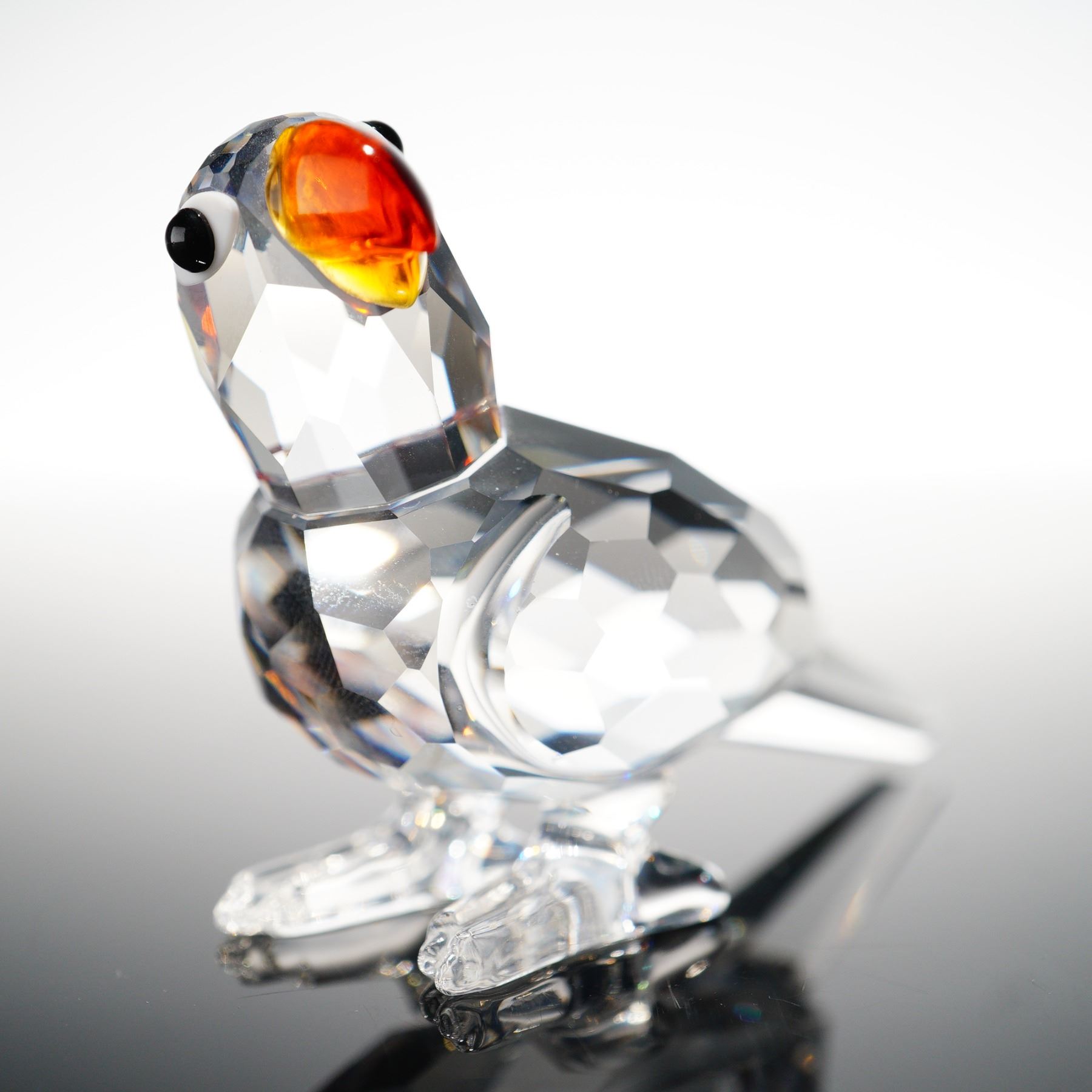 This Swarovski crystal parrot is crafted from clear crystal with a vibrant fire opal-colored beak. It is part of the Feathered Beauties collection. Includes original box. Swarovski Backstamp.