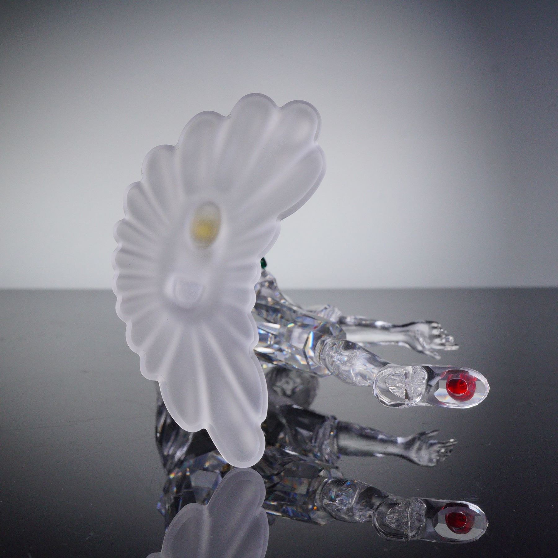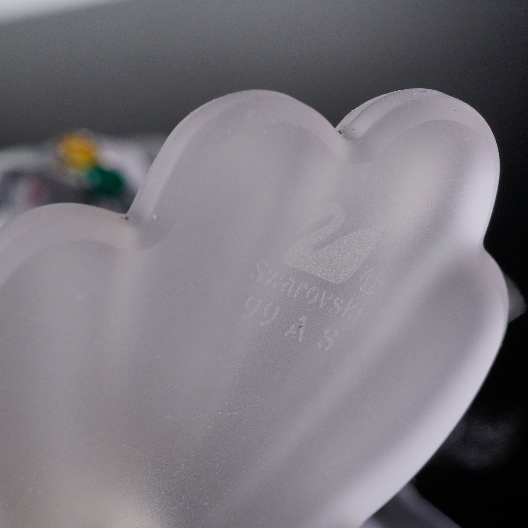 This beautifully crafted Swarovski Crystal Pierrot clown figurine features faceted clear crystal with colorful red, green, and yellow buttons on the costume. The whimsical figure is mounted on a red and gold base, capturing the elegance of the traditional Pierrot clown. The piece includes its original box and is marked with the Swarovski backstamp.