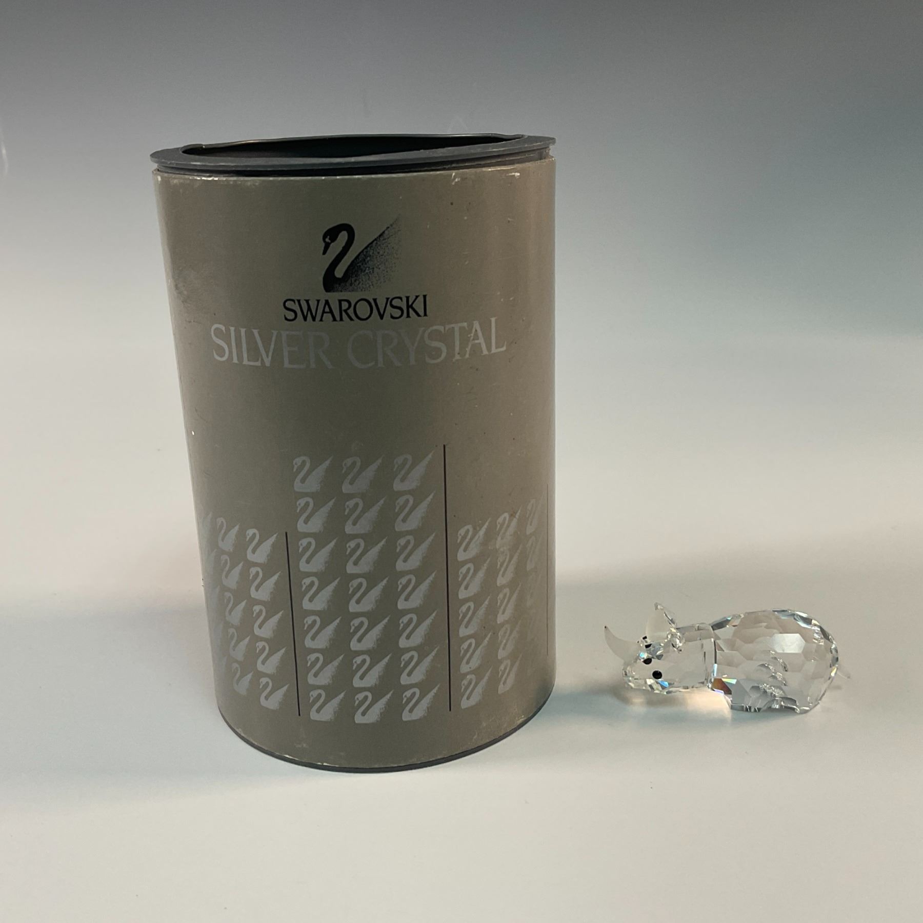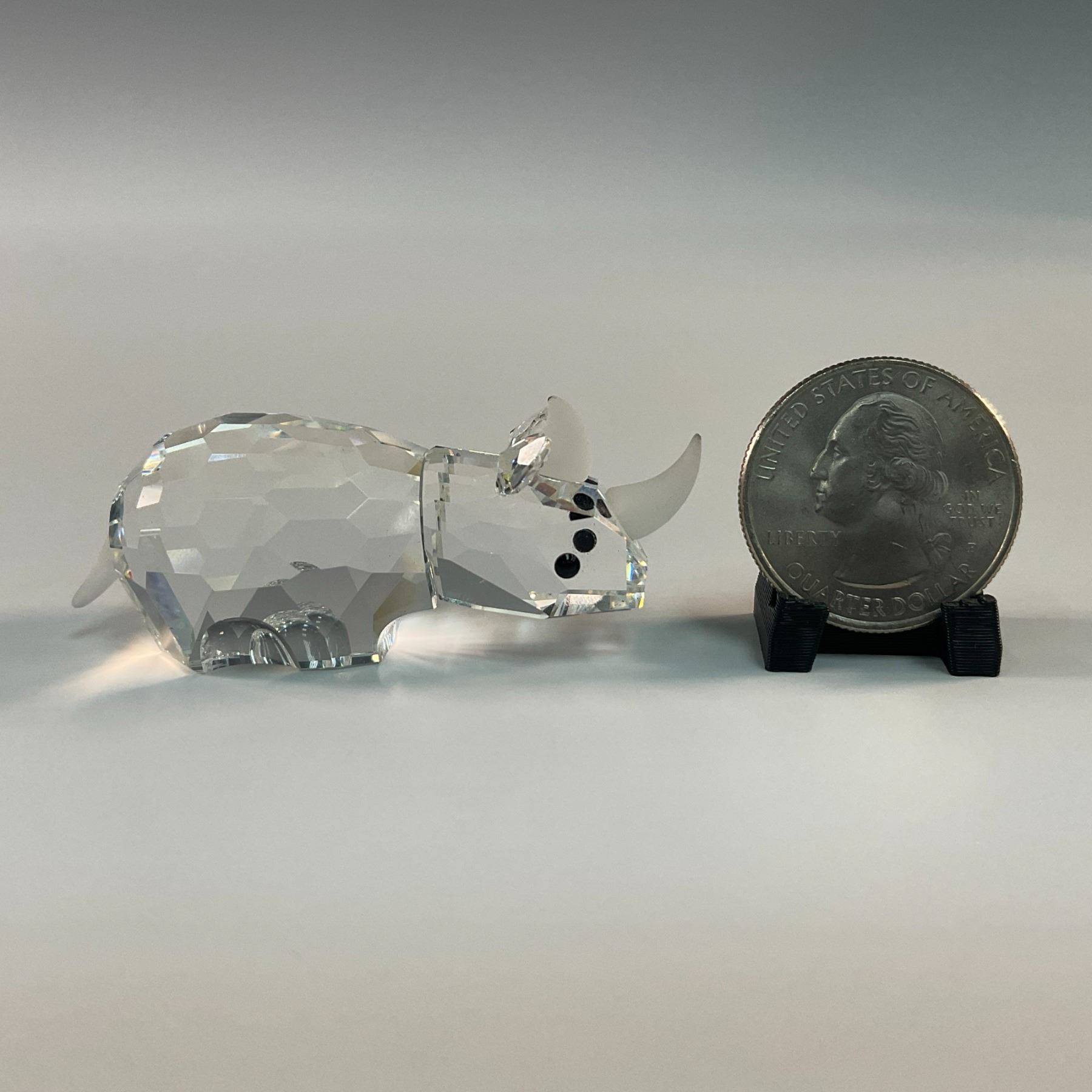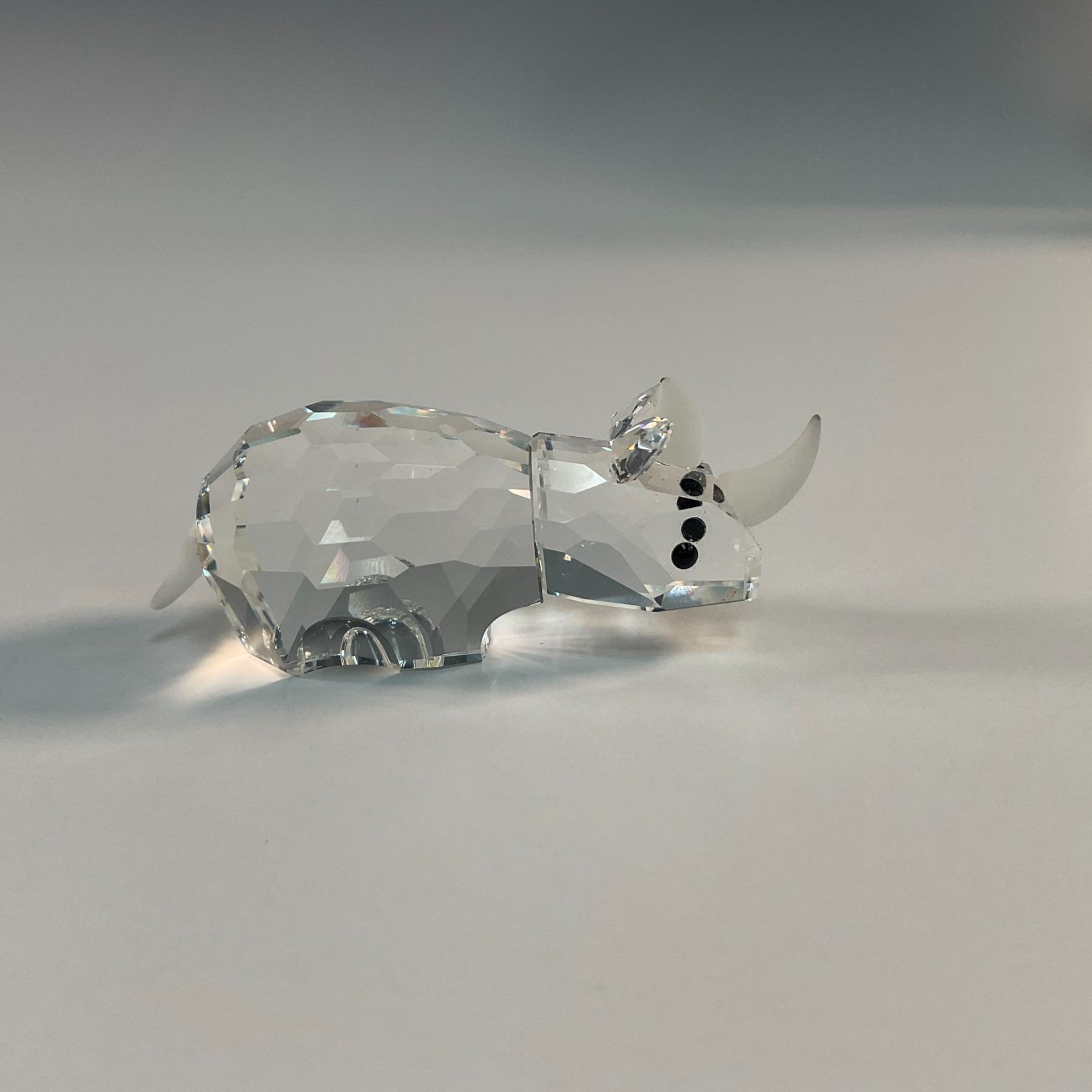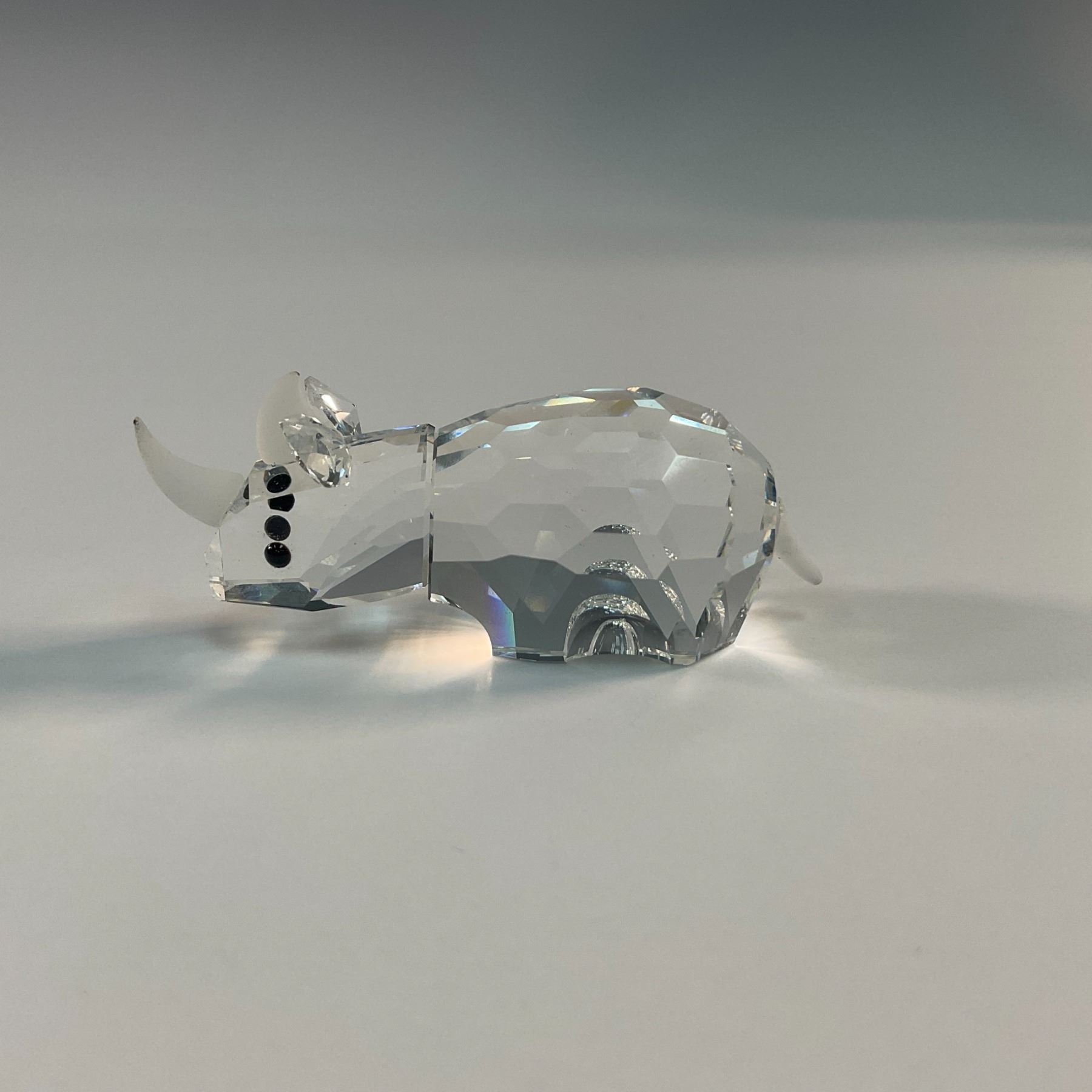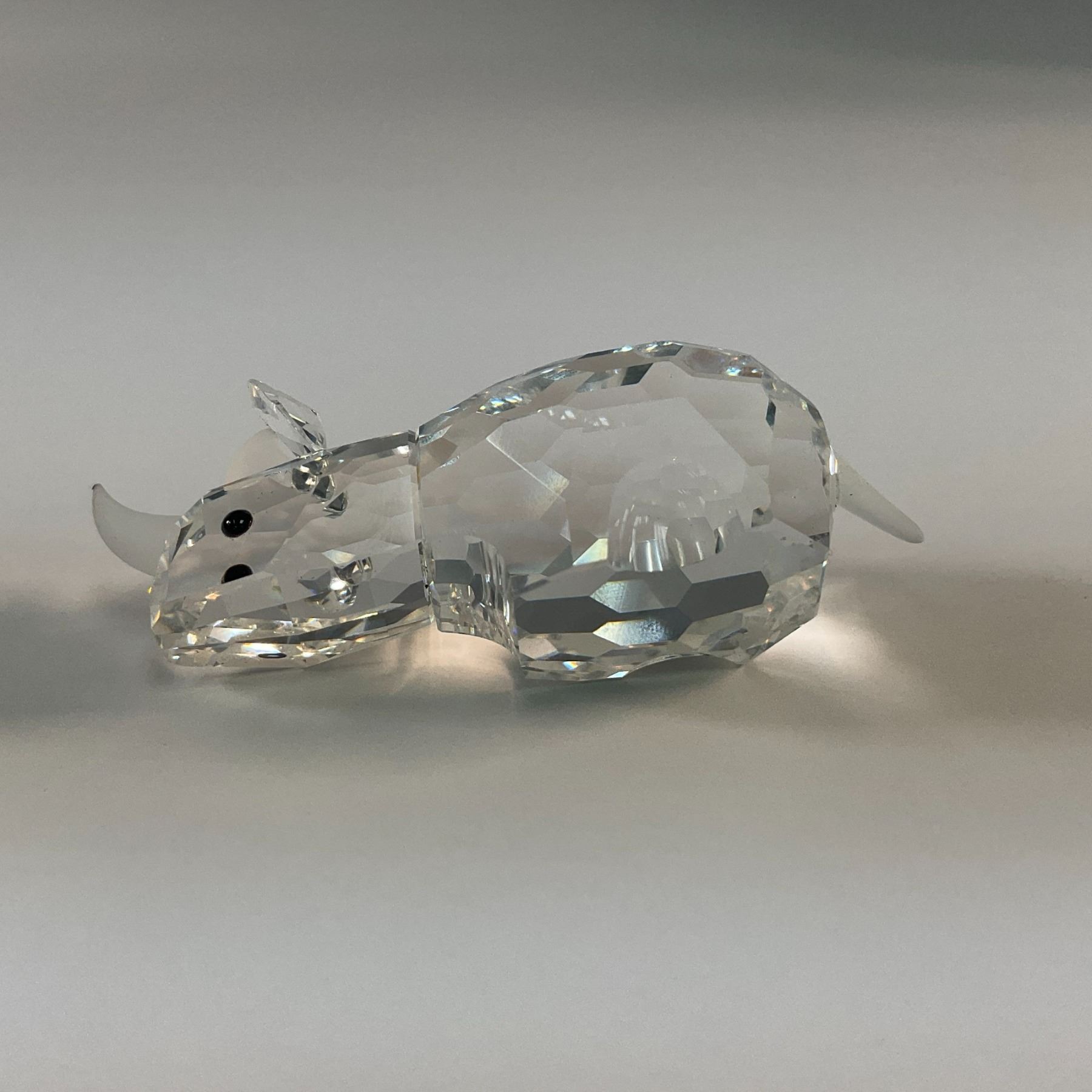 Part of the African Wildlife group. This Swarovski crystal rhinoceros figurine features faceted clear crystal with frosted crystal horns and finely detailed accents. Part of Swarovski's animal collection, it showcases exceptional craftsmanship. A beautiful addition to any Swarovski or wildlife-themed collection. Swarovski swan mark. 151521. This item has its original box.