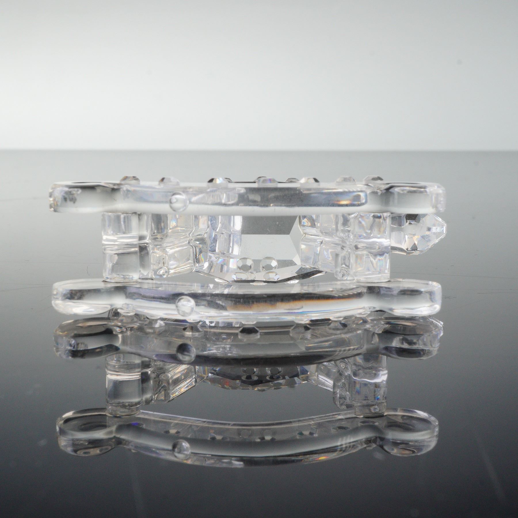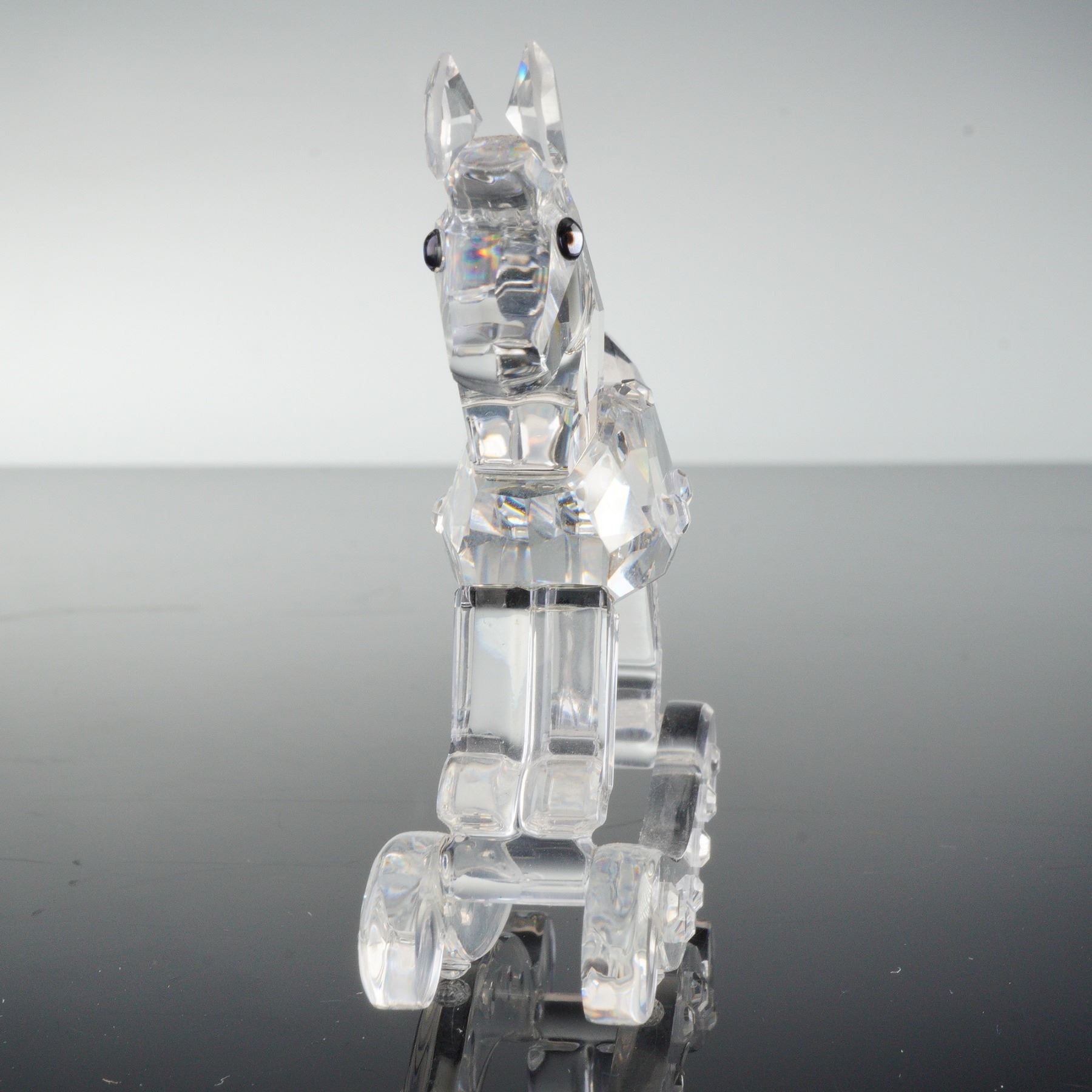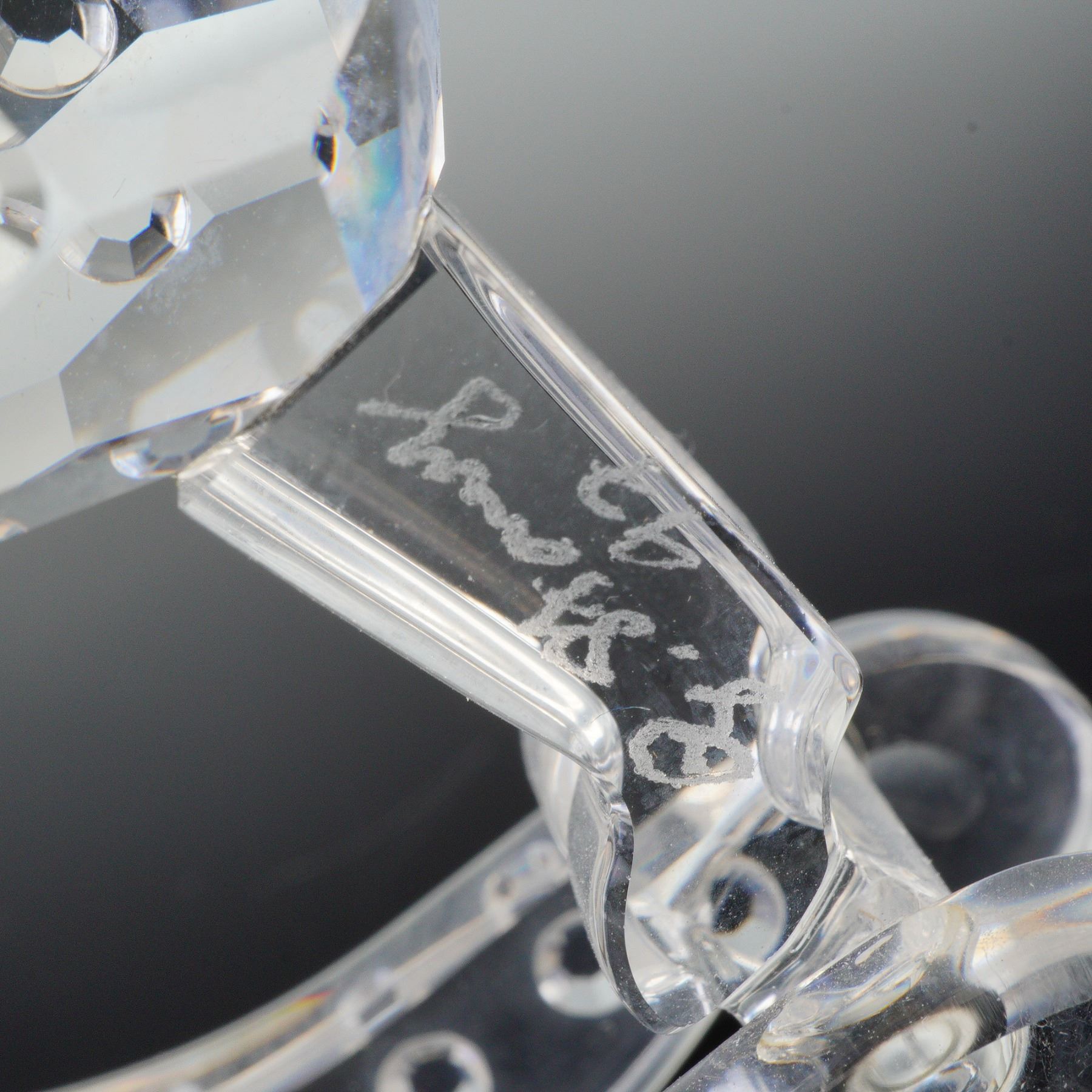 This Swarovski crystal rocking horse figurine is beautifully crafted from clear crystal and features black and blue eyes. The piece is signed by the artist on the leg, adding a personal touch to its detailed design. Swarovski backstamp.