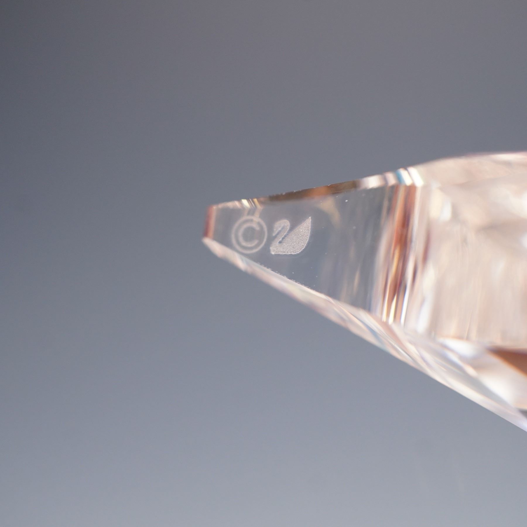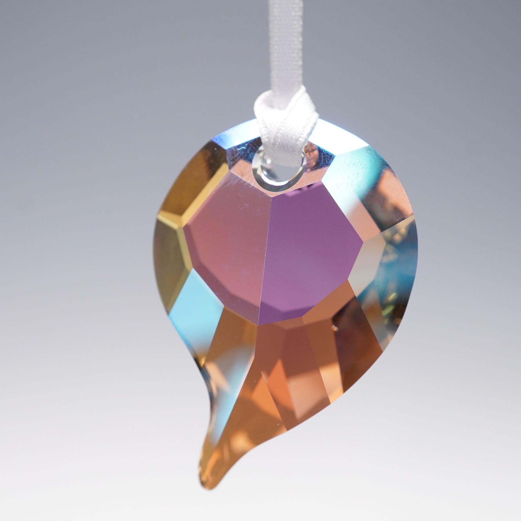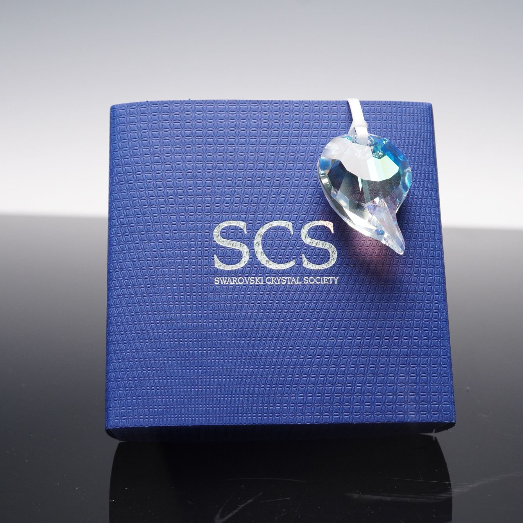 This intricately faceted crystal ornament is designed in a delicate feather form, showcasing shimmering Aurora Borealis effects that reflect a spectrum of colors depending on the light. Suspended from a white satin ribbon, the ornament was released as part of the Swarovski Crystal Society collection and bears the etched Swarovski swan logo. This item has its original box. Box dimensions: 4"L x 3.75"W x 1.5"H.