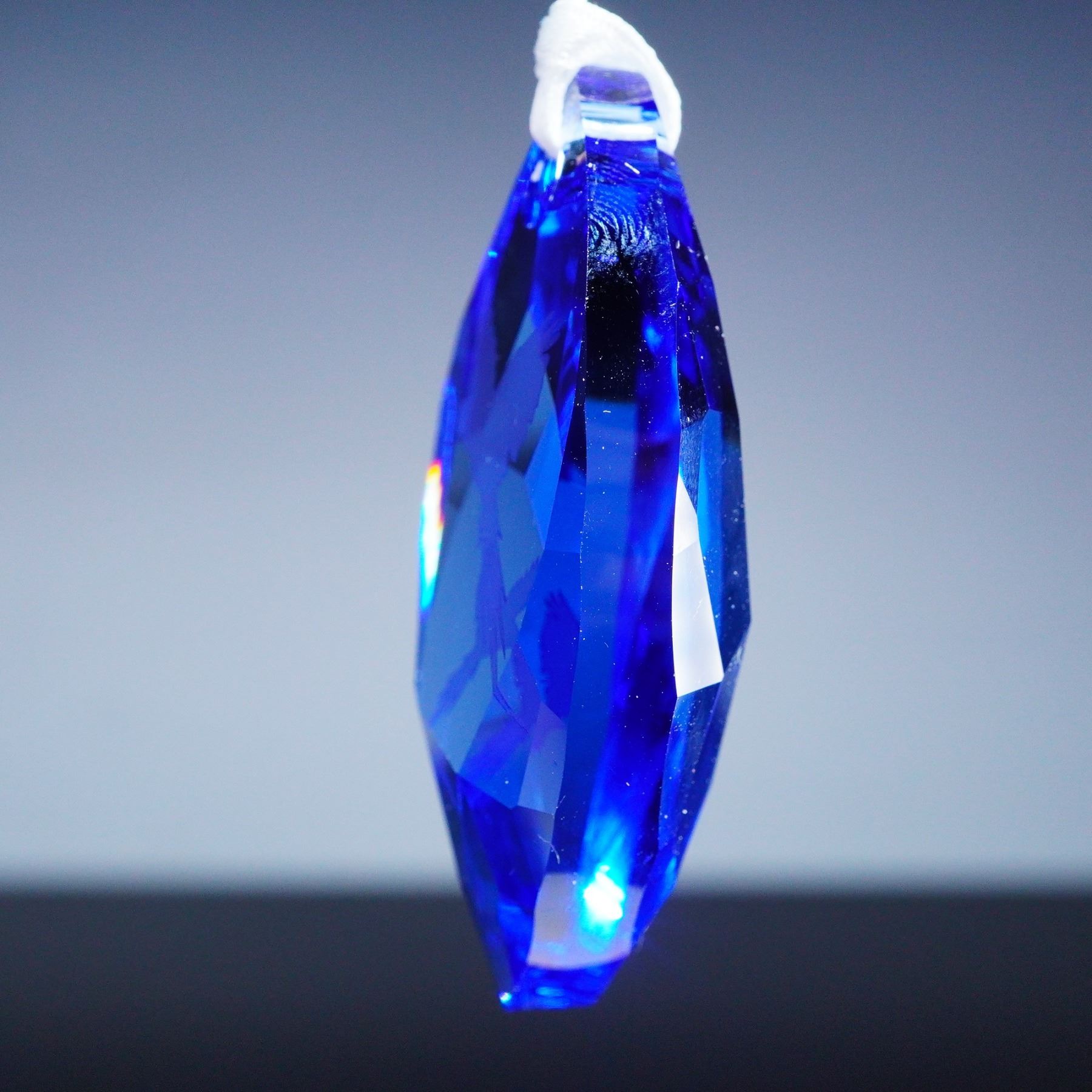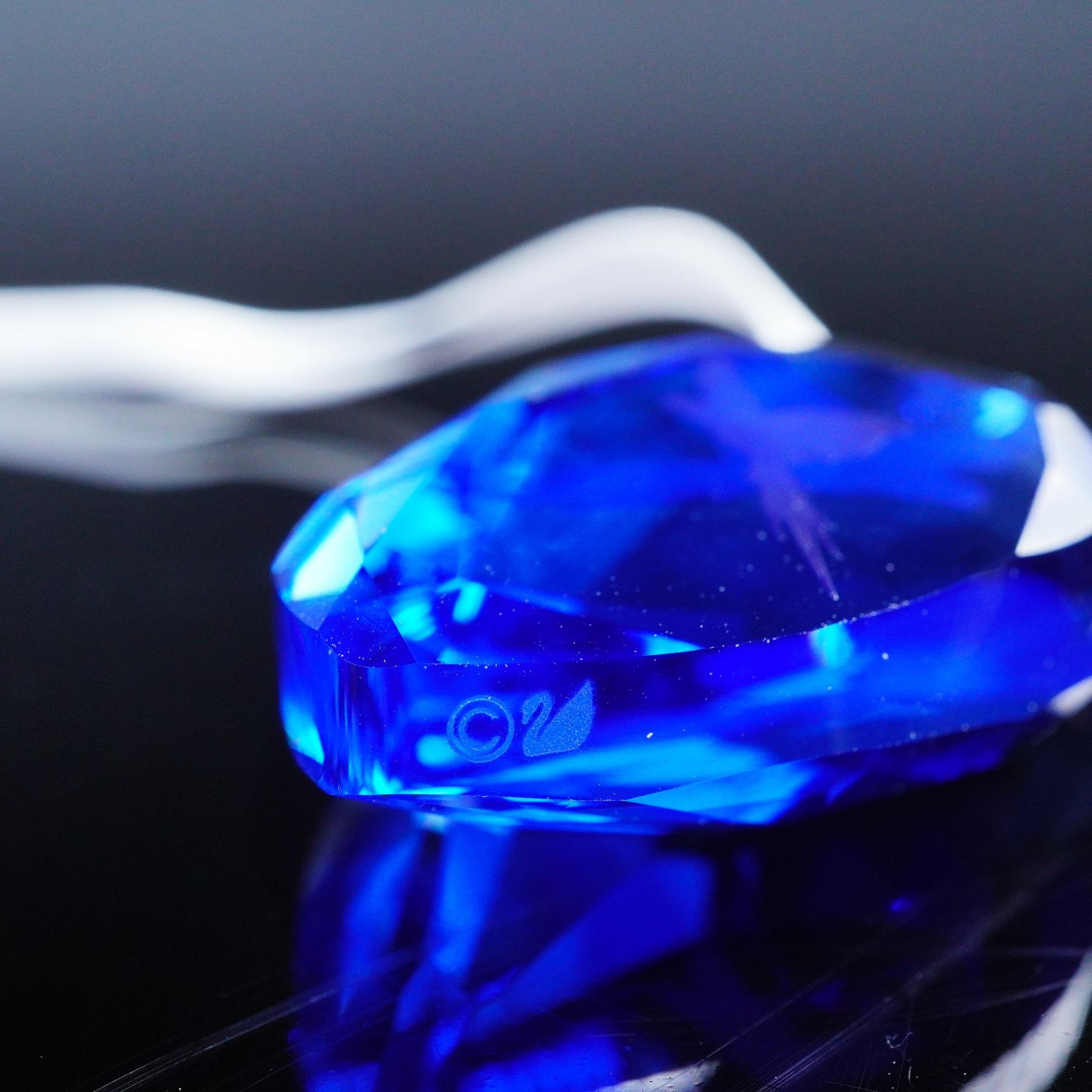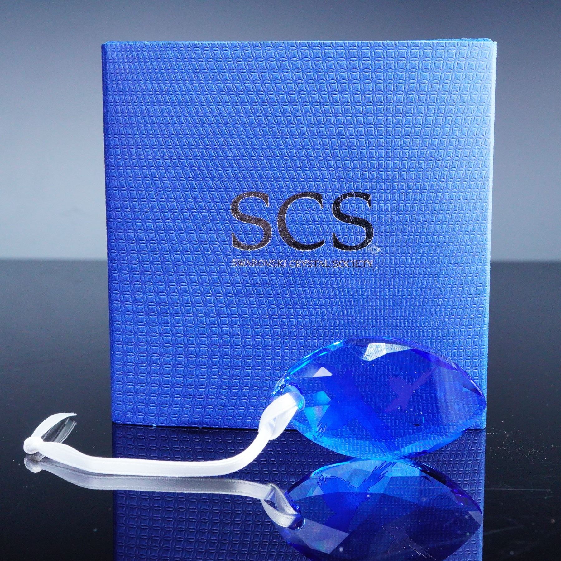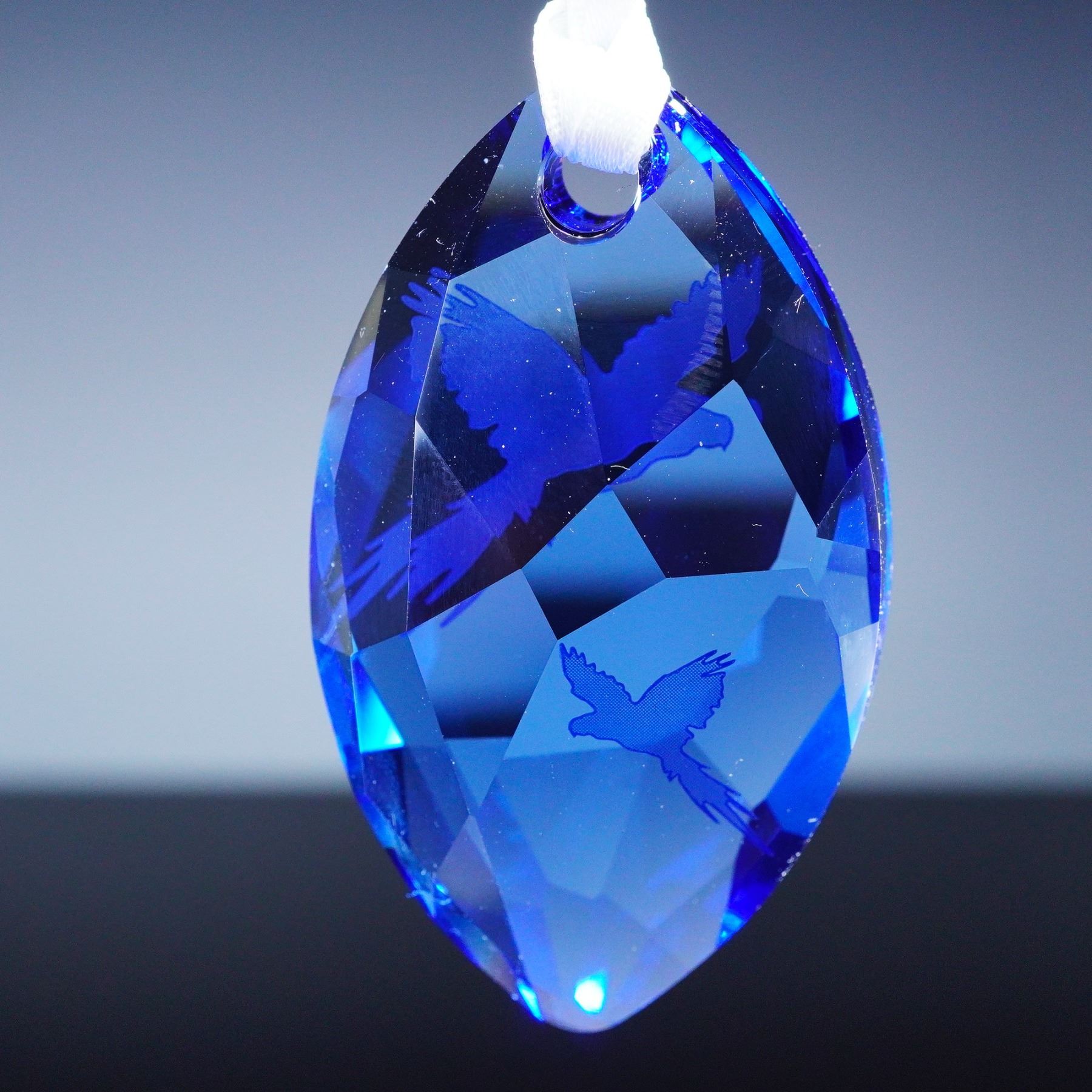 This Swarovski Crystal Society ornament was created exclusively for SCS members at the 2014 Annual Edition Esperanza Horse events. The design features a pair of Hyacinth Macaws, represented in sapphire blue crystal with fully faceted detailing on both sides. One side shows a larger macaw, while the reverse features a smaller one, creating depth and movement within the piece. The ornament is suspended from a white ribbon and is marked with the Swarovski backstamp. Presented in the original SCS box.