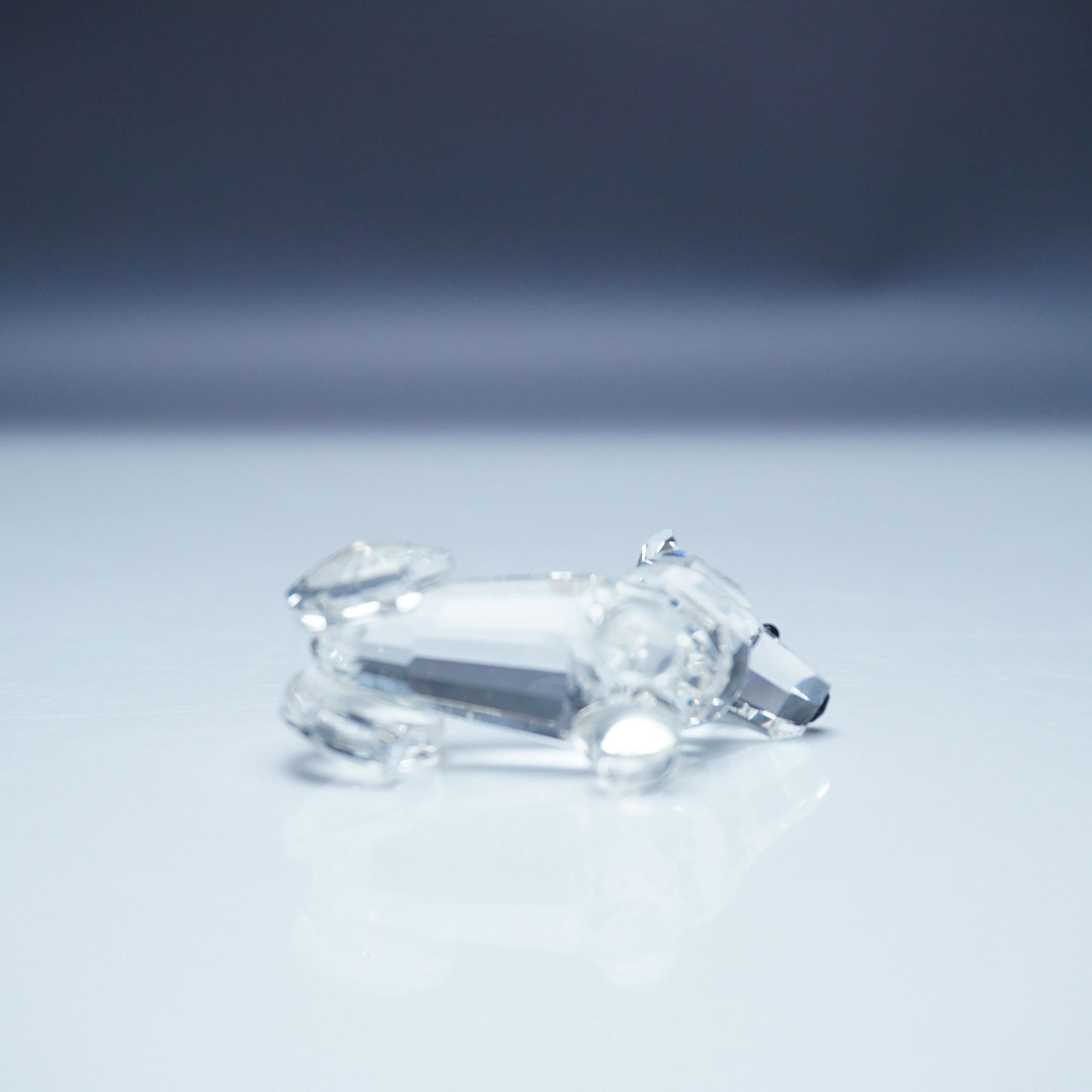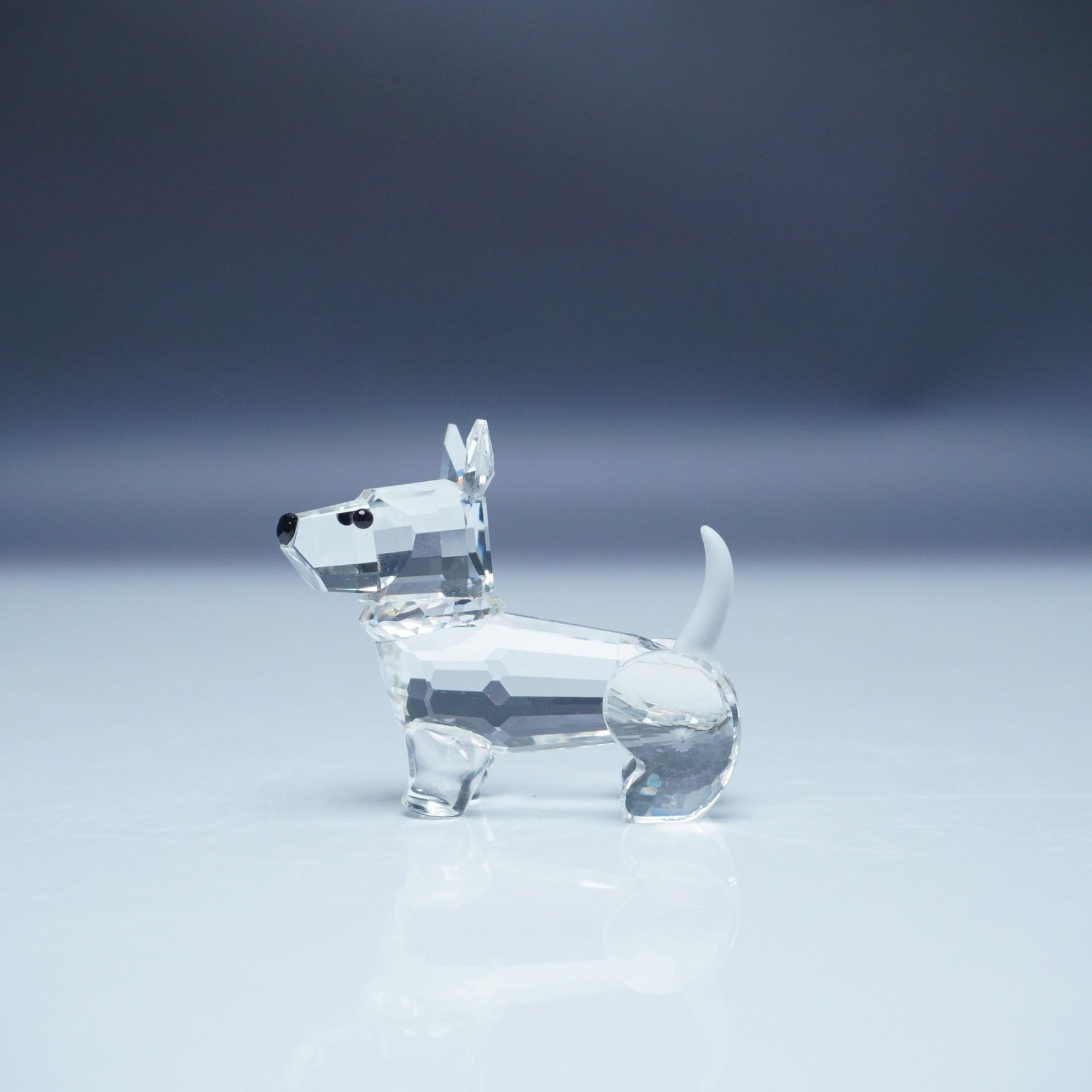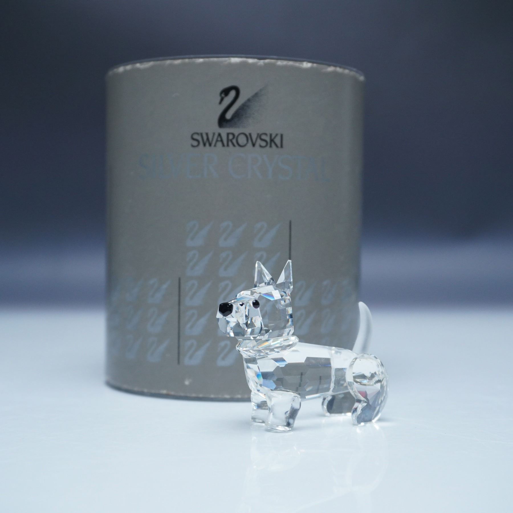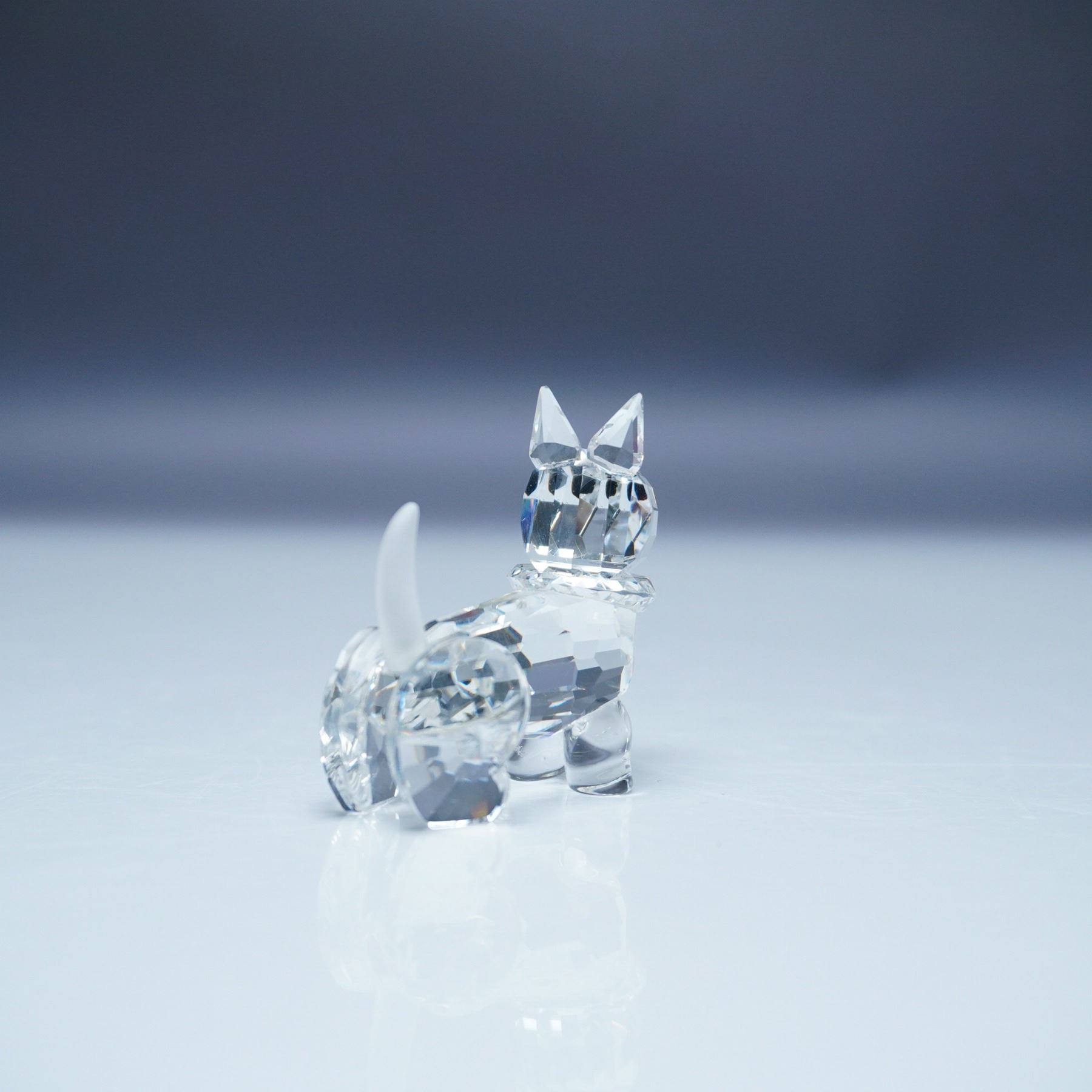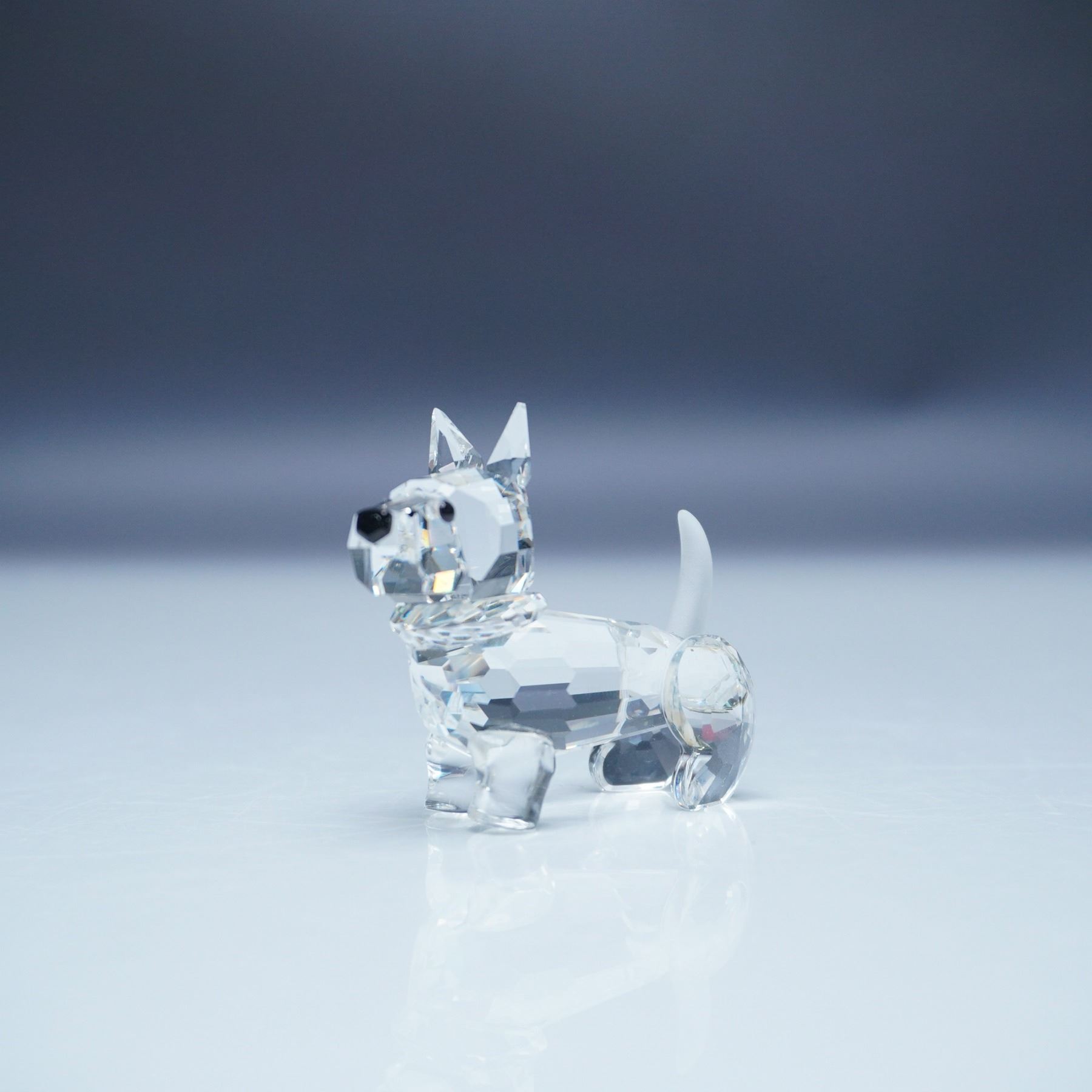 Swarovski crystal figurine depicting a Scots Terrier from the Pets Corner collection. This charming terrier is crafted in clear faceted crystal with black eyes and a black nose, featuring an upright frosted tail. Designed with exquisite detail, this piece captures the playful and loyal essence of the breed. The figurine bears the Swarovski acid-etched swan mark on the base, ensuring authenticity. Includes original packaging.