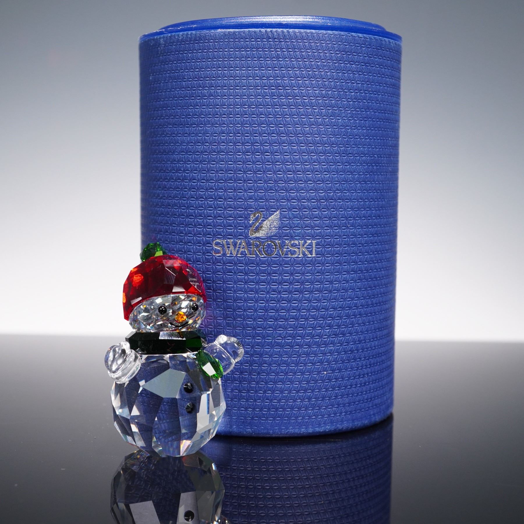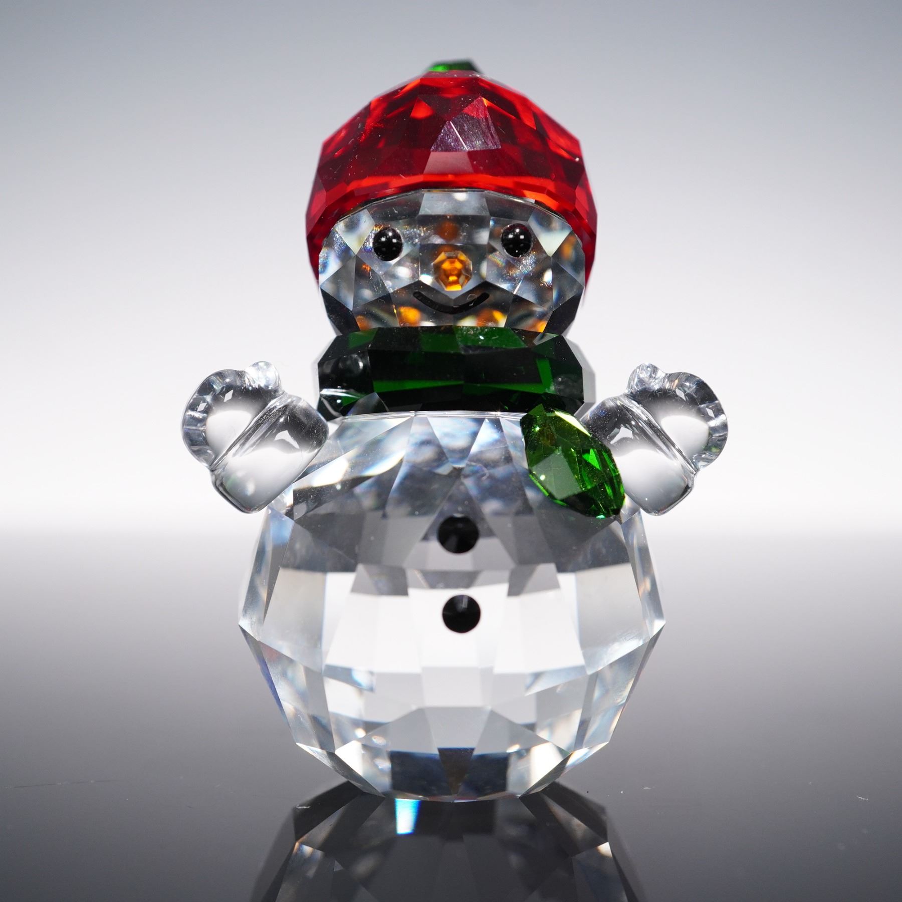 A charming faceted crystal snowman adorned with a bright red crystal hat, green crystal scarf, and clear crystal body. The figure features black crystal eyes, buttons, and a cheerful smile, complemented by an orange crystal nose. Includes Swarovski logo on base. This item has its original box. Box dimensions: 3.25"W x 4.75"H.