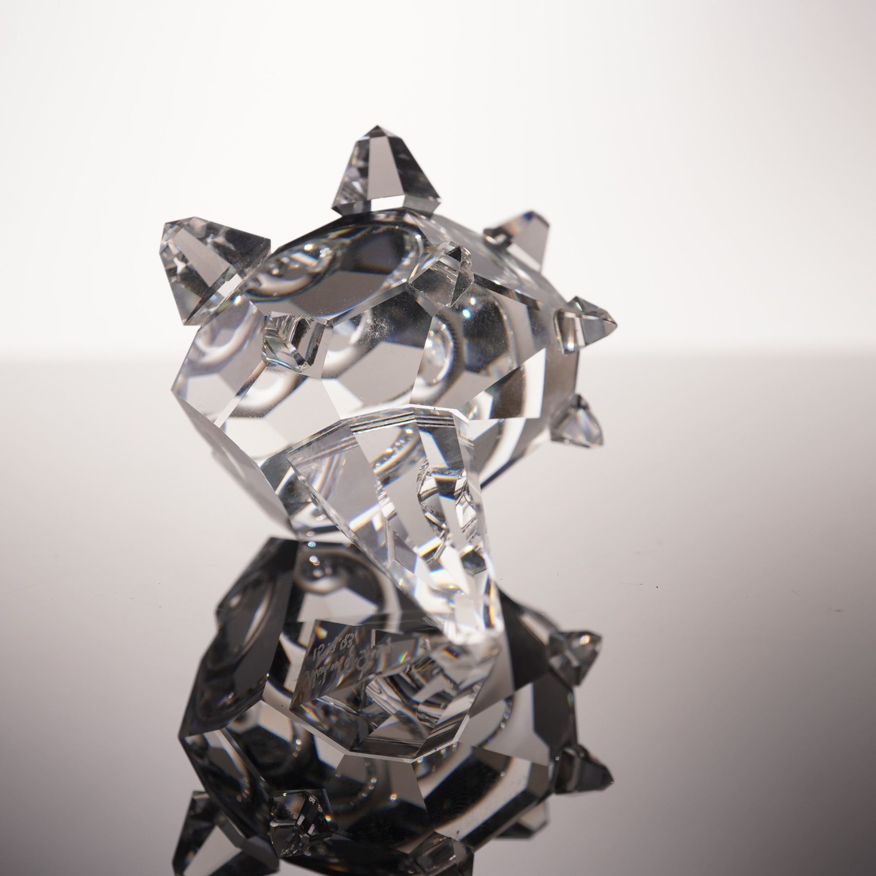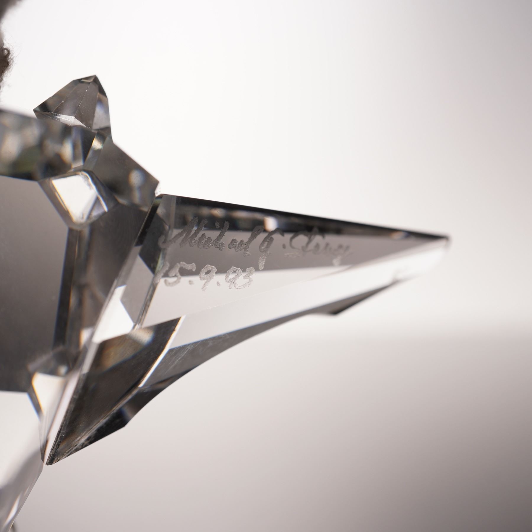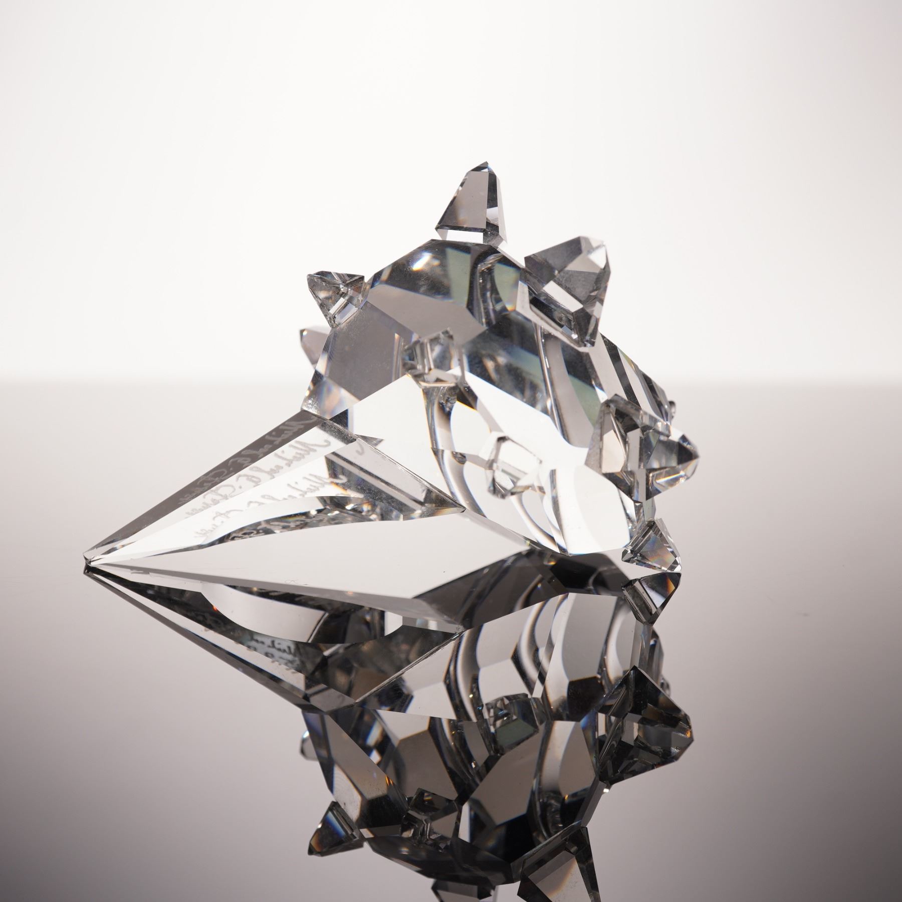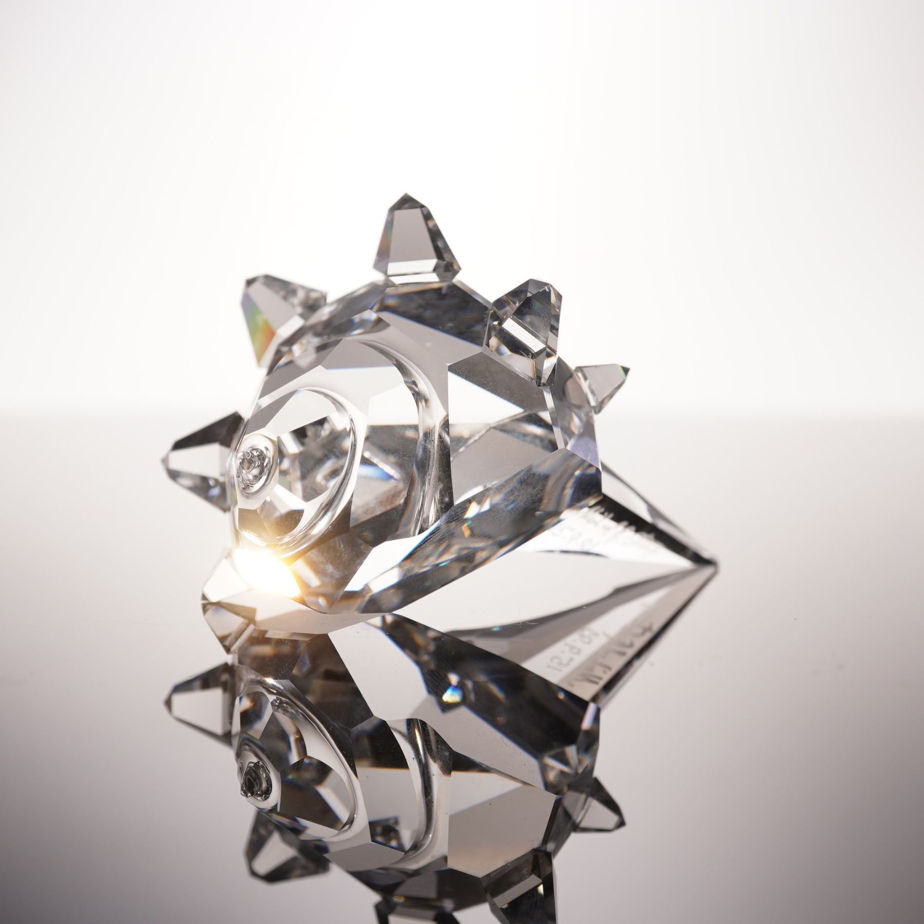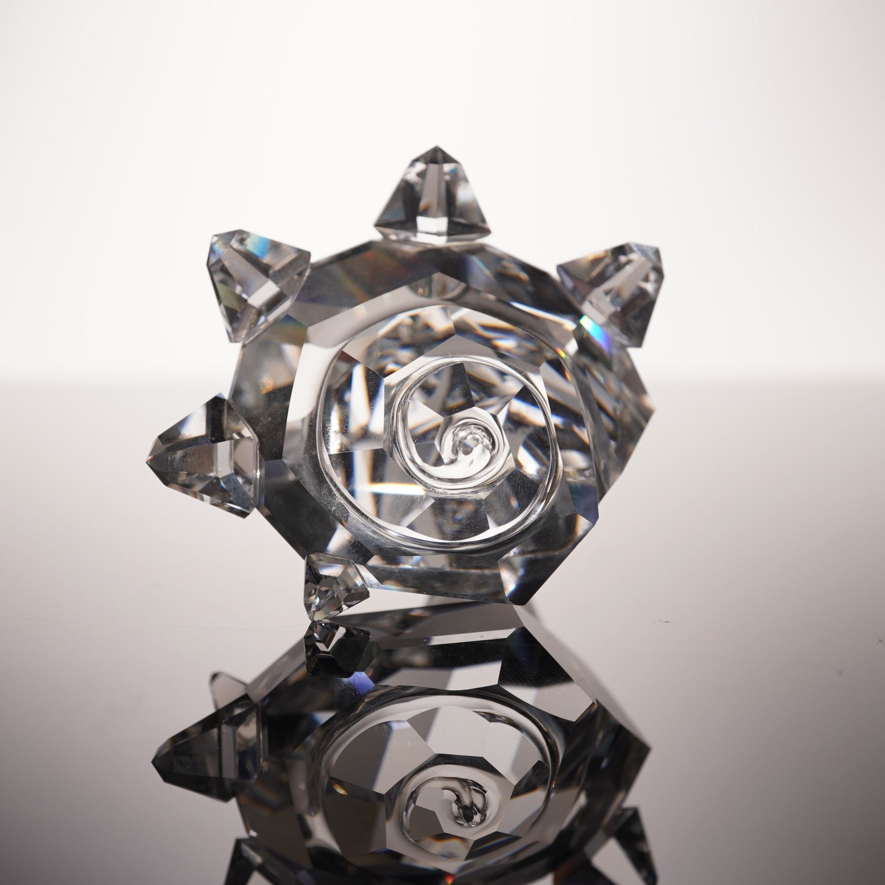 Swarovski crystal figurine of a South Sea Shell, designed and signed by Michael Stamey. This intricate piece features a faceted clear crystal shell form with a swirling spiral design, evoking the natural elegance of marine life. The underside is signed by the designer and dated, adding collectible significance. Includes original fitted box packaging. 160798.