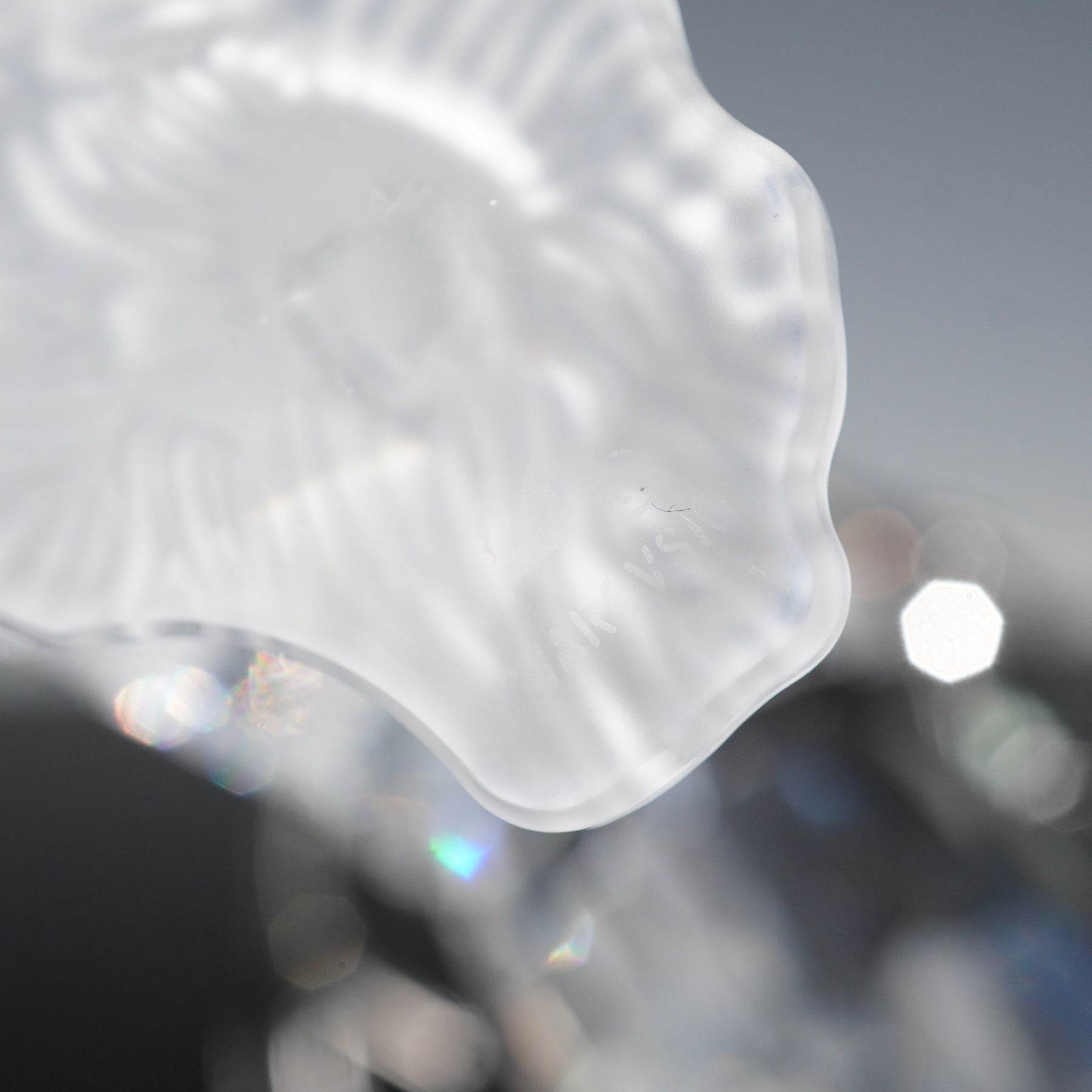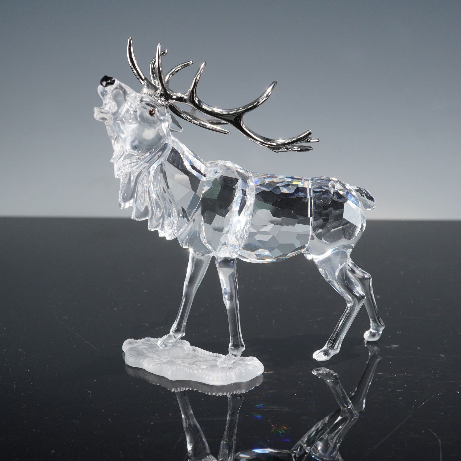 Faceted clear crystal Stag 291431, with frosted detailing and metal antlers, depicted in a proud standing pose. Etched Swarovski logo to base.