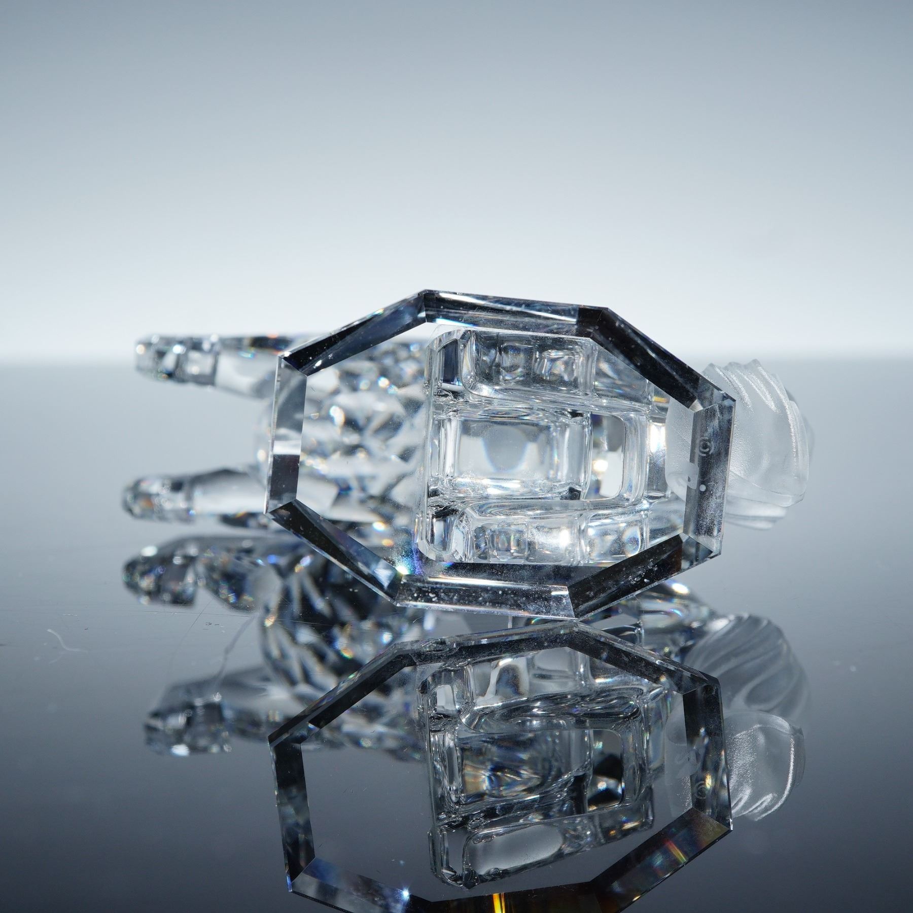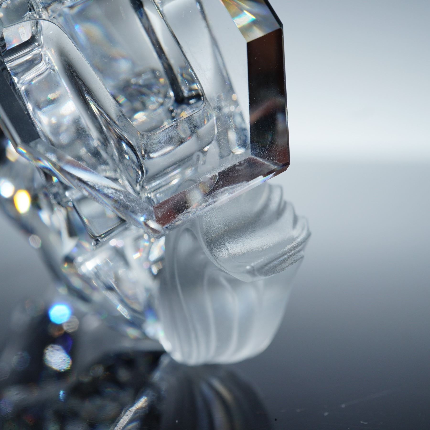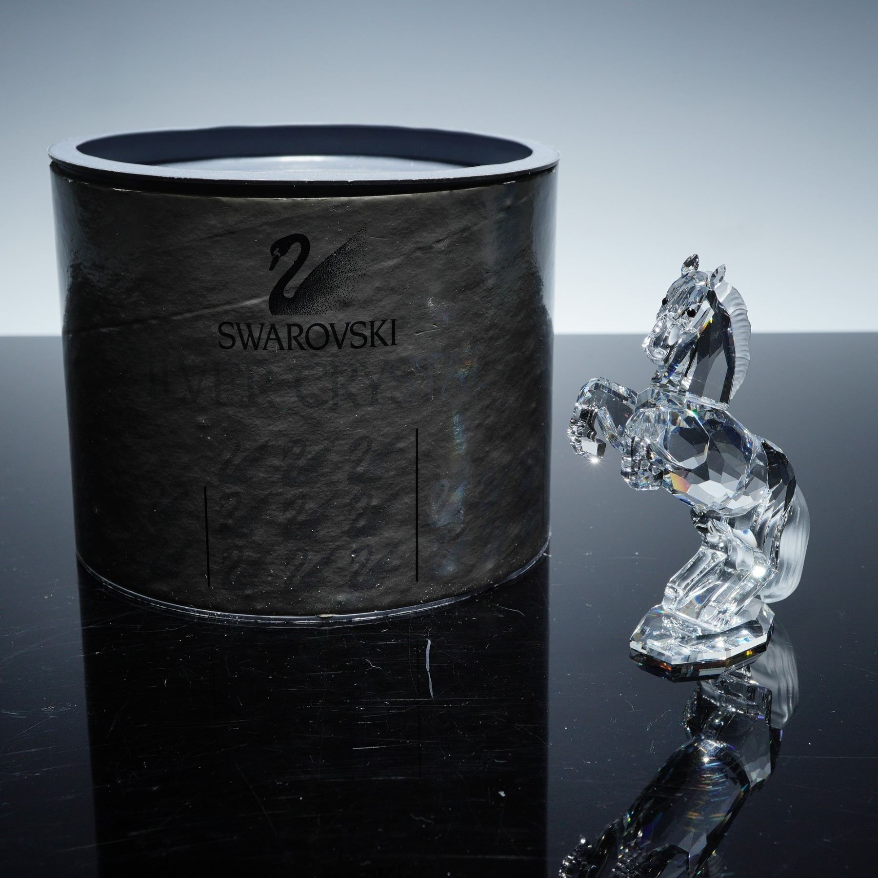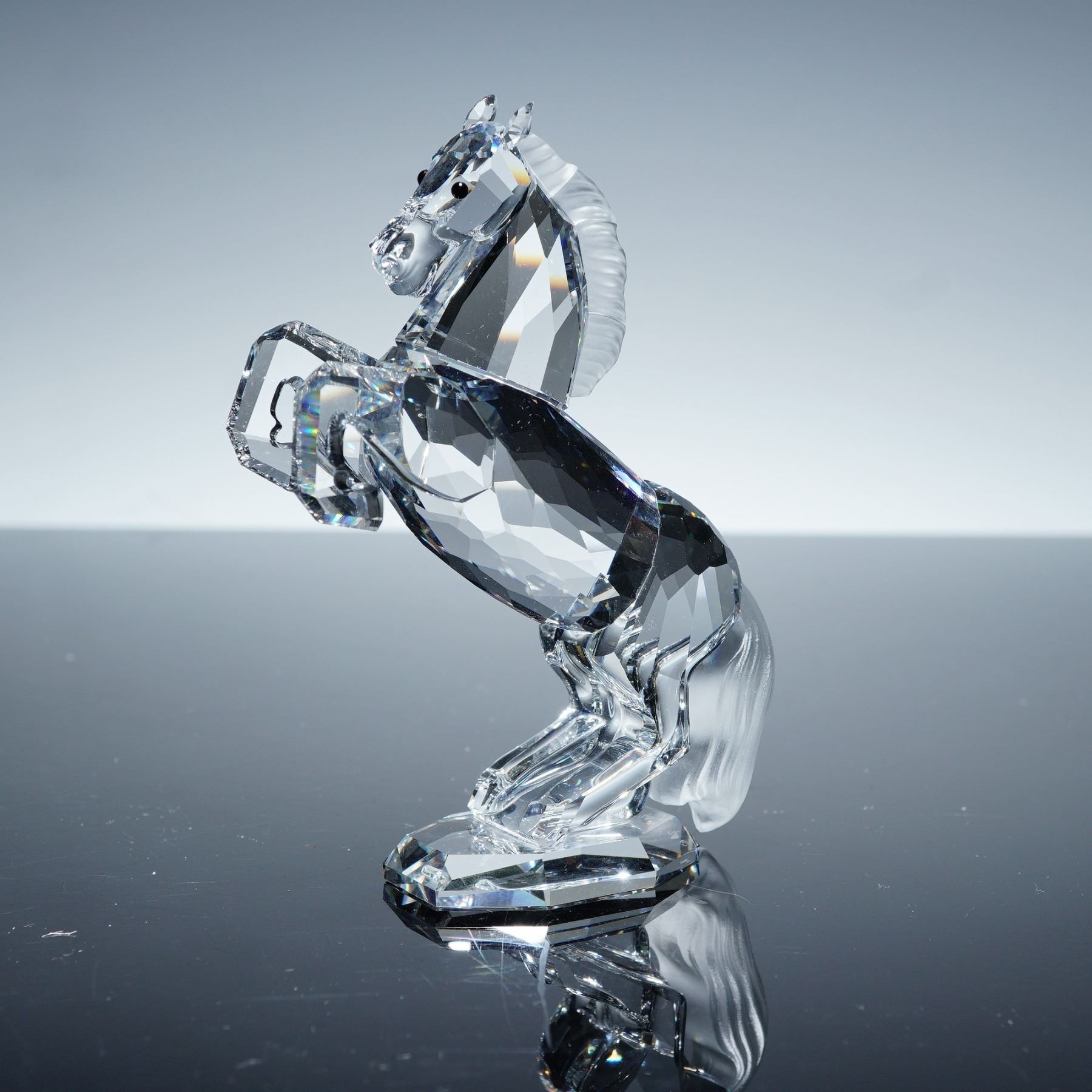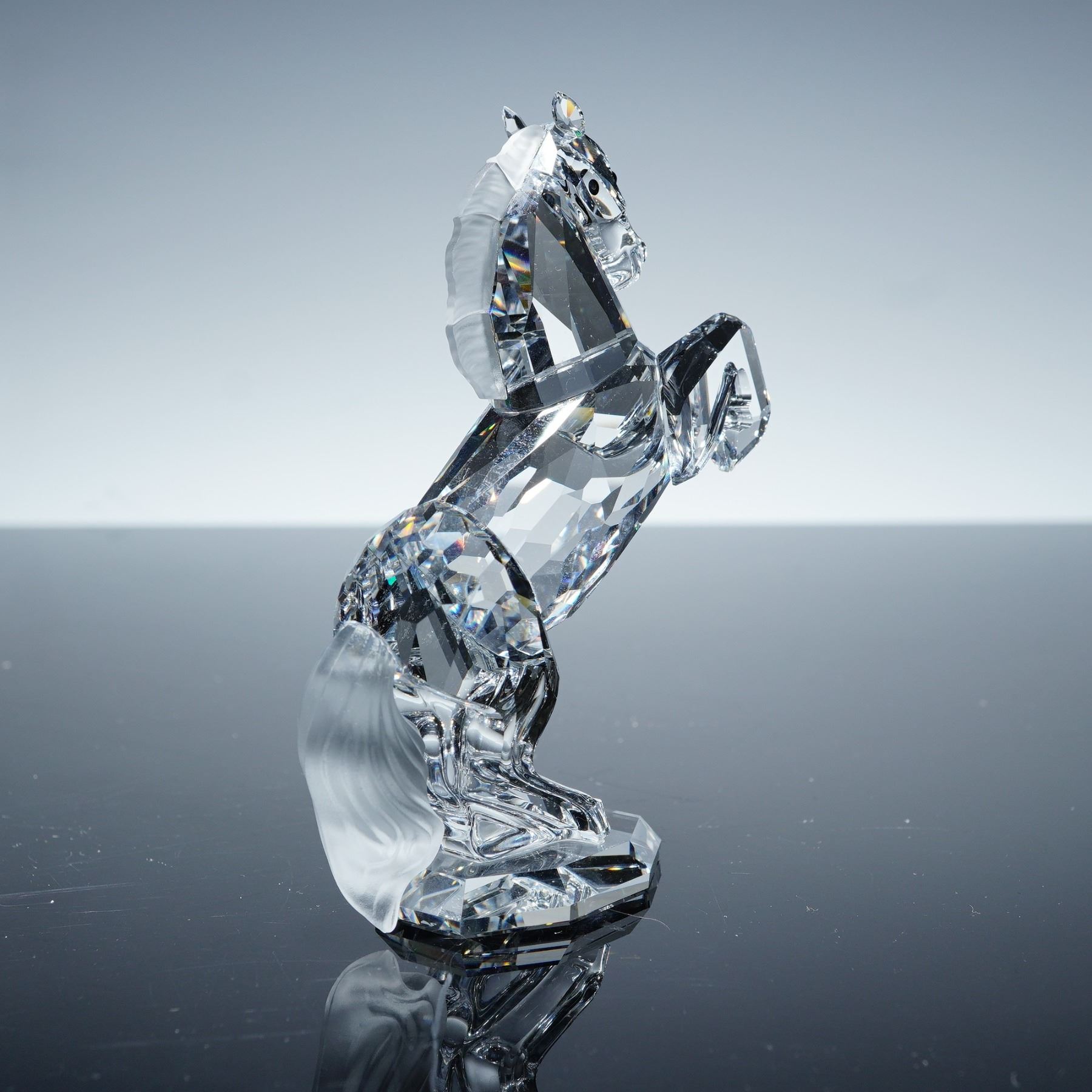 A striking Swarovski crystal figurine depicting a rearing stallion, beautifully crafted with faceted clear crystal and frosted details on the mane and tail. The piece captures strength and elegance in motion with remarkable attention to detail. Marked with the Swarovski logo and complete with its original box.
