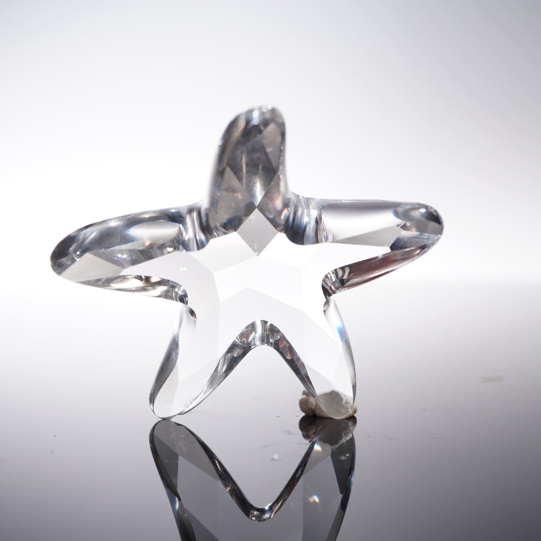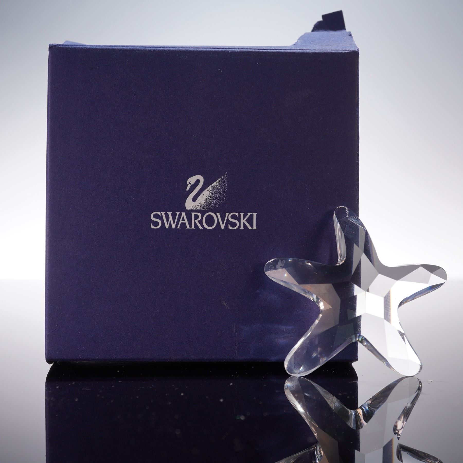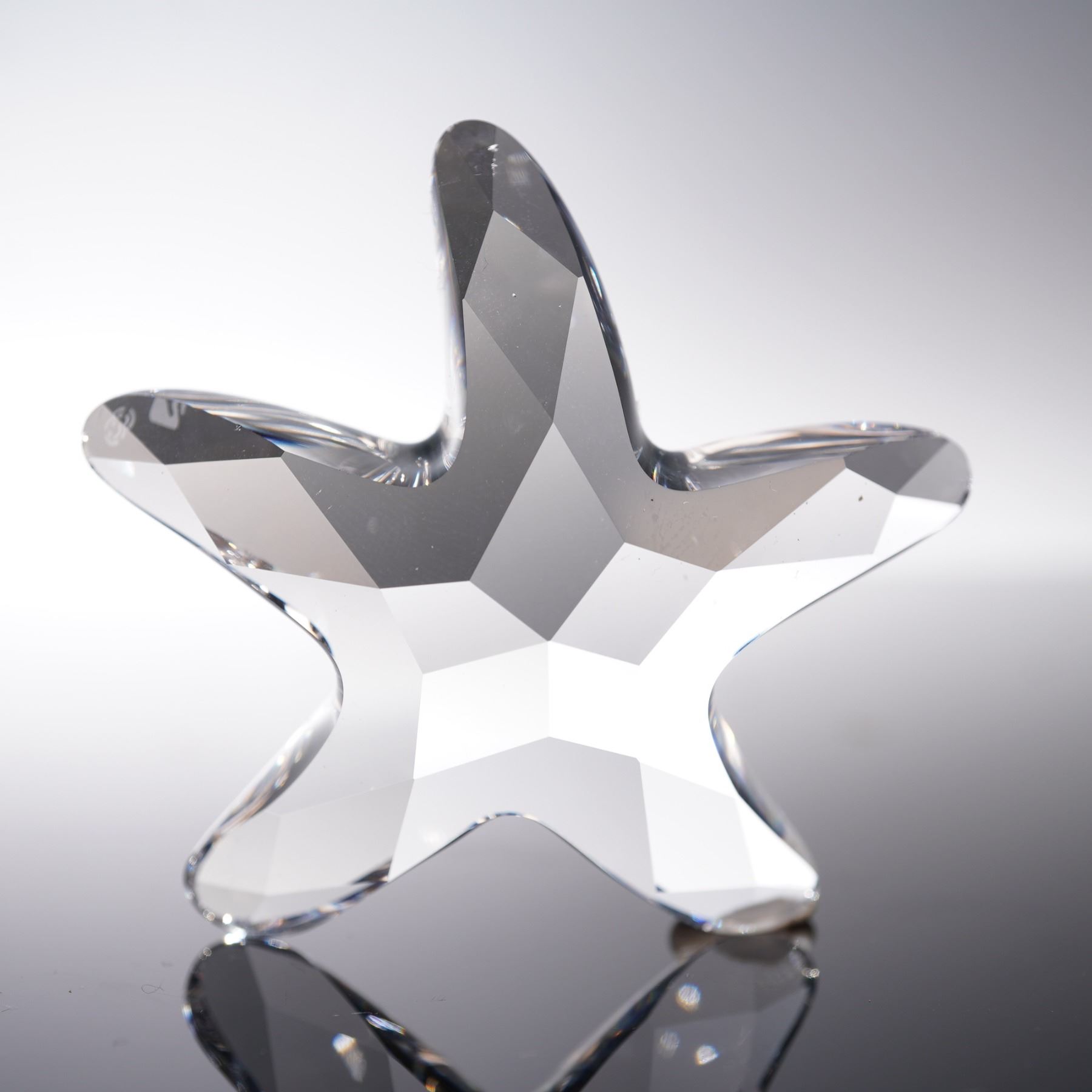 A Swarovski crystal figurine depicting a beautifully faceted starfish, crafted in clear crystal with striking geometric cuts that capture and reflect light with brilliance. The piece bears the Swarovski swan hallmark, ensuring authenticity. Accompanied by the original Swarovski box. 191690.
