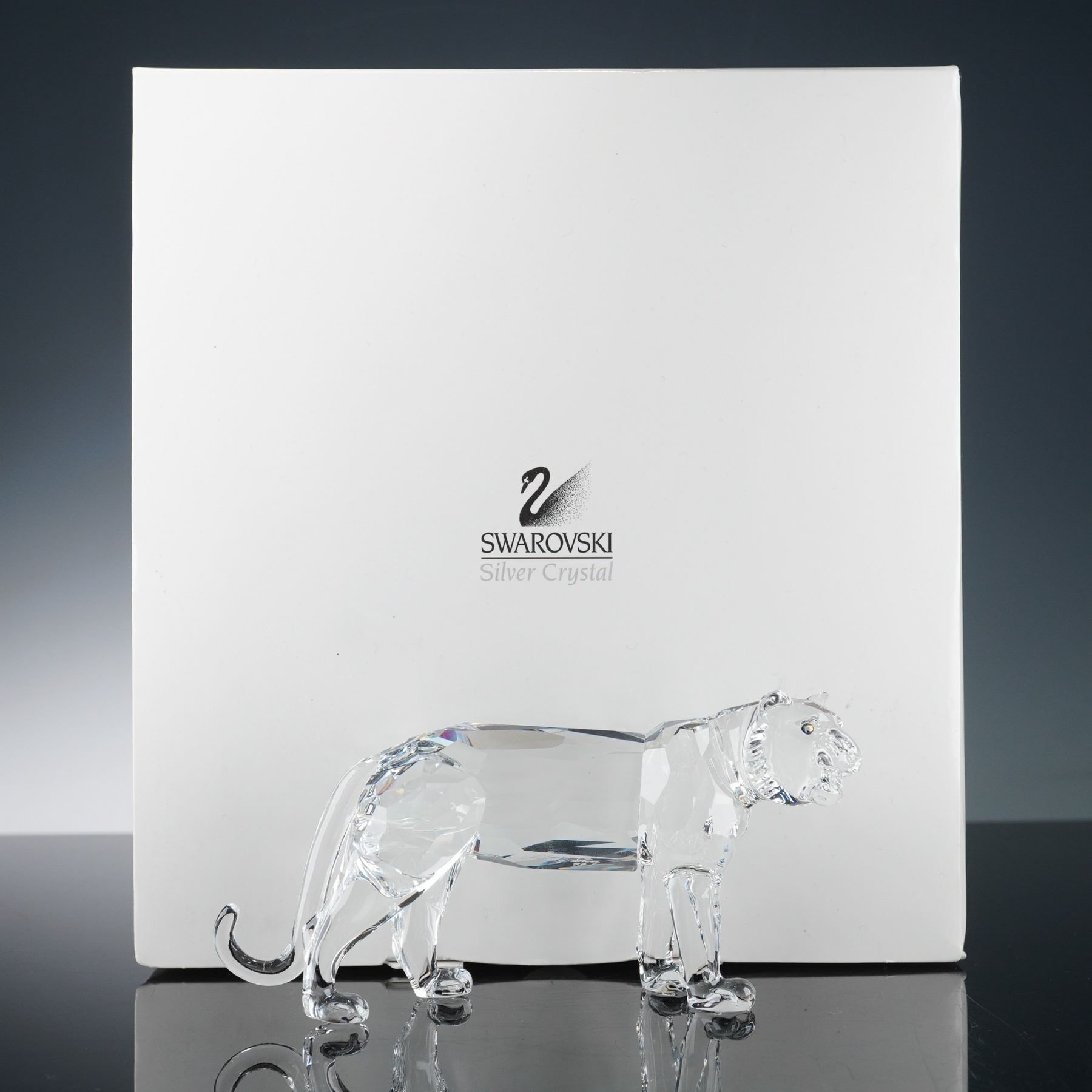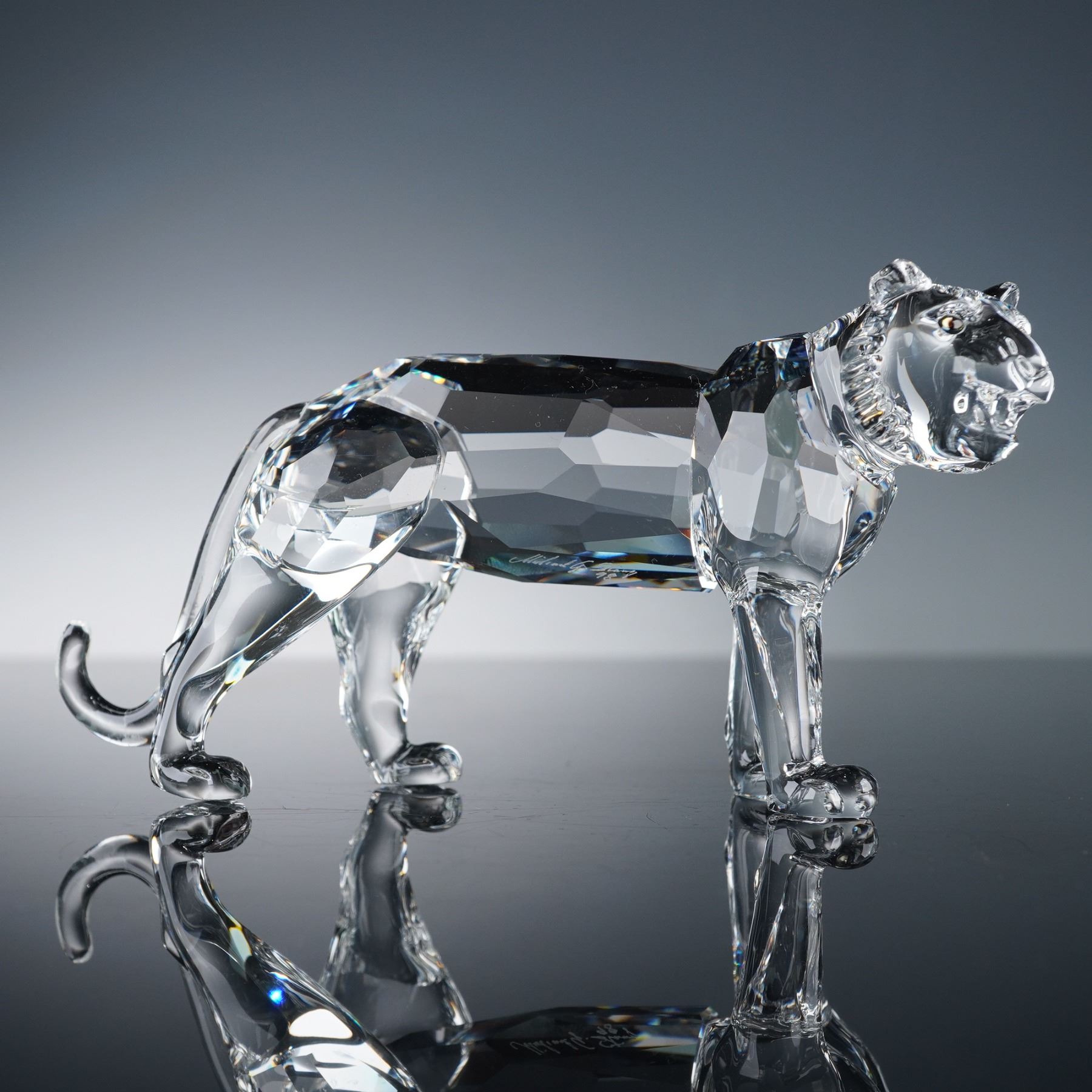Magnificent Swarovski Silver Crystal Tiger figurine designed by Michael Stamey, showcasing the brand's mastery of form and precision cutting. The regal tiger stands poised in mid-stride, its muscular body rendered in faceted clear crystal that captures and refracts light with stunning brilliance. The expressive face, detailed paws, and gracefully curved tail lend lifelike movement and strength to the piece. This example is personally signed by designer Michael Stamey and dated 1998, making it especially desirable for collectors of early Swarovski wildlife sculptures. It bears the Swan logo hallmark and is presented in its original white presentation box. 220470.