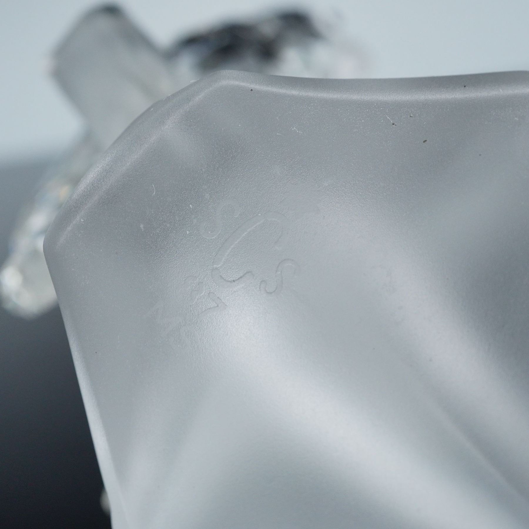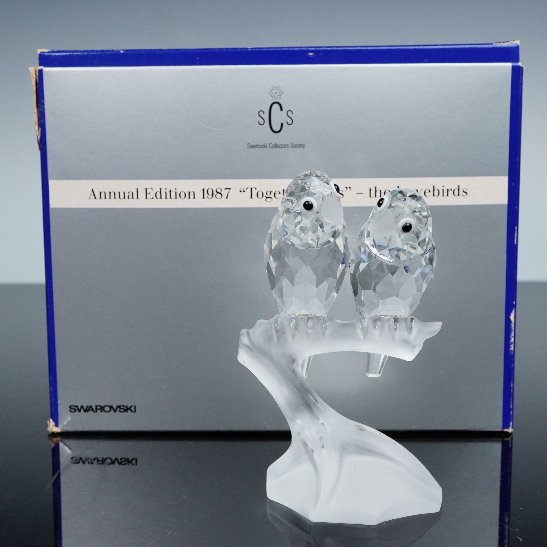 Swarovski crystal figurine titled Togetherness, the 1987 Annual Edition for the Swarovski Collectors Society. Designed by Max Schreck, it features two lovebirds crafted from clear faceted crystal, perched gracefully on a frosted crystal branch. Symbolizing unity and affection, this elegant early SCS edition remains one of the most admired and collectible pieces in Swarovski history. This item has its original box. Box measures: 6.75"L x 6"W x 5.5"H.