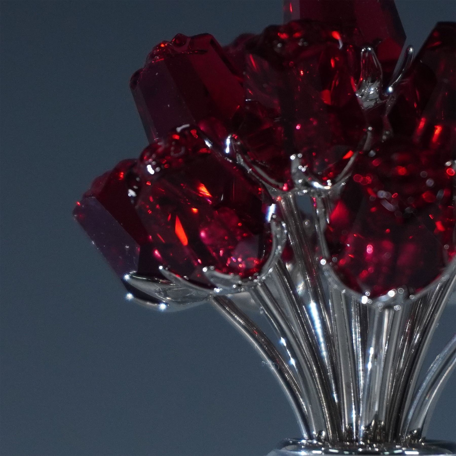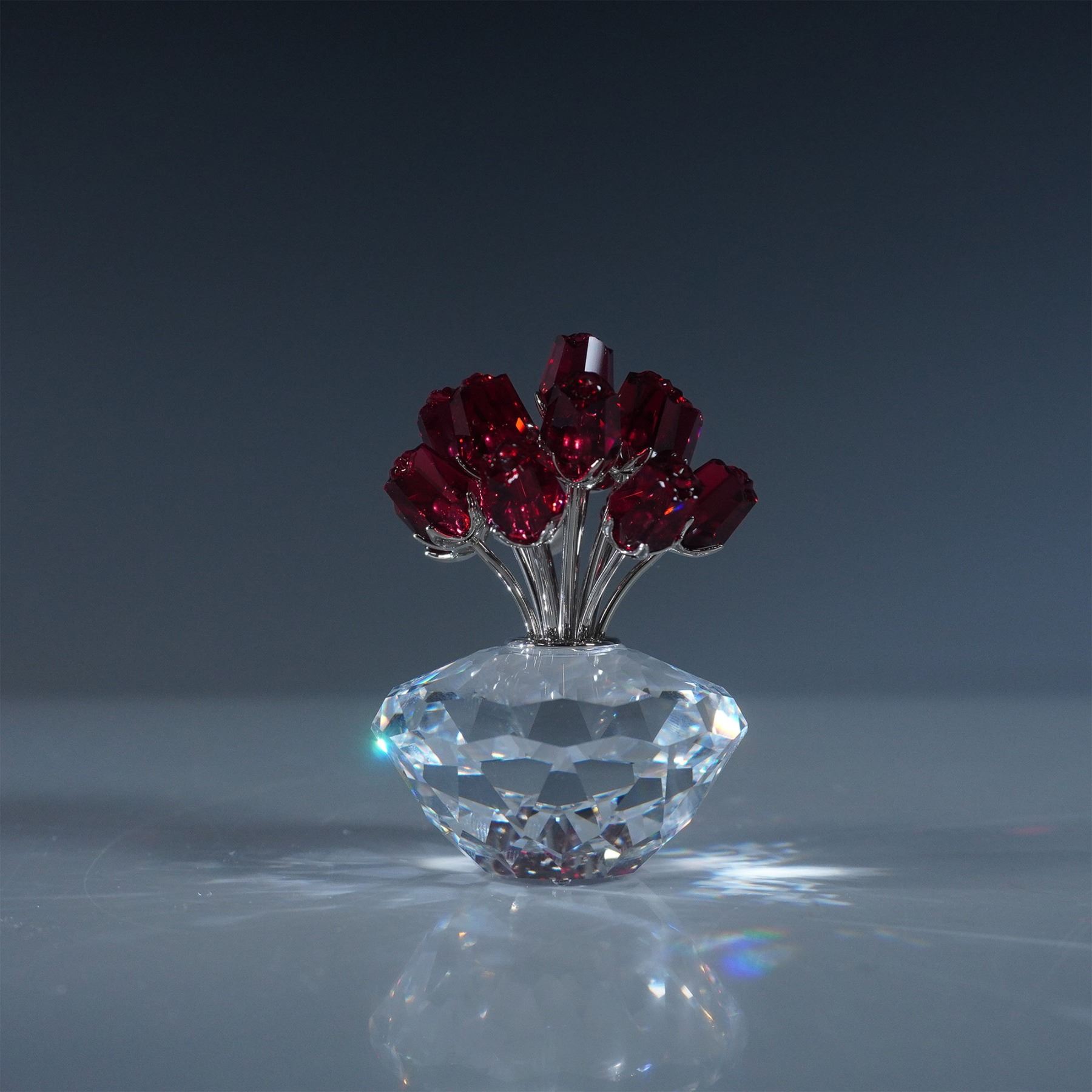This elegant Swarovski Crystal Vase of Roses figurine features a clear faceted crystal vase holding a bouquet of intricately designed red roses with rhodium-plated stems and leaves. Standing at 2.75"H, this piece showcases Swarovski's renowned craftsmanship. It comes in its original box measuring 4.75"L x 4.75"W x 4"H. Marked with the Swarovski acid-etched logo.