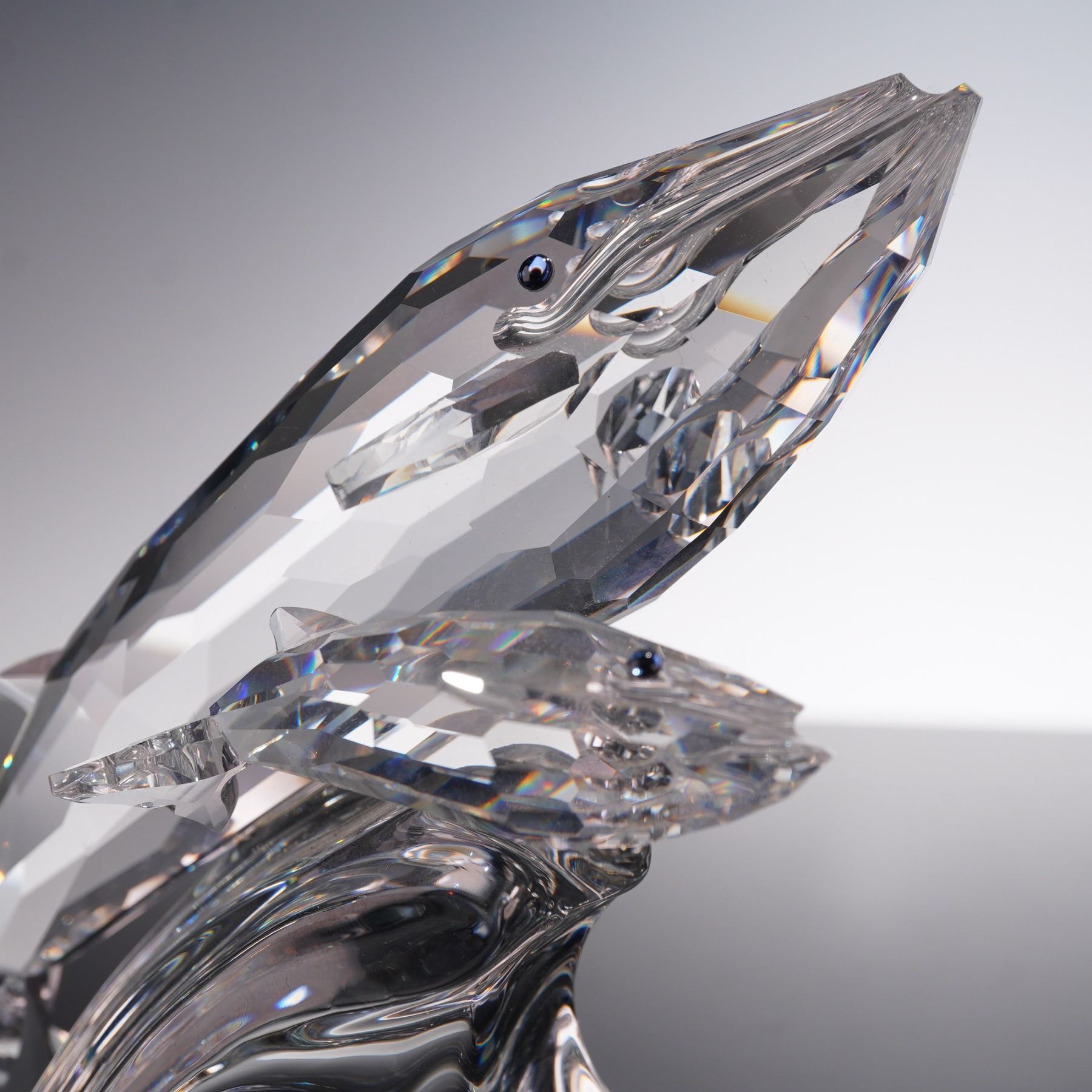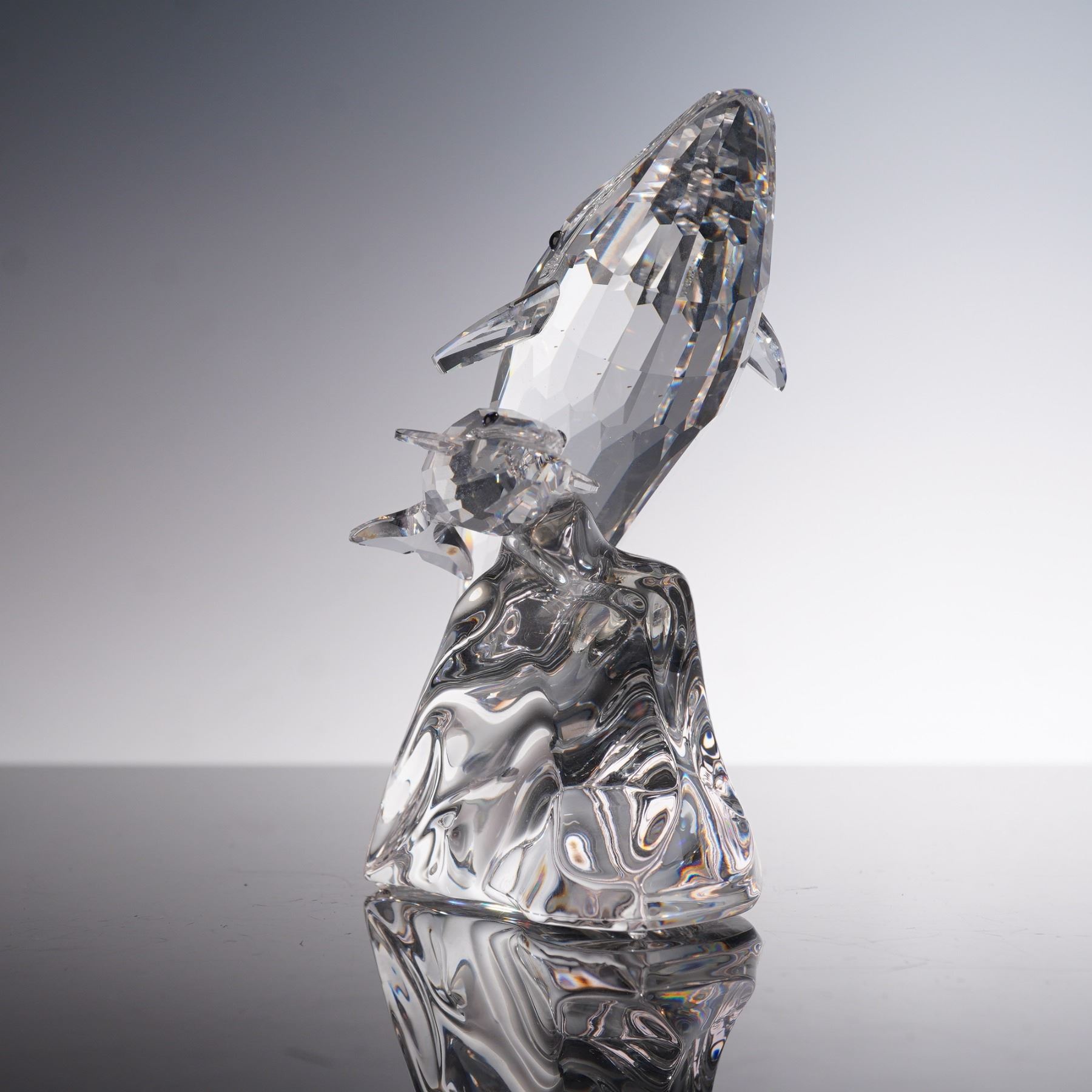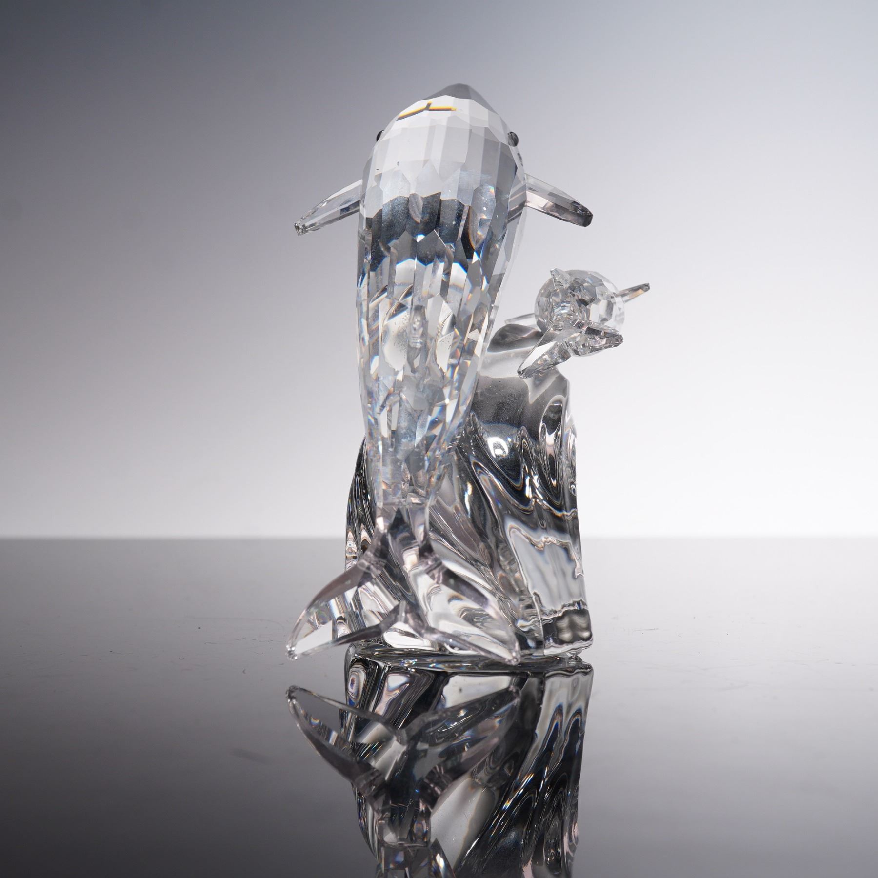 This Swarovski crystal Whales figurine was introduced in 1992 as the final piece in the Mother and Child trilogy. The trilogy is distinctive as it is the only Swarovski series designed entirely by one artist and the only trilogy composed solely of clear crystal without frosted components. The piece features a mother and baby whale, believed to be humpback whales, swimming atop a clear crystal wave. The base bears the Swarovski logo. Measures 4.25"H.