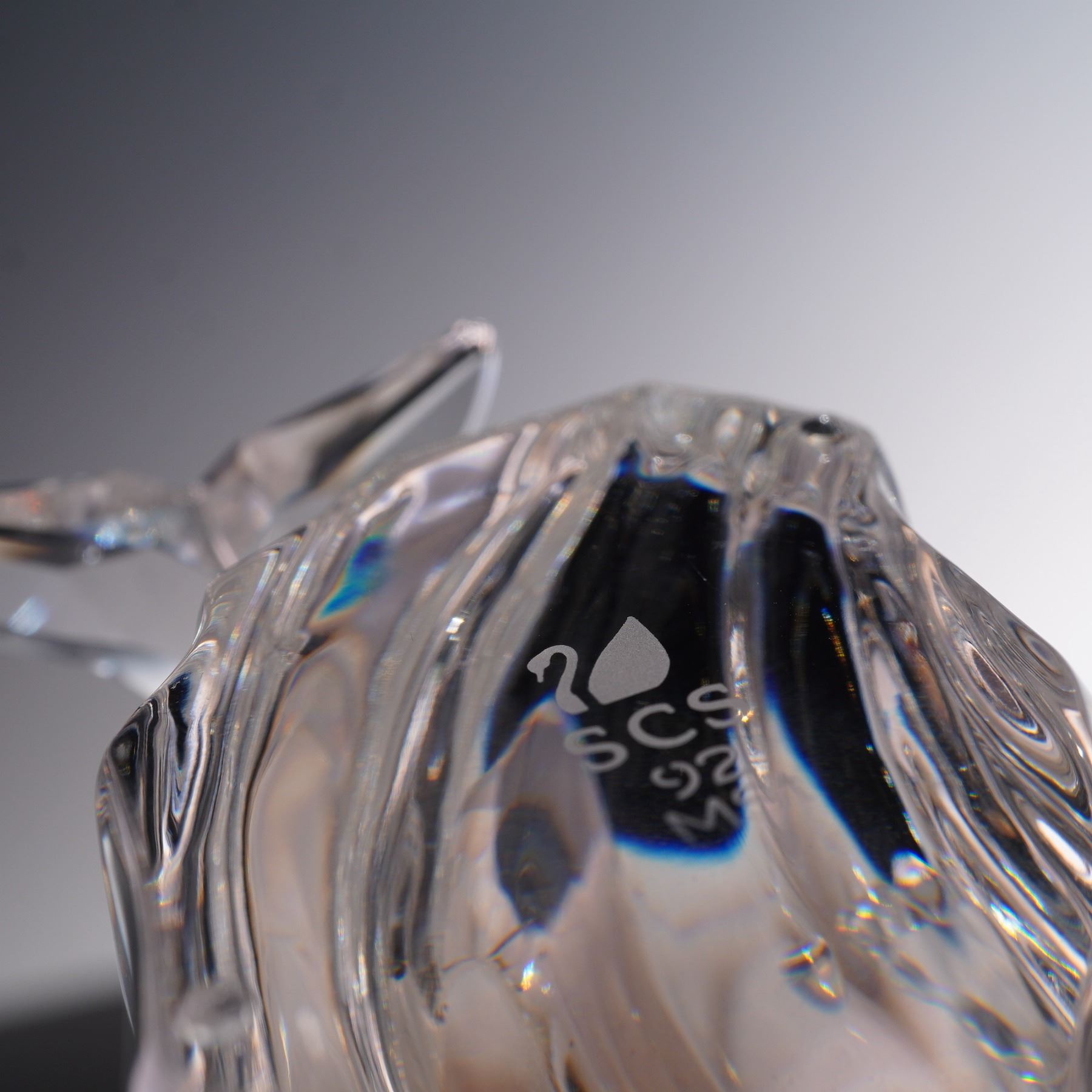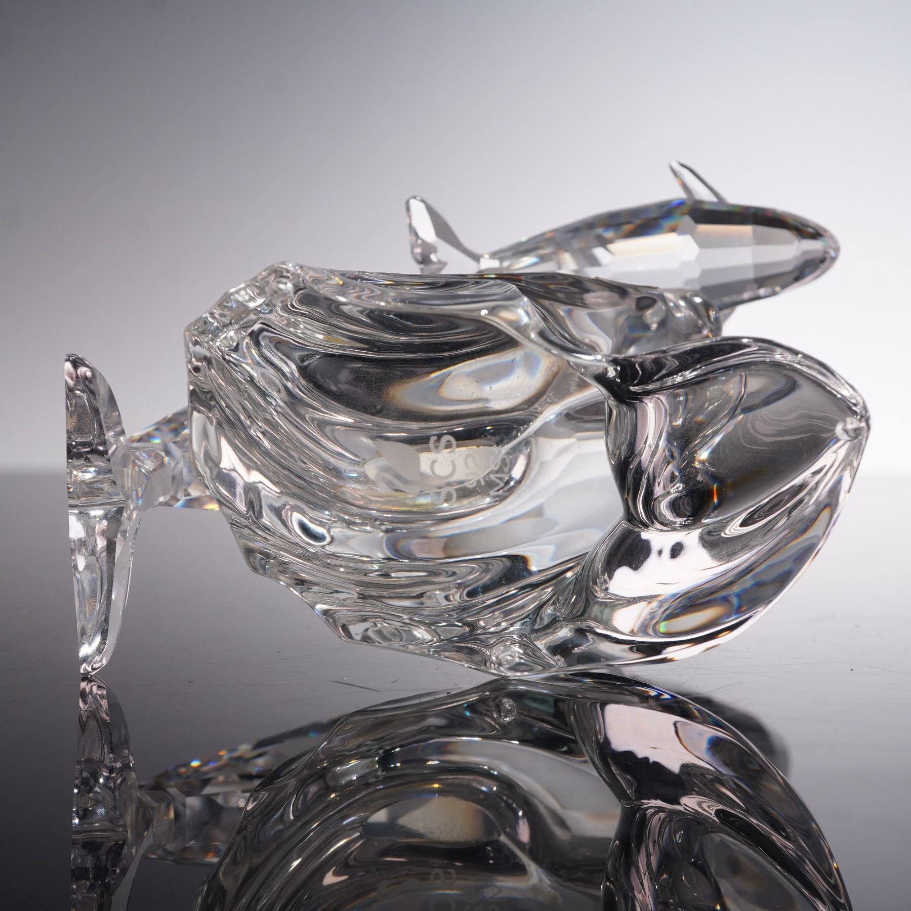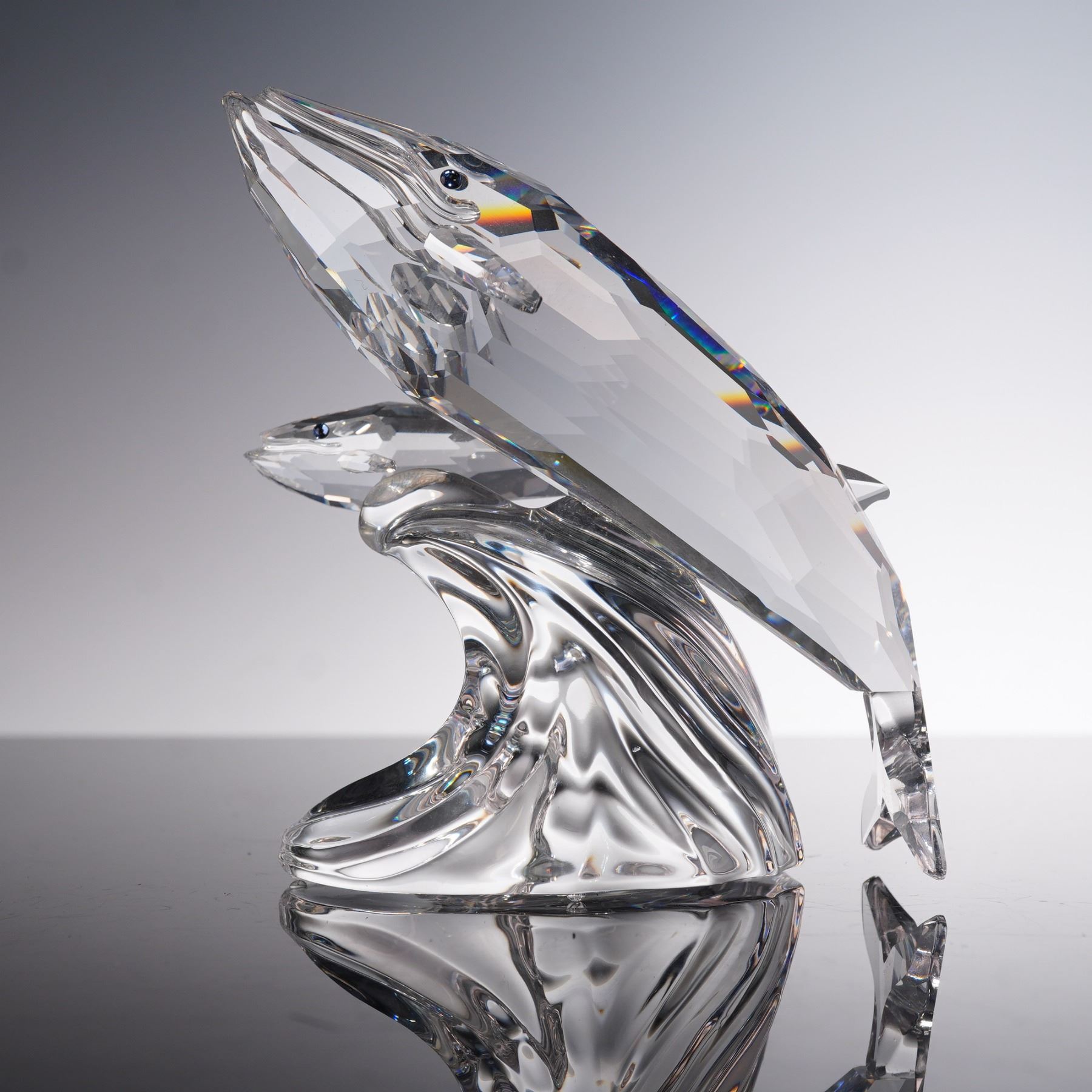 This Swarovski crystal Whales figurine was introduced in 1992 as the final piece in the Mother and Child trilogy. The trilogy is distinctive as it is the only Swarovski series designed entirely by one artist and the only trilogy composed solely of clear crystal without frosted components. The piece features a mother and baby whale, believed to be humpback whales, swimming atop a clear crystal wave. The base bears the Swarovski logo. Measures 4.25"H.