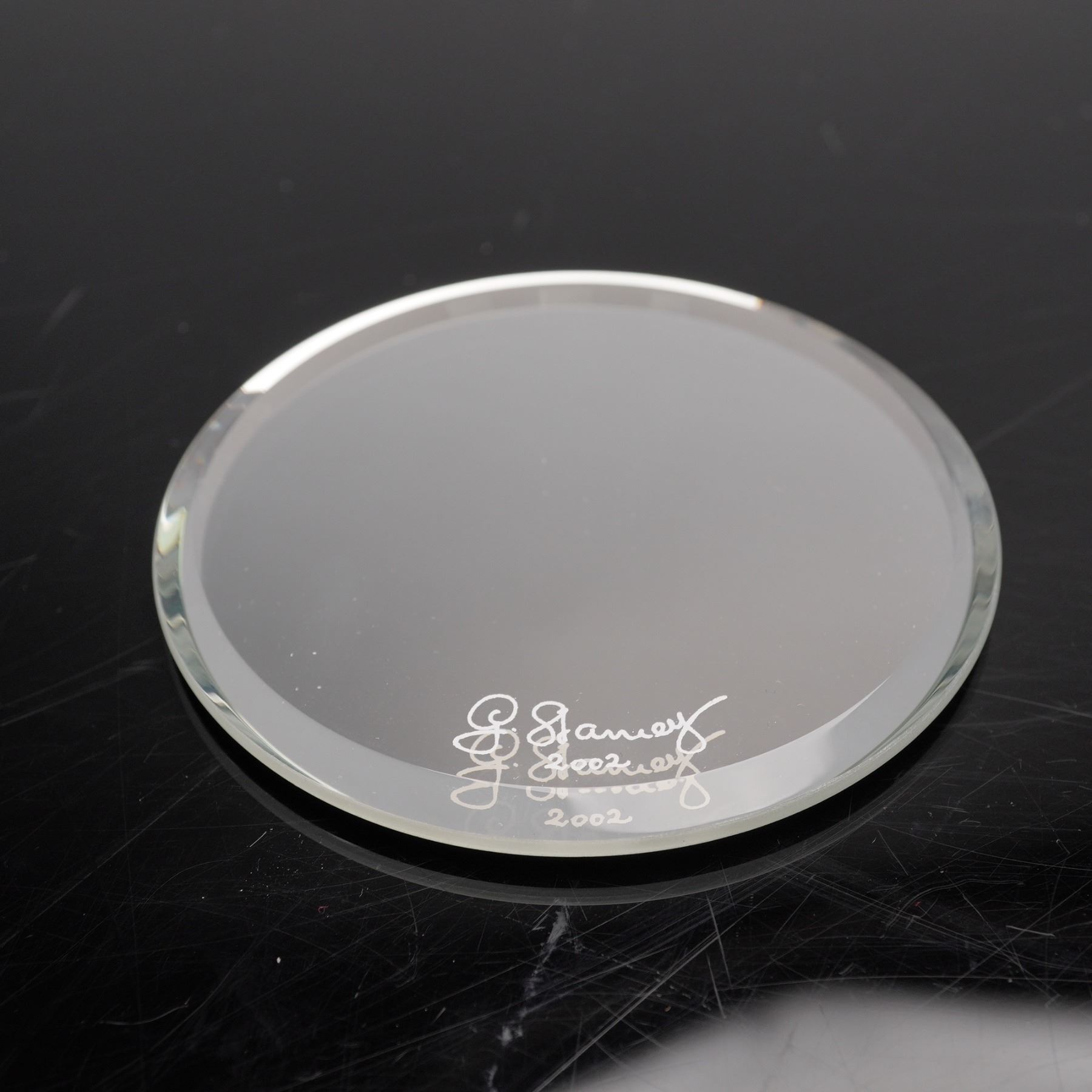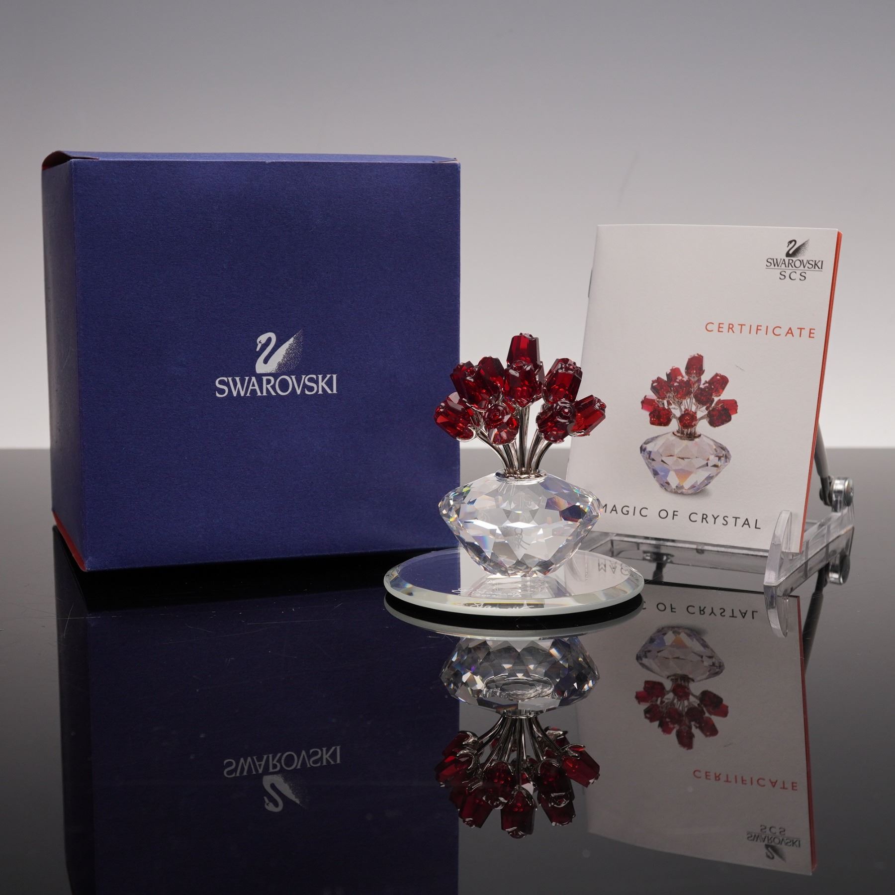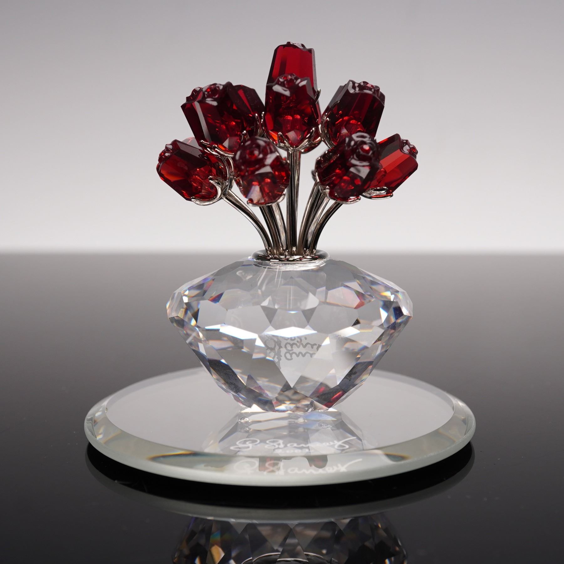 This vase of 15 red roses symbolizes love, passion, and celebration. Made with clear crystal and rhodium stems, this piece was made to celebrate the 15th anniversary of the SCS. Included is a clear display mirror featuring the designers signature. Swarovski backstamp. This item has its original box. Certificate of Authenticity included. Box measures: 4.5"L x 4.5"W x 4"H.