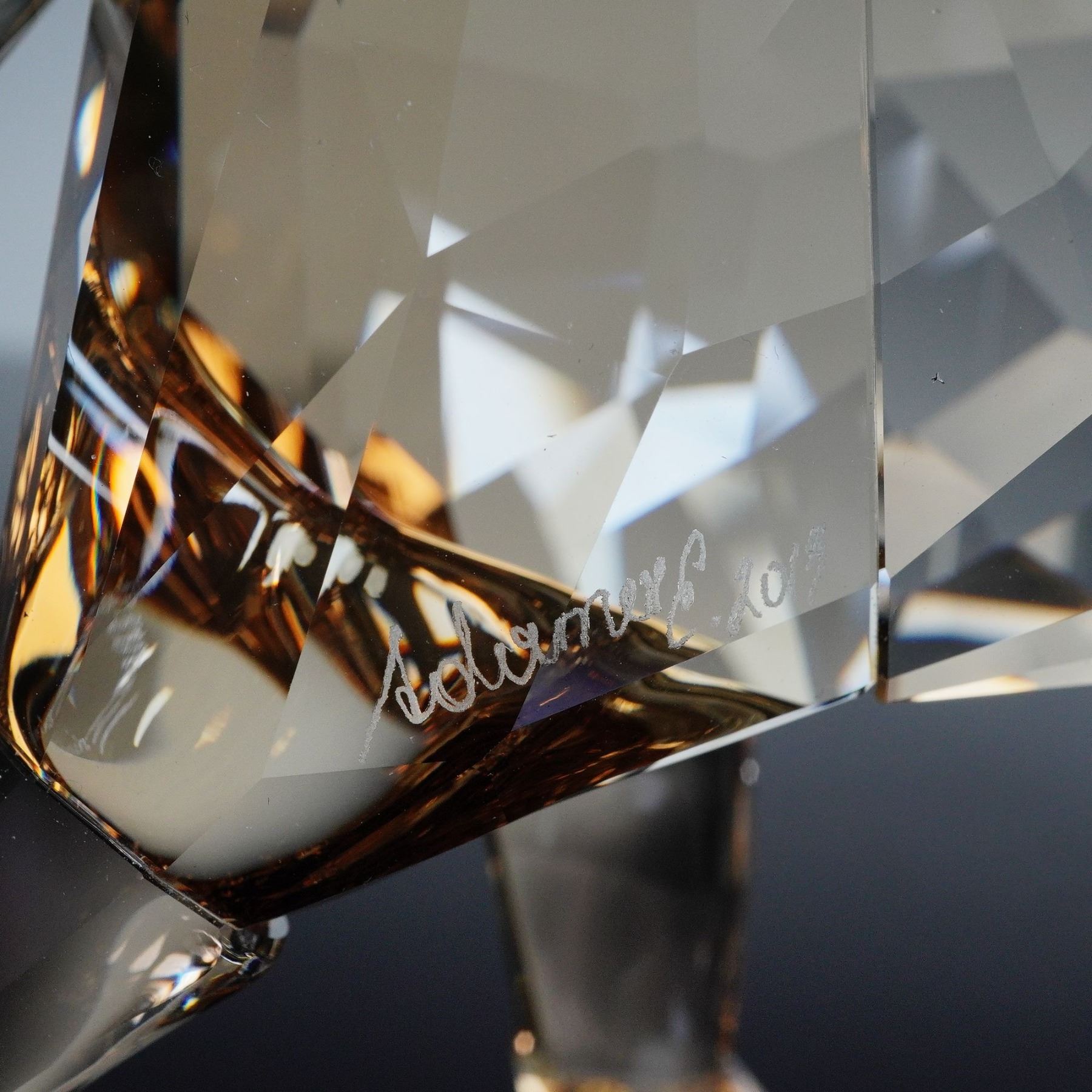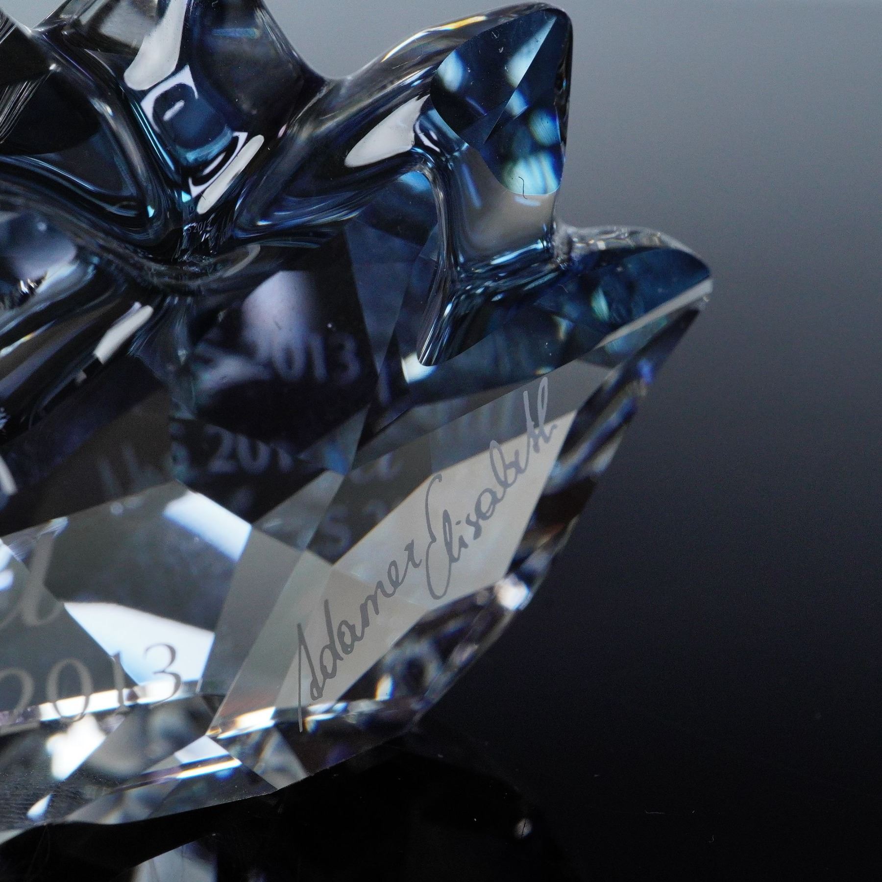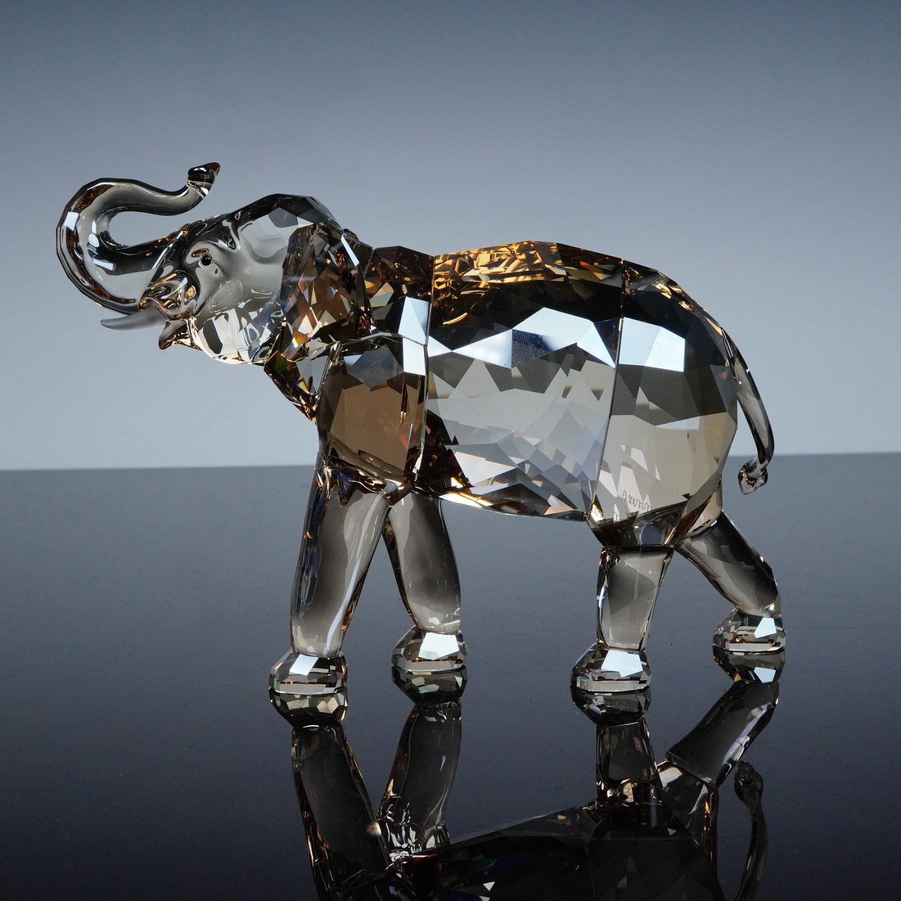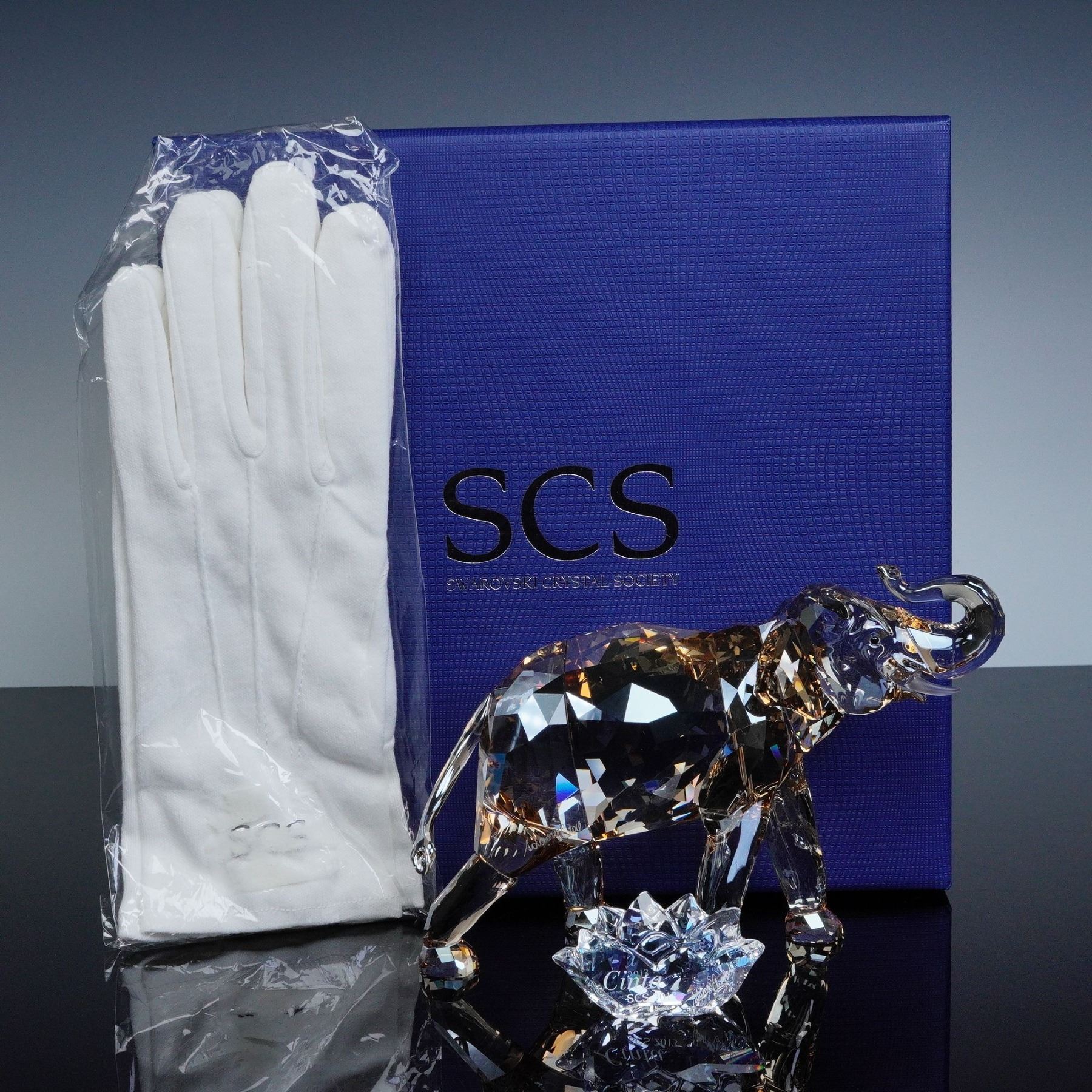 This elegant Swarovski crystal elephant shimmers in warm golden tones, its raised trunk symbolizing prosperity and good fortune. The figure captures lifelike movement with precise facets that reflect light in rich amber hues. Included is the matching crystal plaque engraved Cinta SCS 2013 along with the designers signature, completing a refined display of artistry and craftsmanship. Swarovski backstamp. This item has its original box. Box measures: 9.5"L x 9.5"W x 6.5"H.