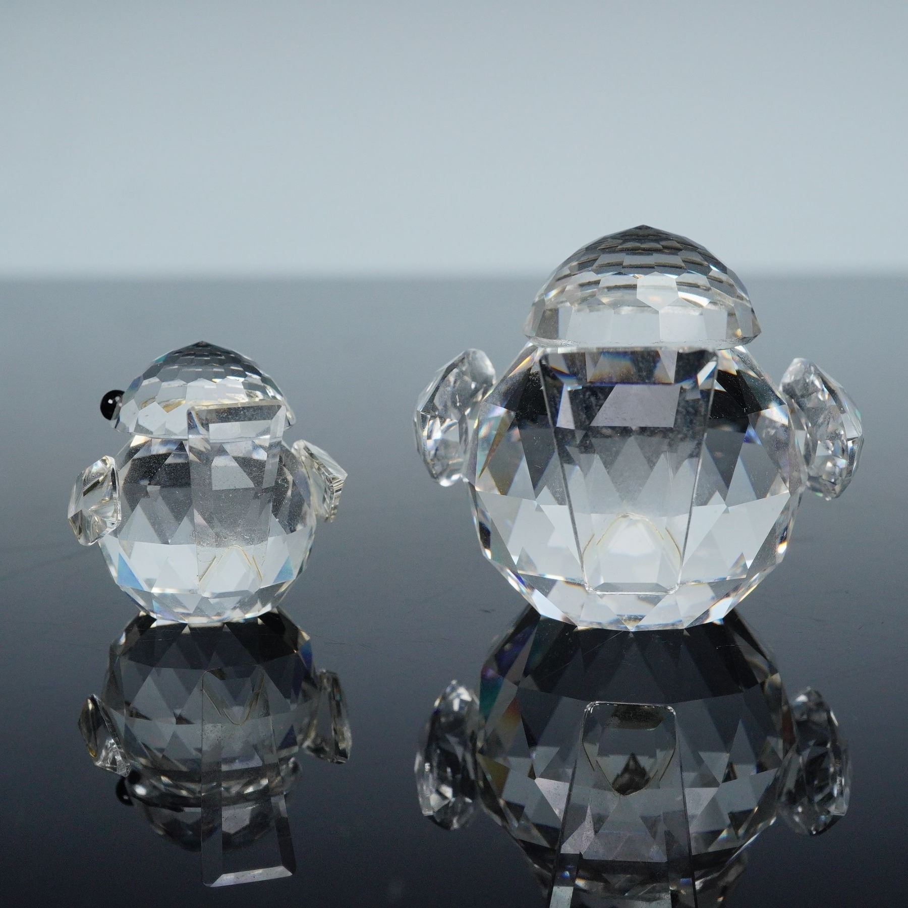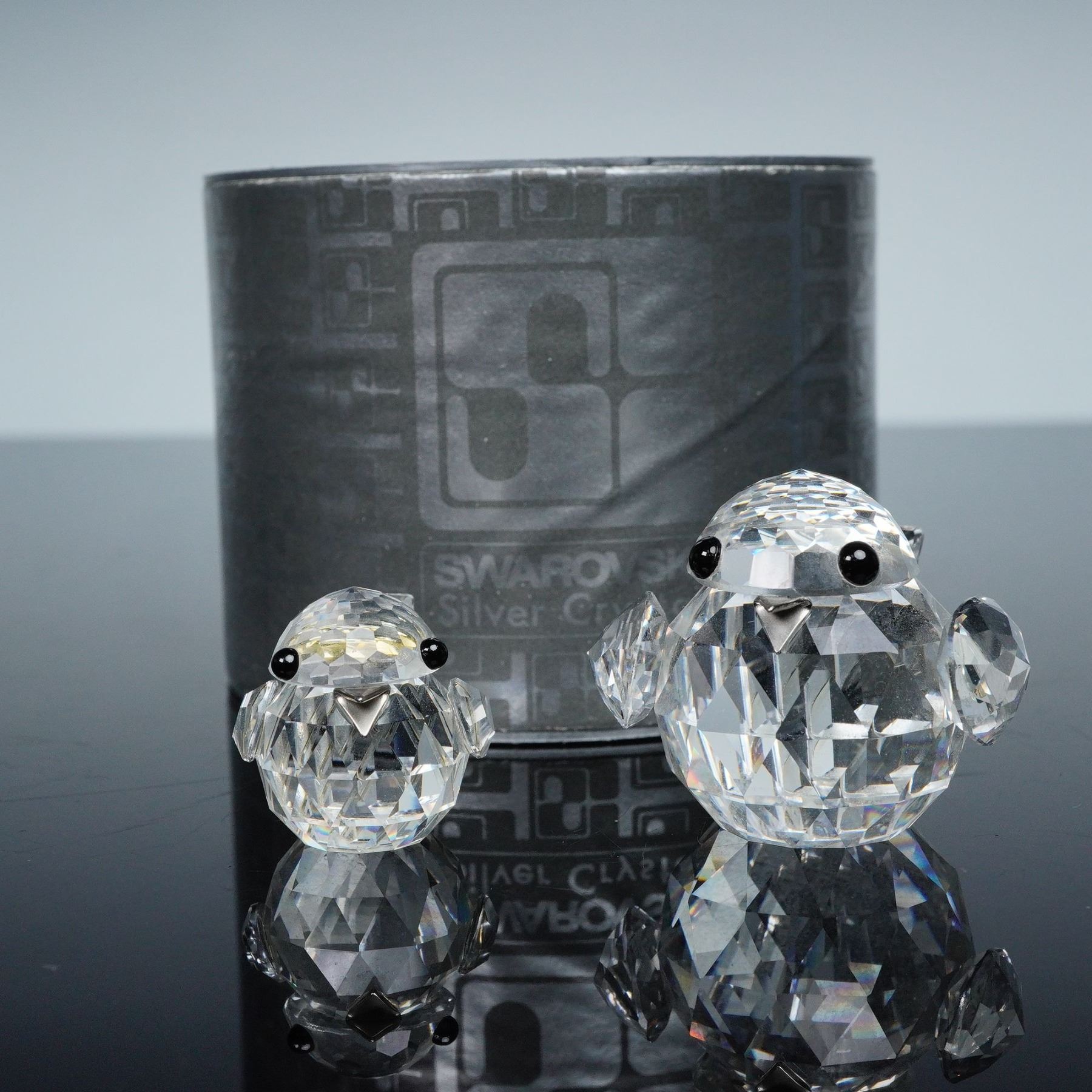 Charming pair of Swarovski Silver Crystal sparrows designed by Max Schreck, showcasing the timeless elegance and precision cutting that define Swarovski craftsmanship. Each bird is masterfully rendered in fully faceted clear crystal, with delicate round forms, finely cut wings, and expressive jet-black crystal eyes. The lot includes both the large and mini versions, each reflecting light with remarkable brilliance. These pieces bear the block SC mark with the swan logo and come with their original gray patterned Swarovski presentation box. A lovely duet that embodies the grace and purity of Swarovski's early naturalistic creations. 7650 032 000 & 010017.