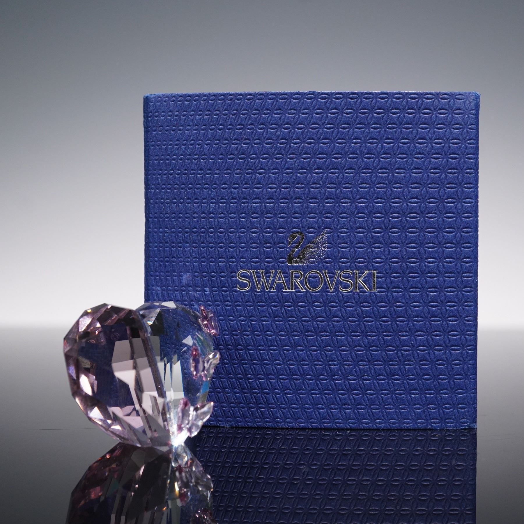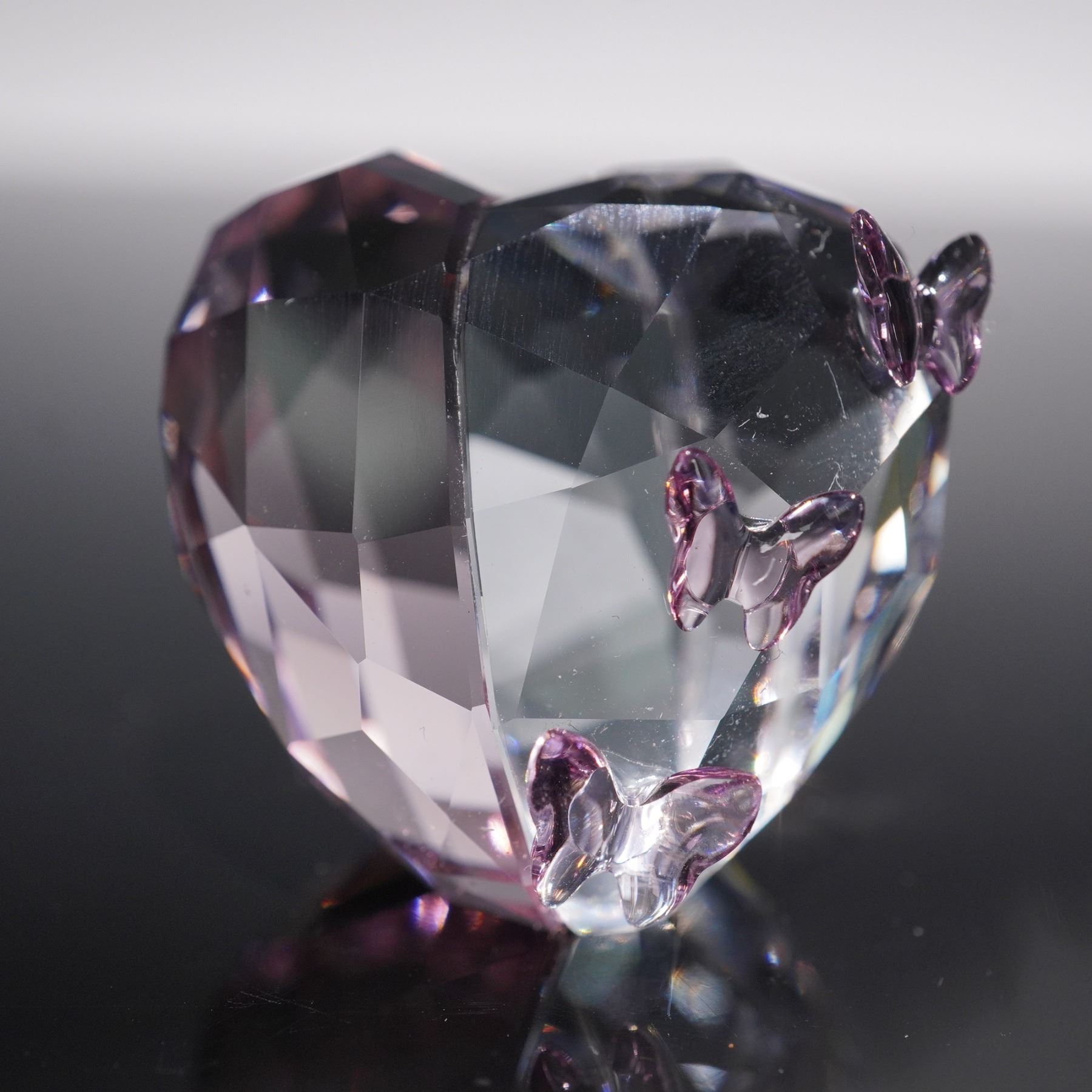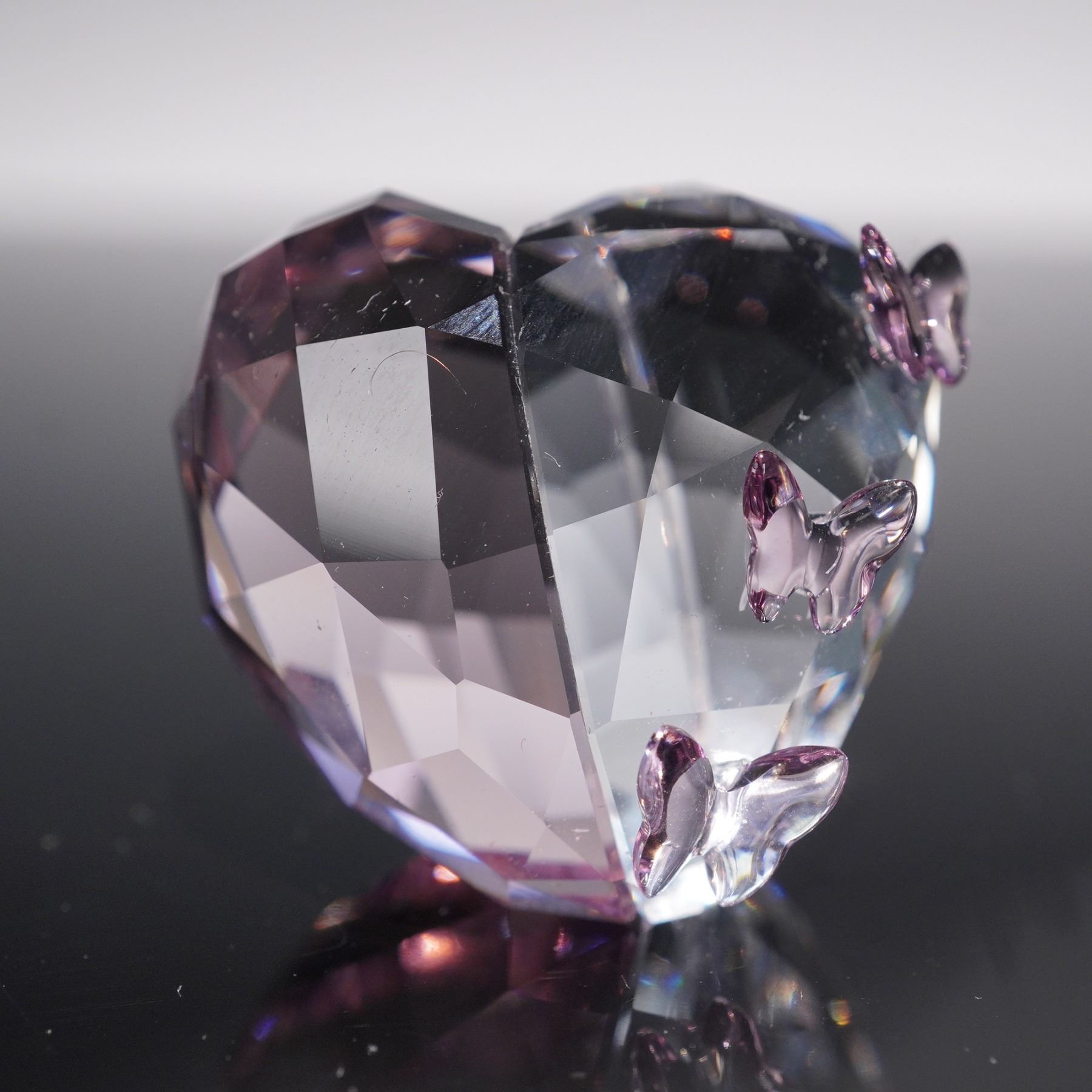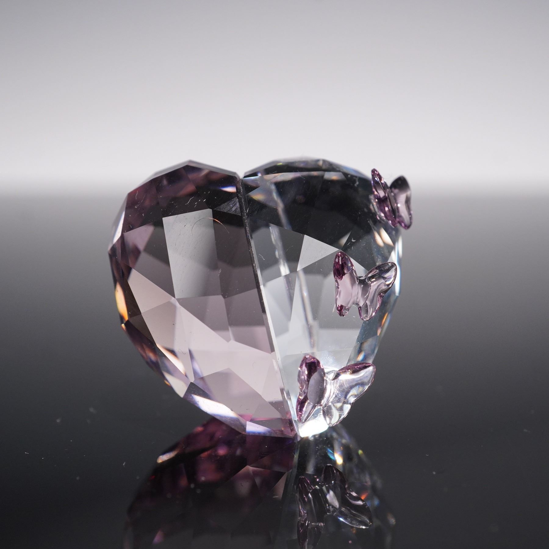 Features a finely faceted heart design accented with delicate purple crystal butterflies. Rendered in clear and amethyst-toned crystal, the piece reflects light with brilliant sparkle, highlighting Swarovski's signature craftsmanship. Includes logo on base. This item has its original box. Box dimensions: 2.5"L x 2.5"W x 1.75"H.