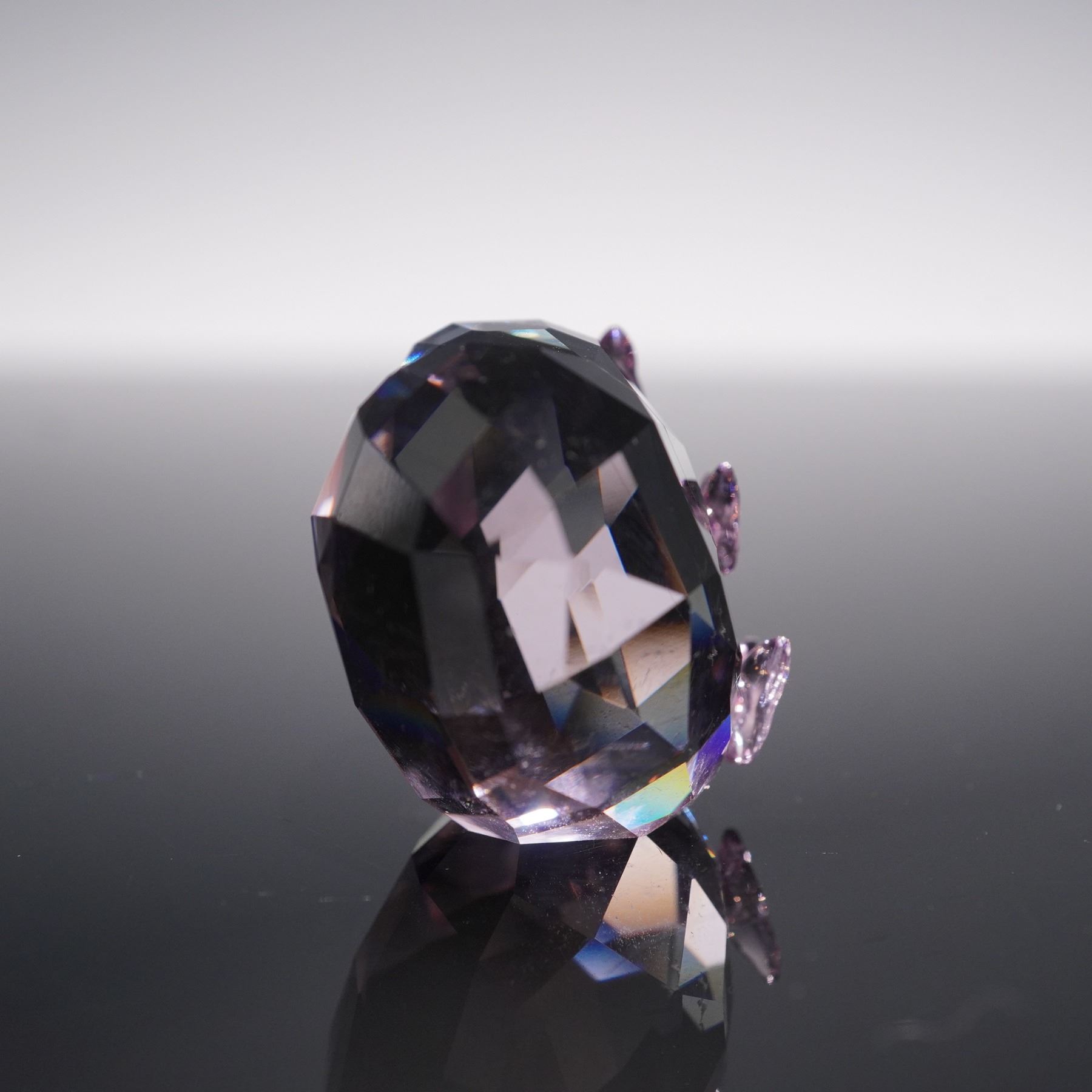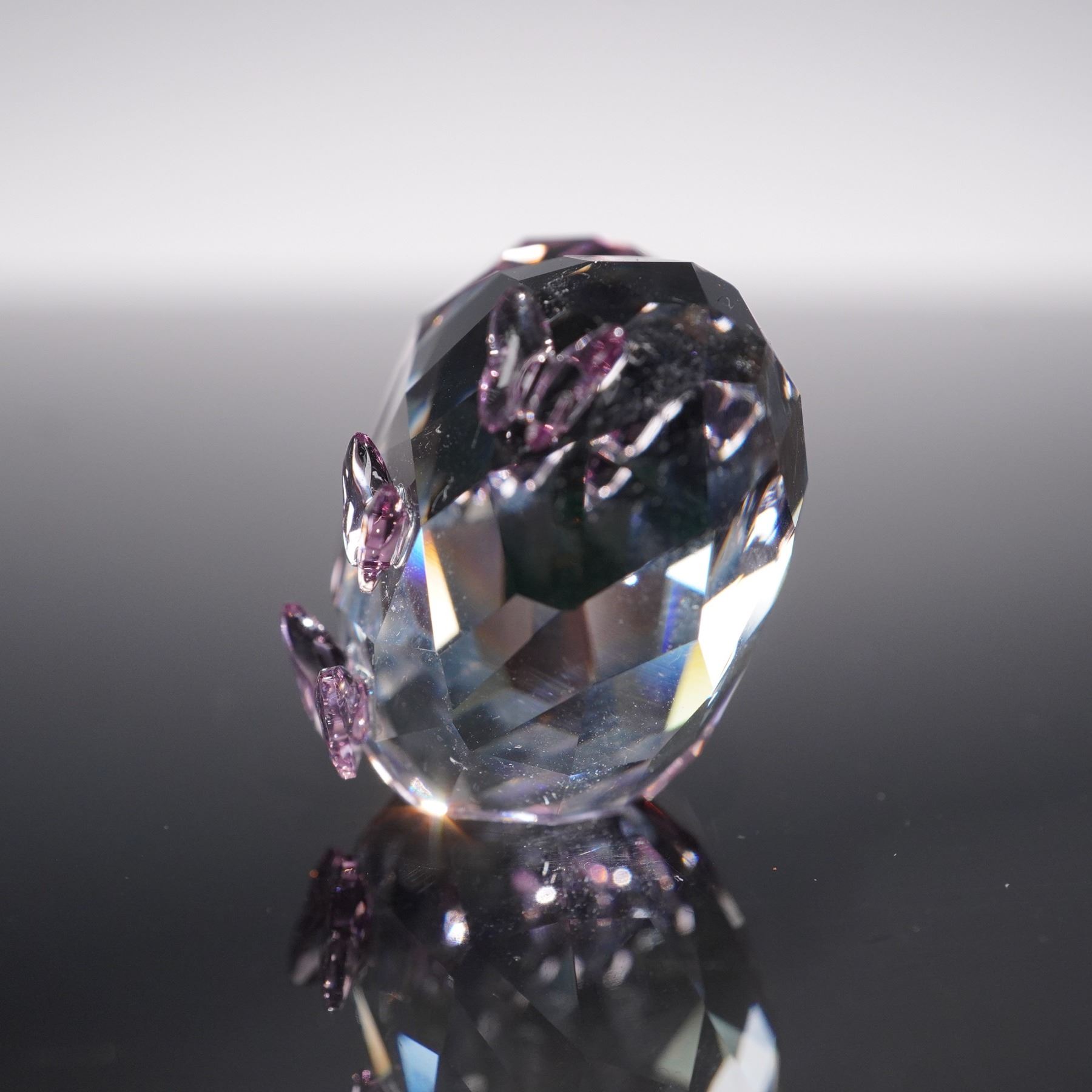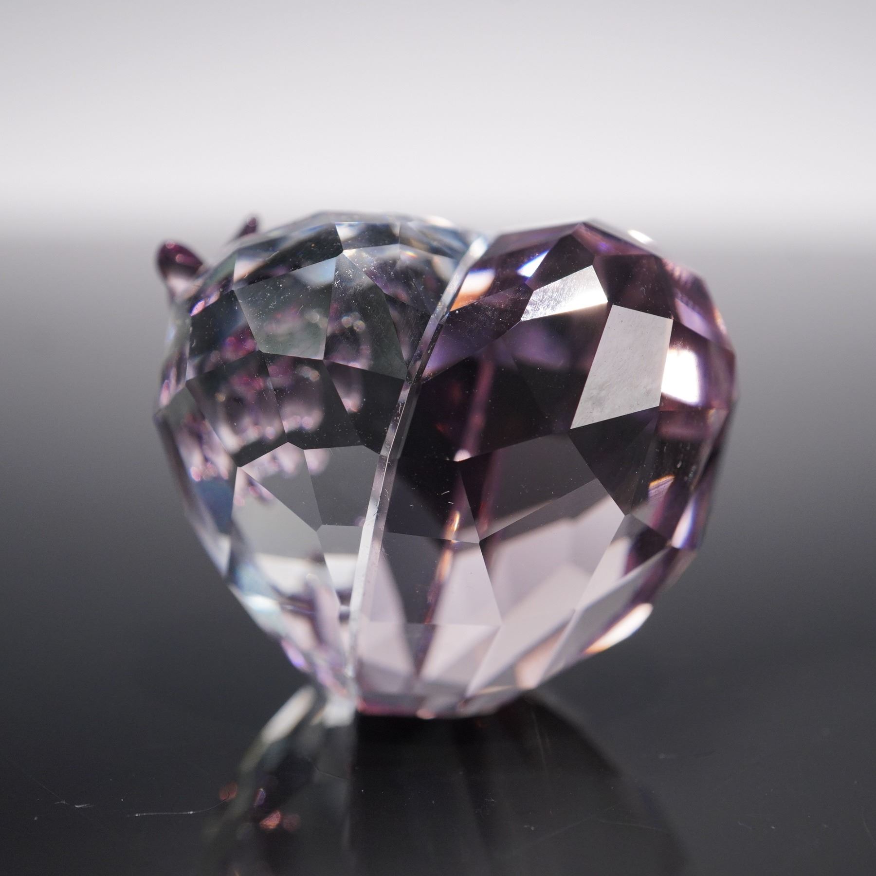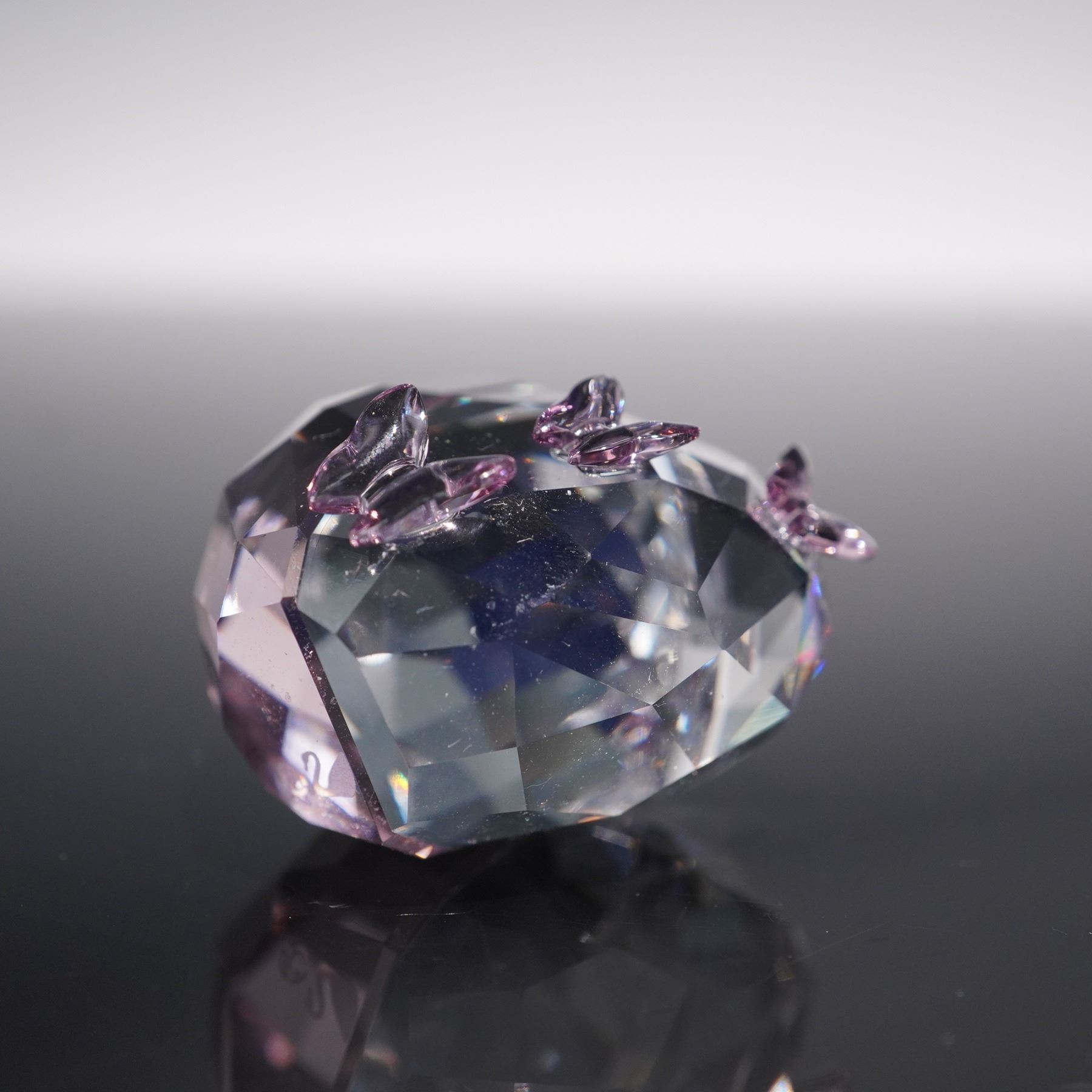 Features a finely faceted heart design accented with delicate purple crystal butterflies. Rendered in clear and amethyst-toned crystal, the piece reflects light with brilliant sparkle, highlighting Swarovski's signature craftsmanship. Includes logo on base. This item has its original box. Box dimensions: 2.5"L x 2.5"W x 1.75"H.