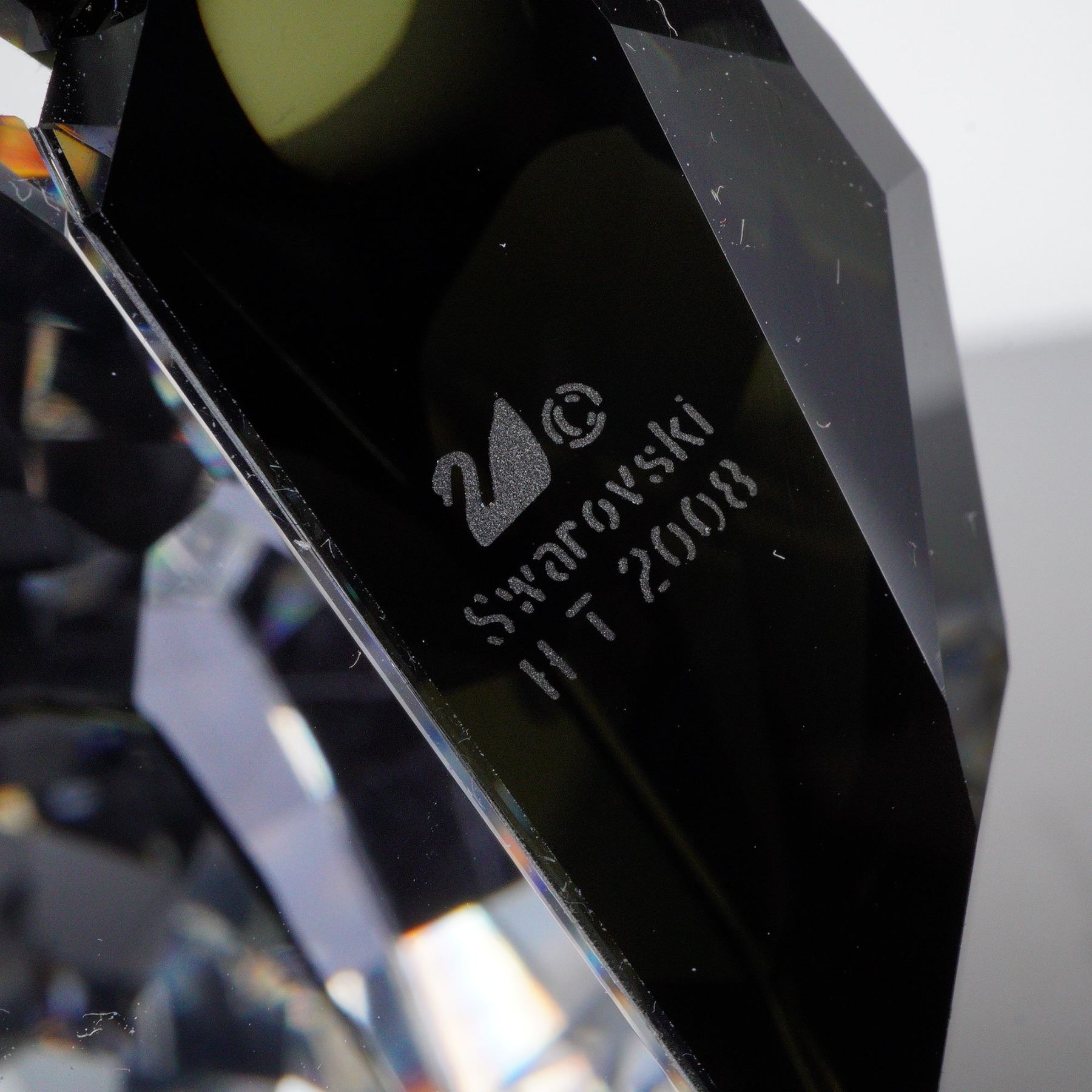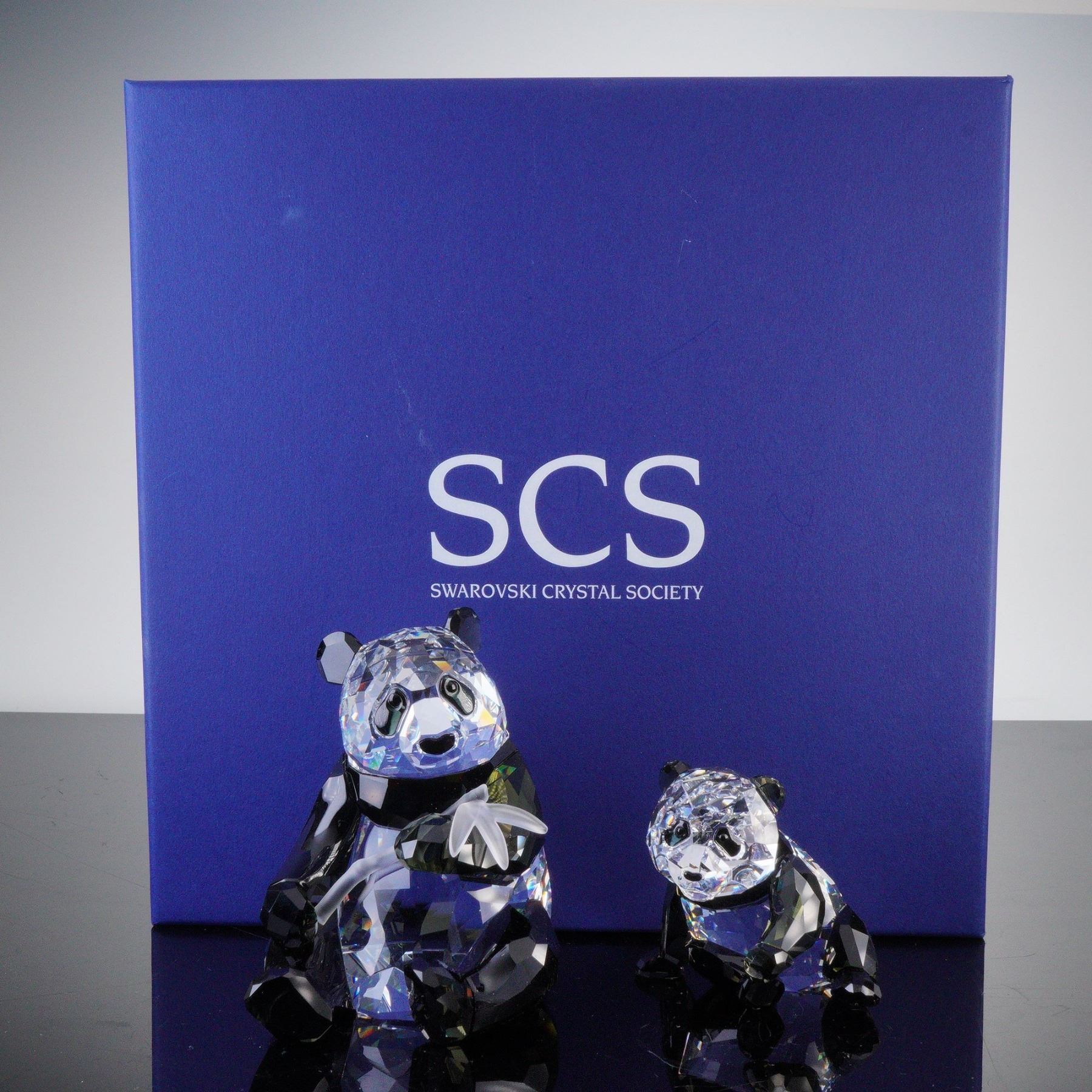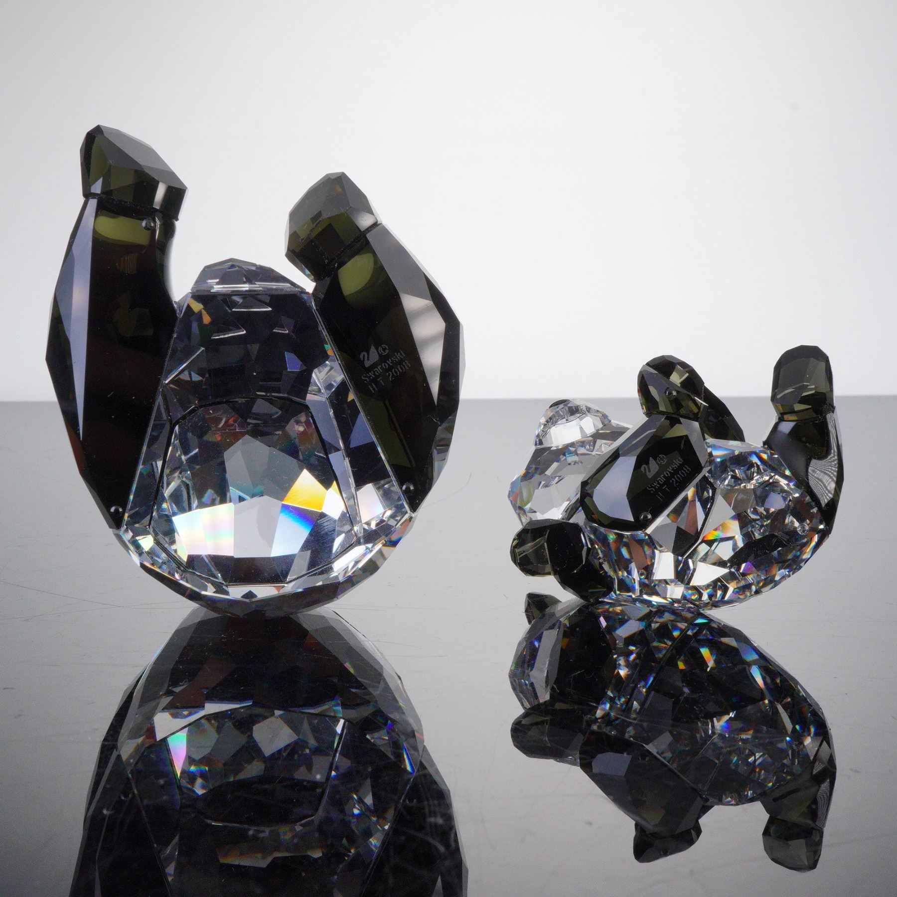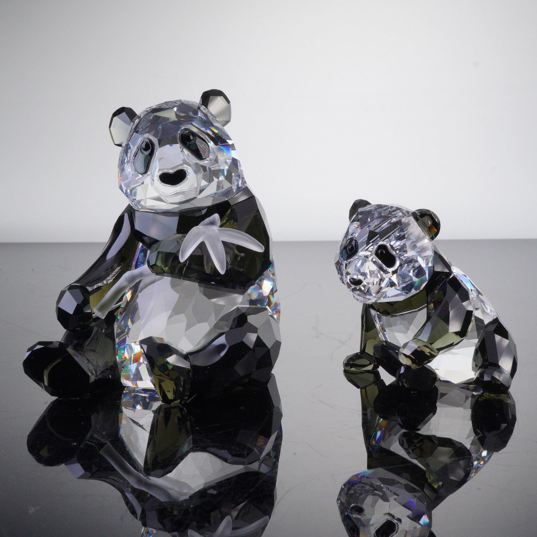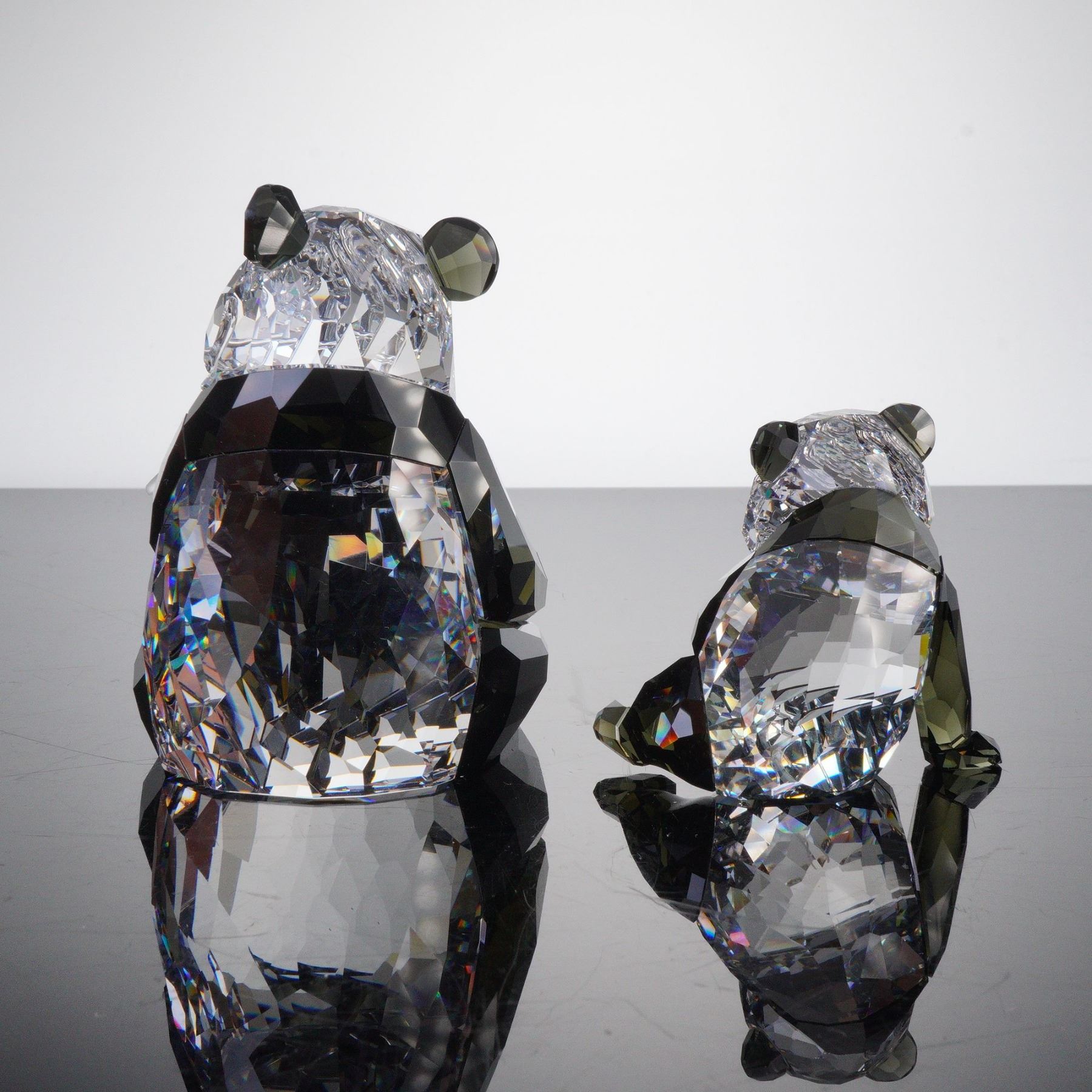 Introduced for the 2008 SCS Annual Edition, this two-piece set features the mother panda seated with a frosted crystal bamboo shoot and the companion cub positioned beside her. Each piece is produced in clear and black faceted crystal with polished surfaces and dark crystal accents forming the characteristic markings. Both figures carry the Swarovski swan hallmark and 2008 date. The set is accompanied by its original SCS box. Model 900918.