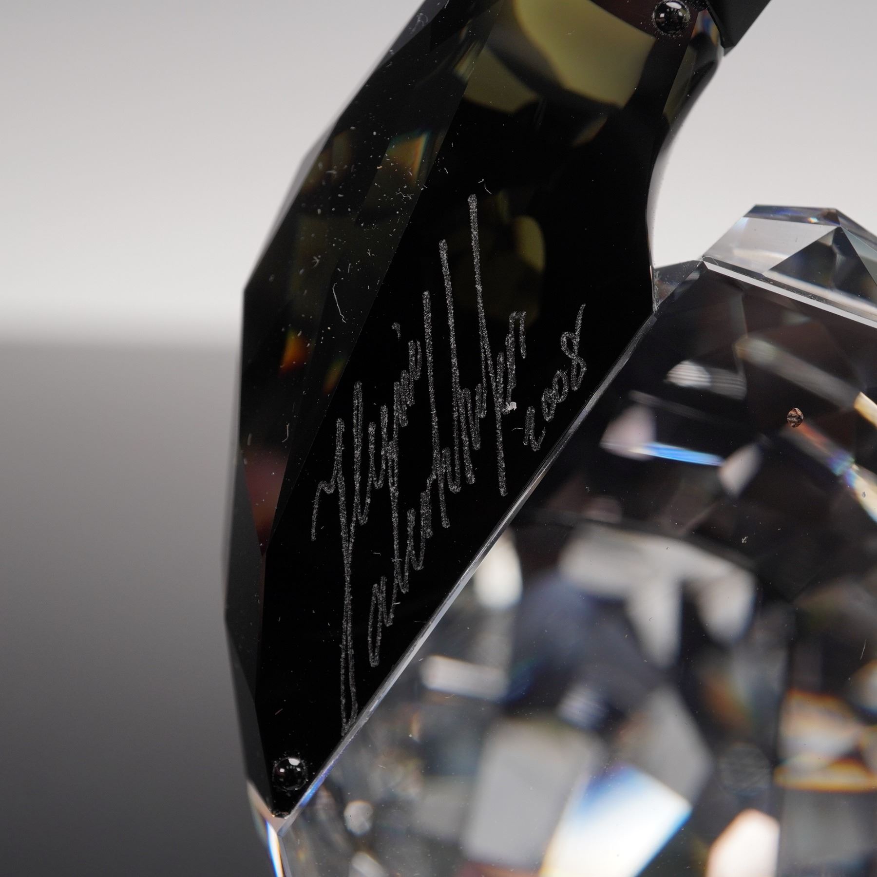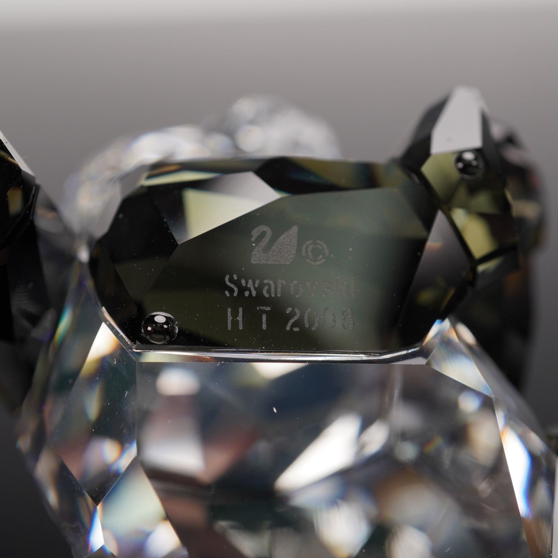 Charming Swarovski Crystal Society (SCS) figurine set titled "Panda Mother with Baby", designed by Edith Mair in 2008 for the Endangered Wildlife series. Both pandas are crafted in clear and black crystal, capturing the endearing pose of a seated mother holding a bamboo leaf beside her cub. Each piece is finely faceted to maximize light reflection and sparkle. The mother bear is etched with the artist's signature and dated 2008, along with the Swarovski swan logo and model number HT 2008. This limited edition SCS release includes the original box, certificate of authenticity, and outer sleeve, making it a complete and collectible presentation for Swarovski enthusiasts. 5063690.