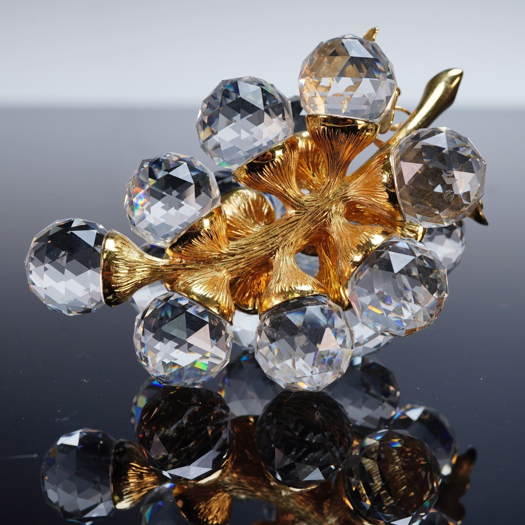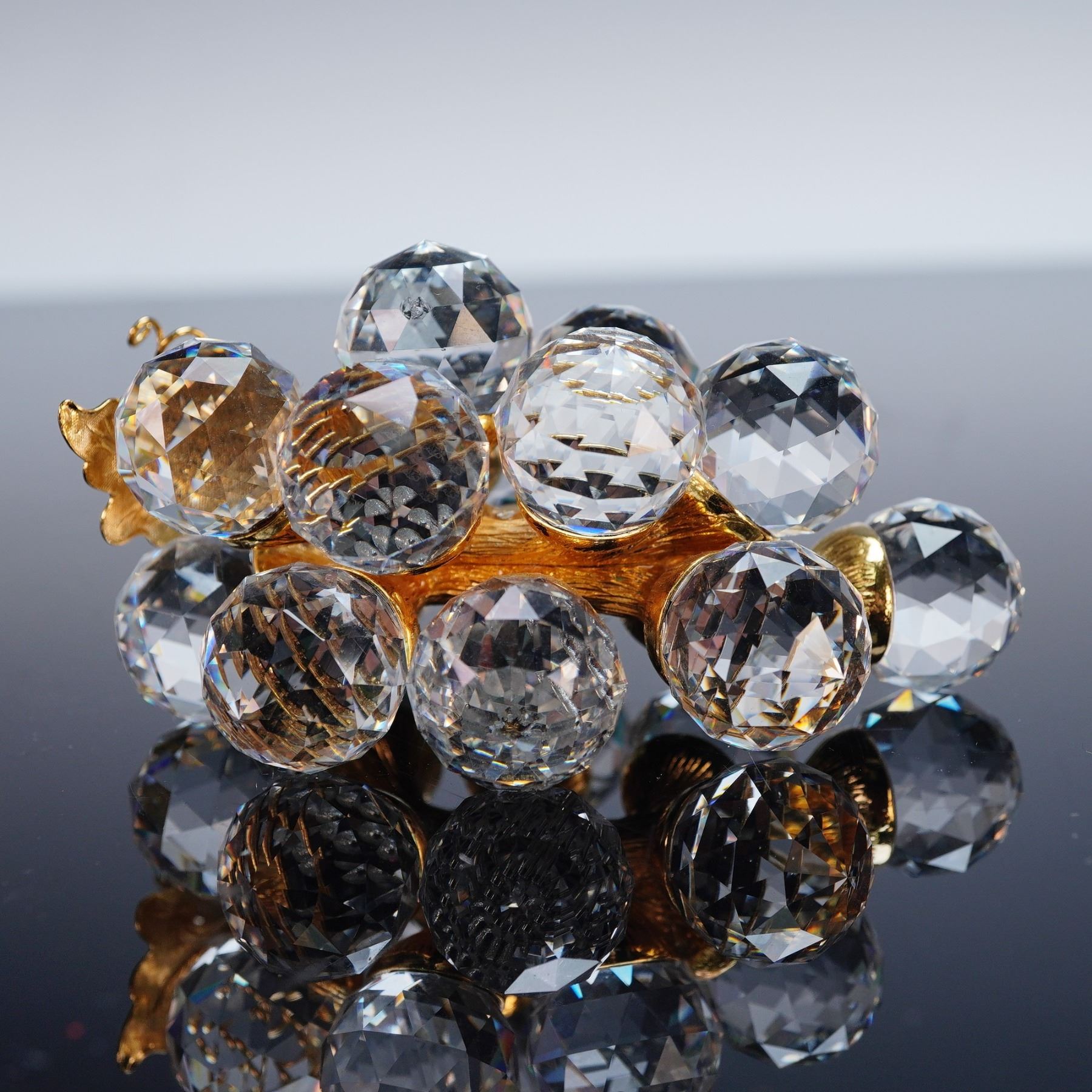 Elegant Swarovski crystal grapes cluster figurine featuring ten faceted clear crystal grape spheres set on a gold-tone metal stem with detailed leaf and tendril accents. The intricate craftsmanship highlights the brilliance of the precision-cut crystals, creating dazzling light refractions. Ideal as a decorative collectible or gift, this piece reflects Swarovski's signature luxury and timeless design. Marked with Swarovski's signature swan logo on the metal leaf. Measures 4"L.